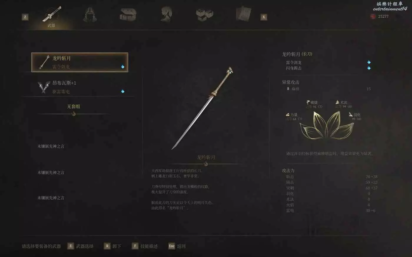 來看龍吟斬月,這也是我遇到的第一朵烏雲(例外),很可惜,是麻痹增益而不是昂布瓦斯同款雷電增益,然後在一眾24的異常增益武器裡,龍吟斬月是唯一一個直接讓麻痹值變成42的,嚴重懷疑是bug。不過考慮到麻痹是最幽默的異常效果,好像也可以理解。