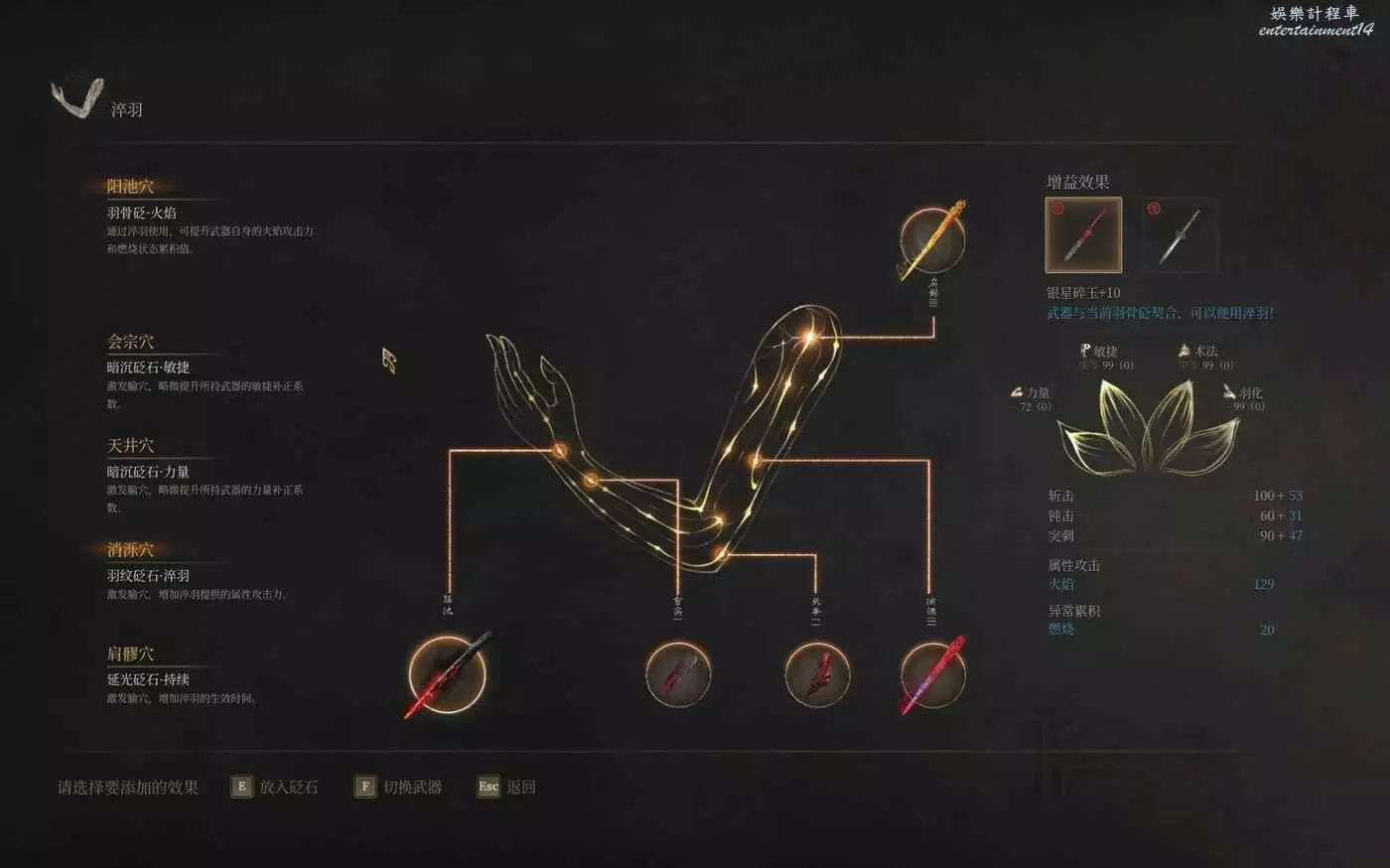 其中火焰、雷電、術法淬羽屬性傷害受術法加點影響,羽化淬羽受羽化加點影響。