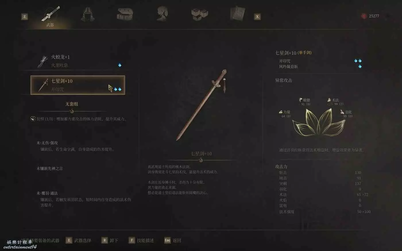 我們再通過七星劍驗證一下,由於七星劍補正更低,減去自身面板,+0為138,+10為150,大於一般武器的129,小於術法補正更高的銀星碎玉。完美符合我們的假設。
