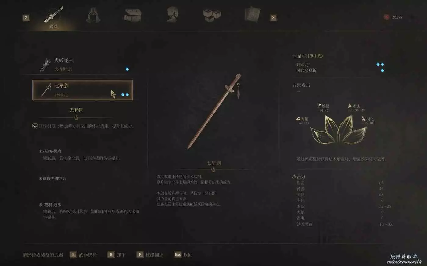 那麼首先,圖一二證明術法砭石會提高補正來同時提升武器本身的面板和淬羽的額外傷害(面板提升4點,總傷提高6點,所以證明術法砭石對淬羽也生效),這也近一步證明了“淬羽可以吃到武器對應屬性補正”的觀點。不過從圖三可以看出,如果你的武器本身沒有對應屬性補正,那砭石也不會有作用。推測原因是淬羽吃的是武器對應“屬性傷害”的補正,而不是對應“屬性點”的補正。