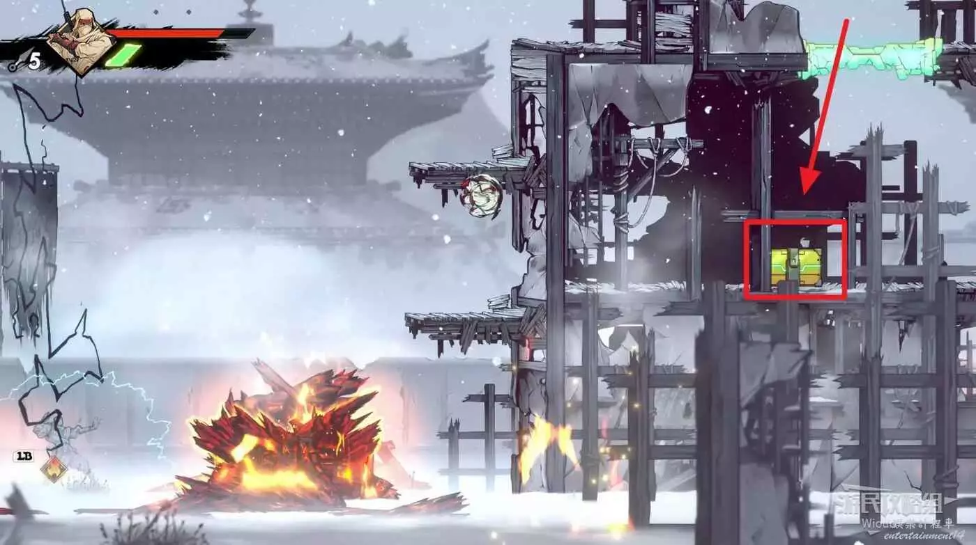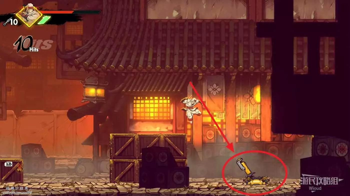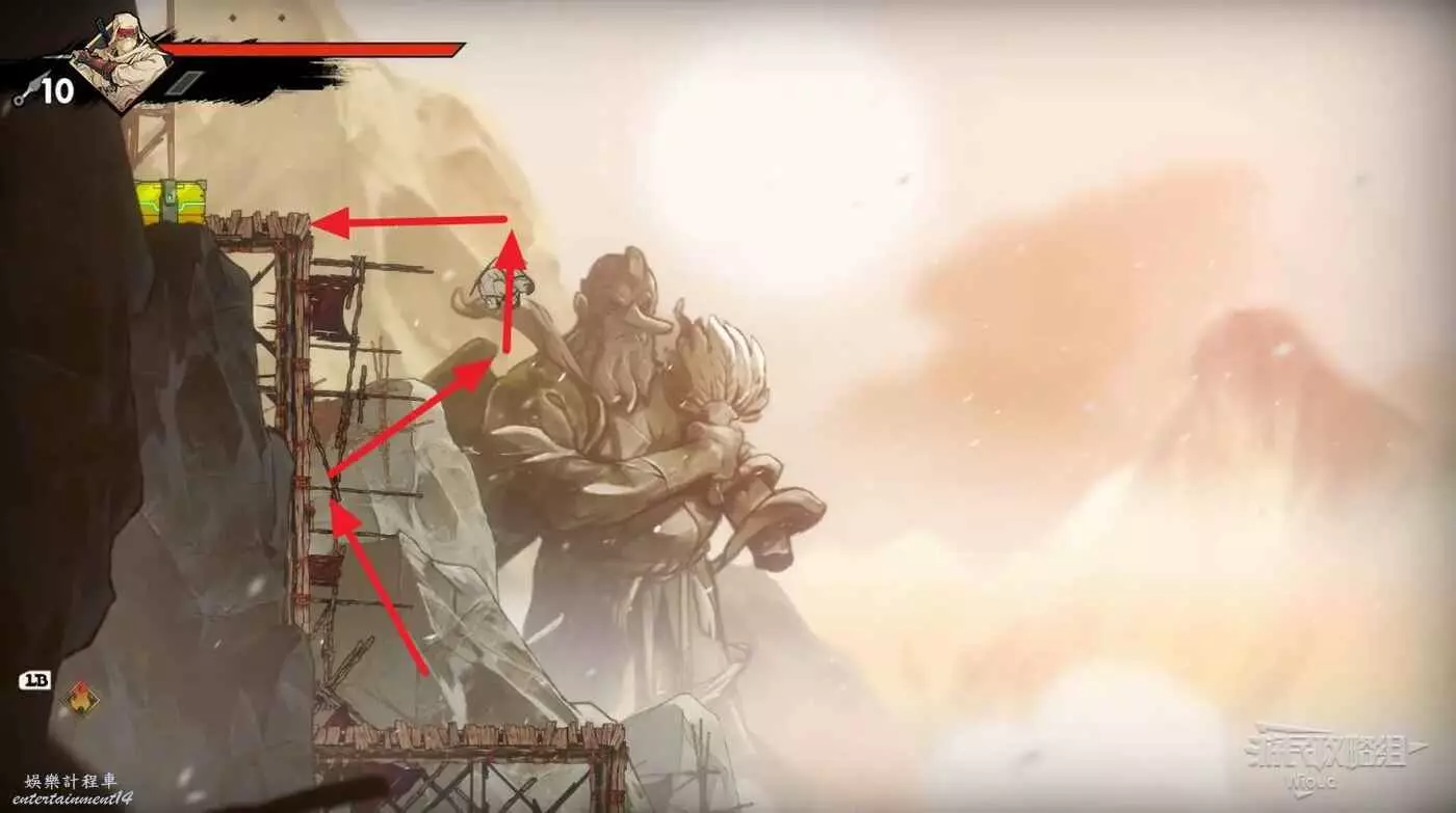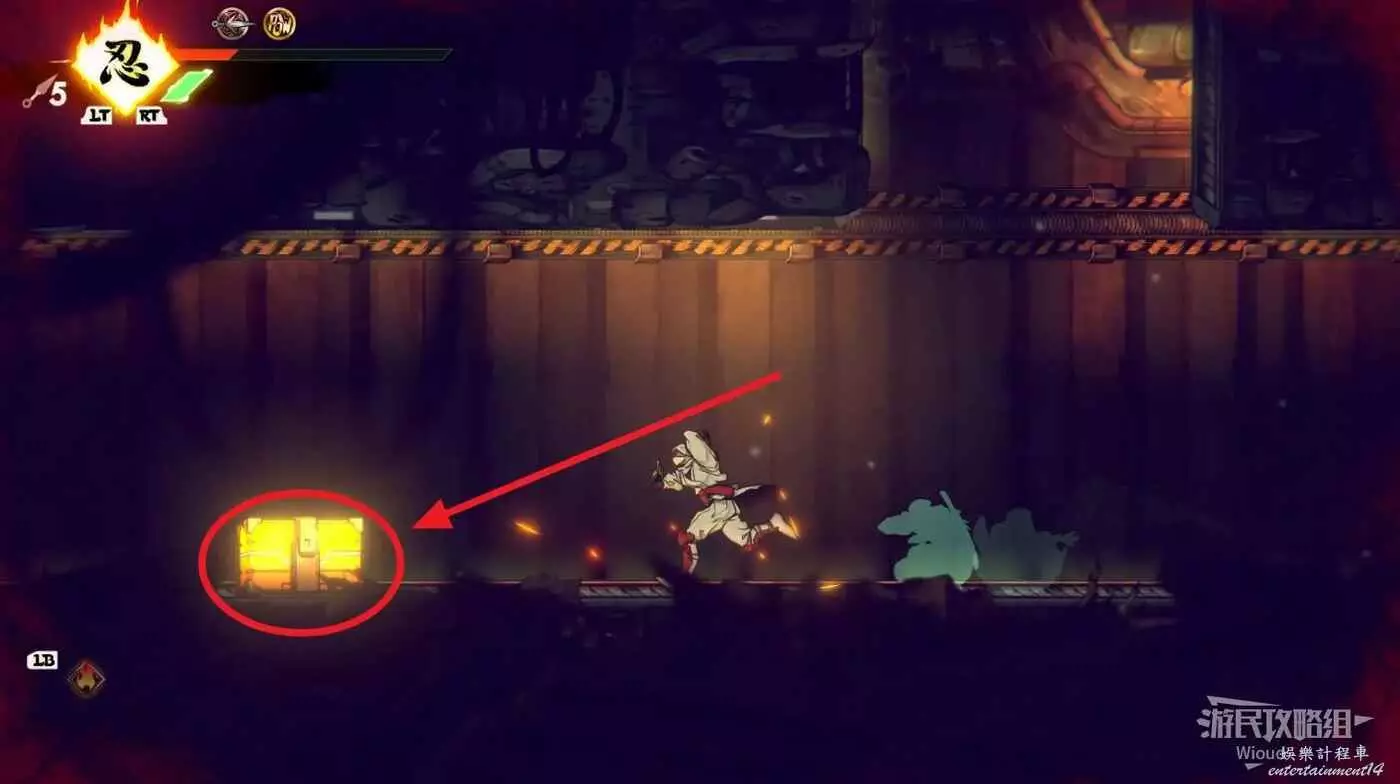 回去啟動石碑並往上走,擊敗藍色燈籠右側扔斧頭的敵人,它的上方有一個寶箱,通過兩連跳可直接上去。