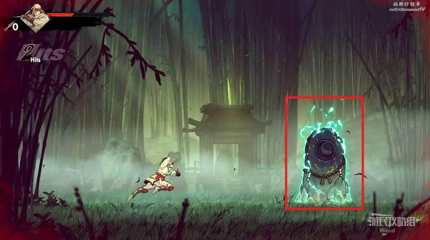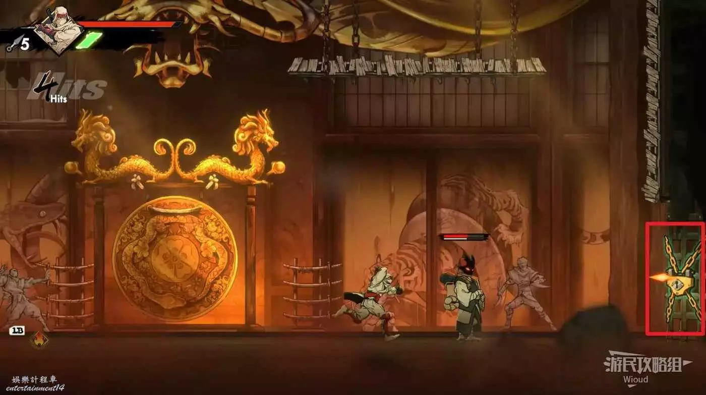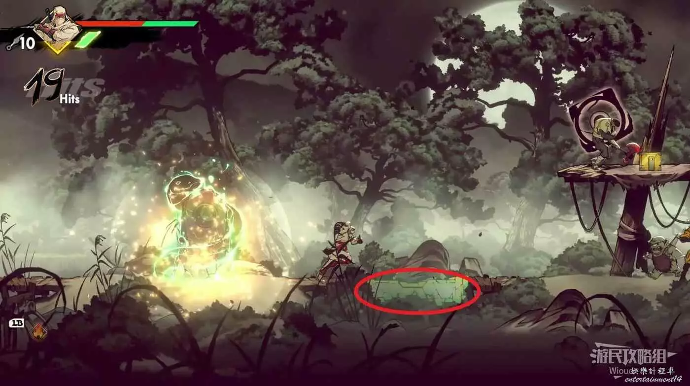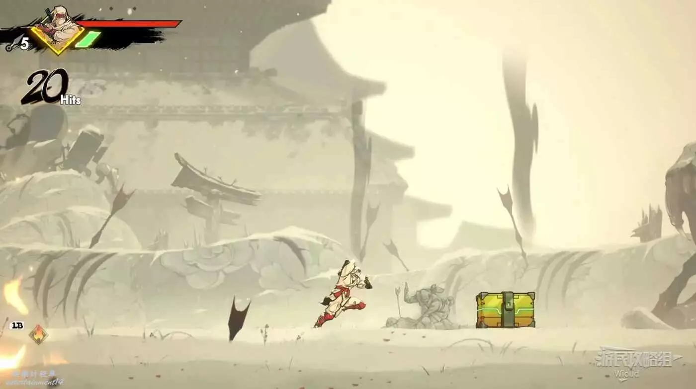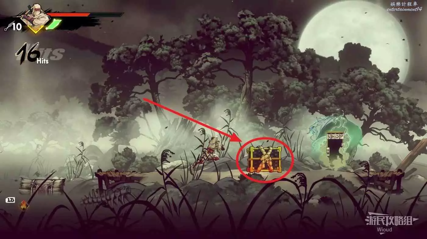 回去啟動石碑並往上走,擊敗藍色燈籠右側扔斧頭的敵人,它的上方有一個寶箱,通過兩連跳可直接上去。