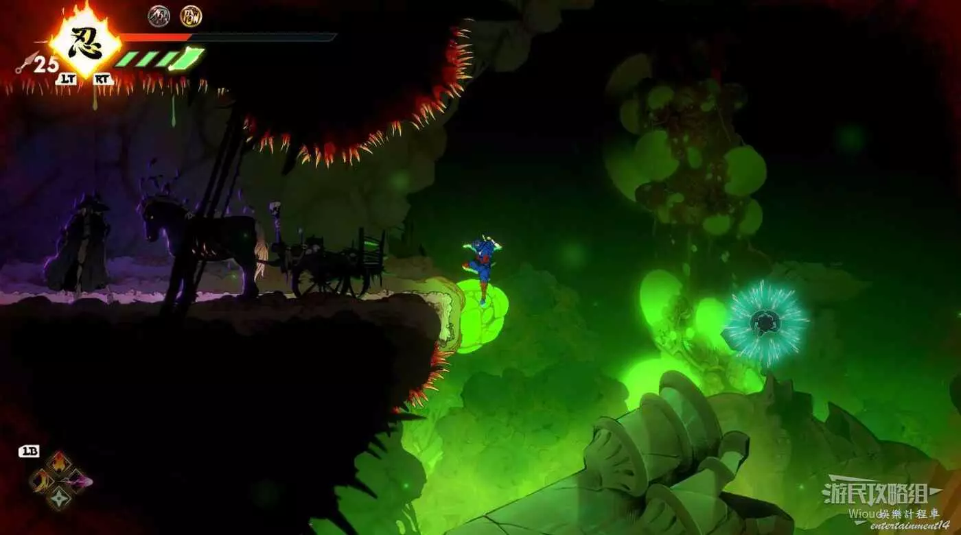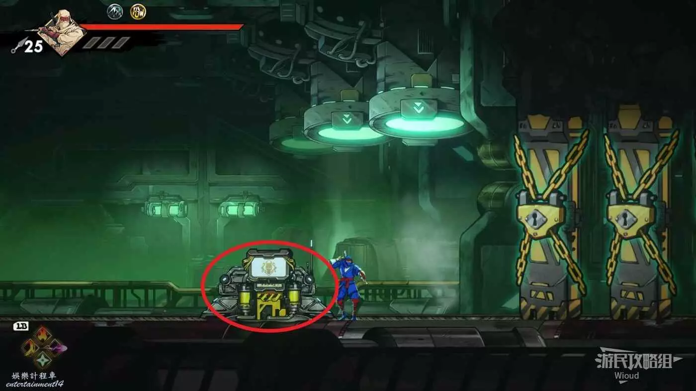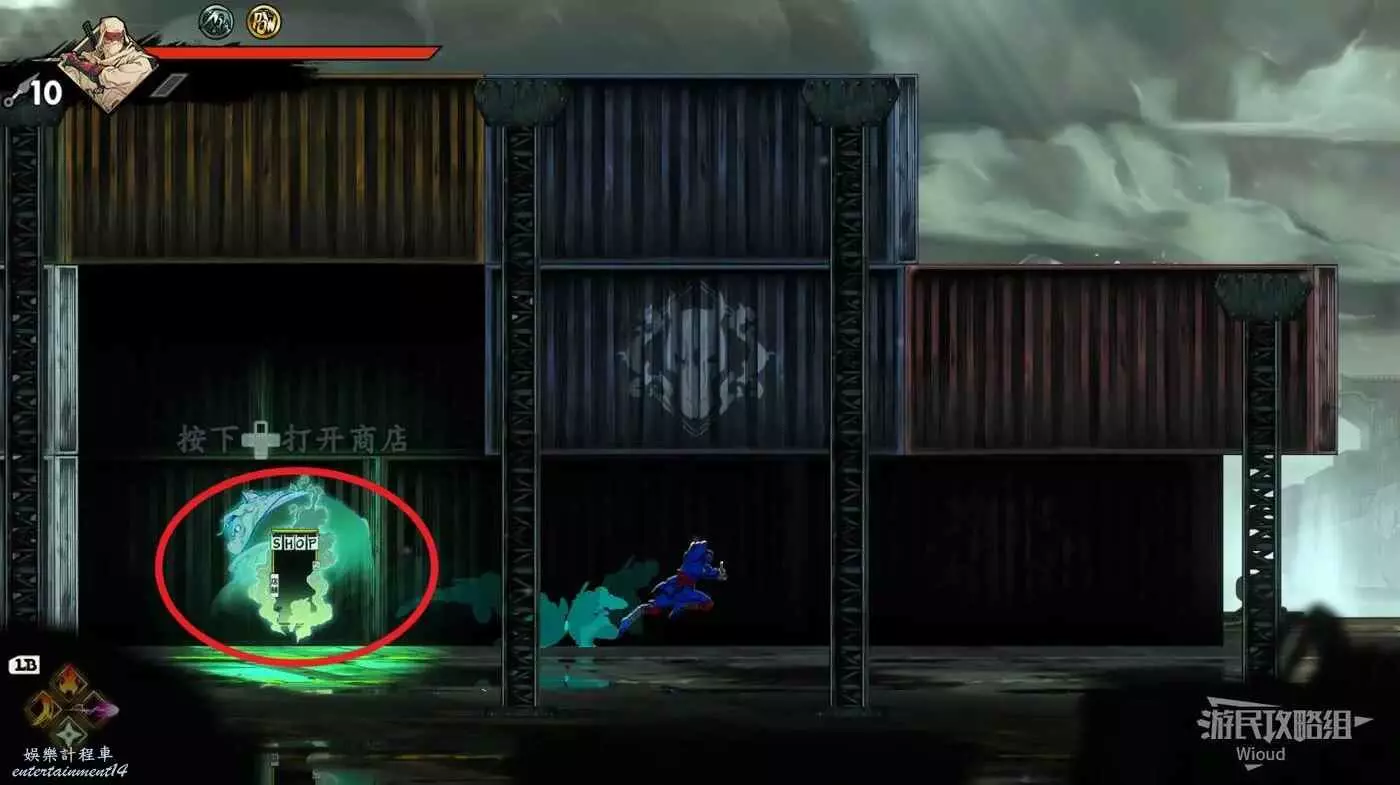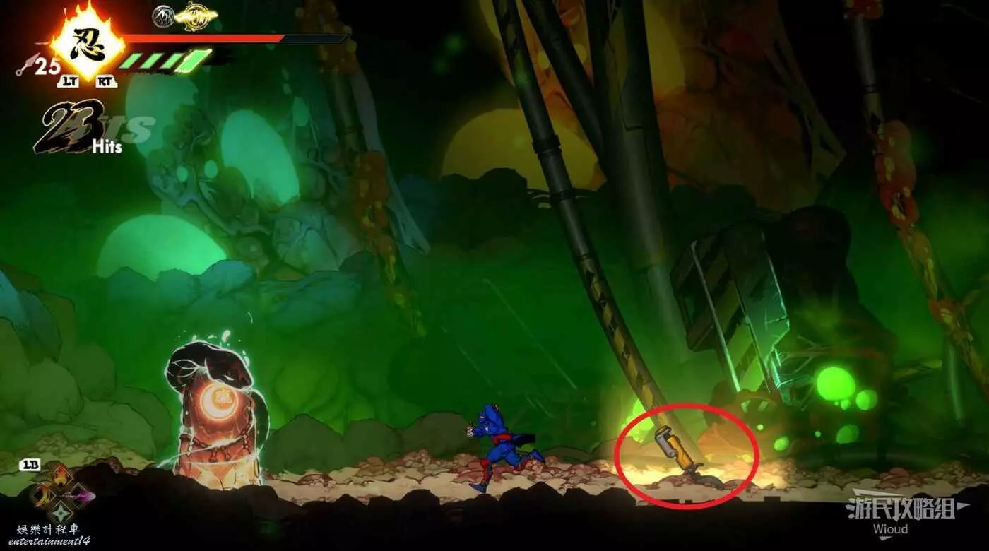回去啟動石碑並往上走,擊敗藍色燈籠右側扔斧頭的敵人,它的上方有一個寶箱,通過兩連跳可直接上去。