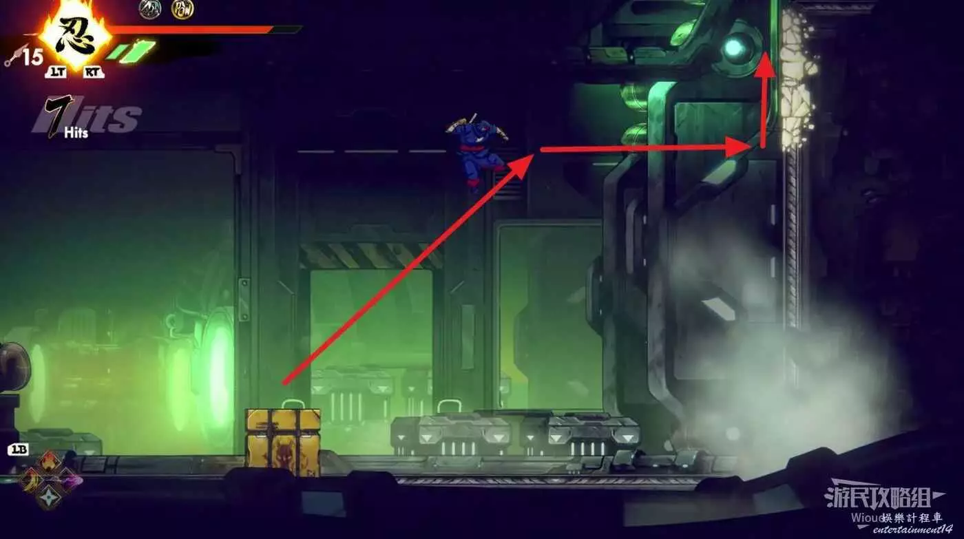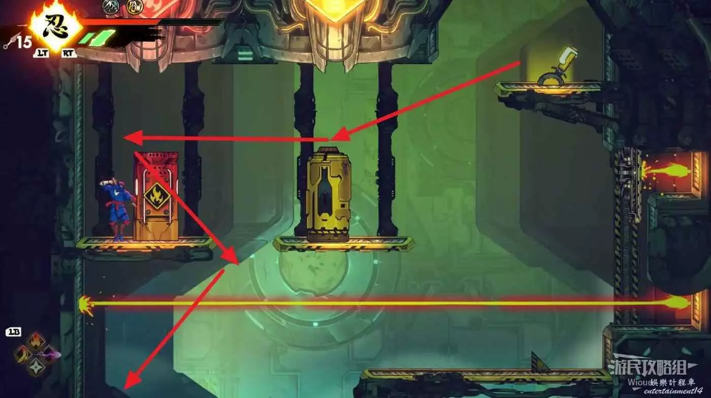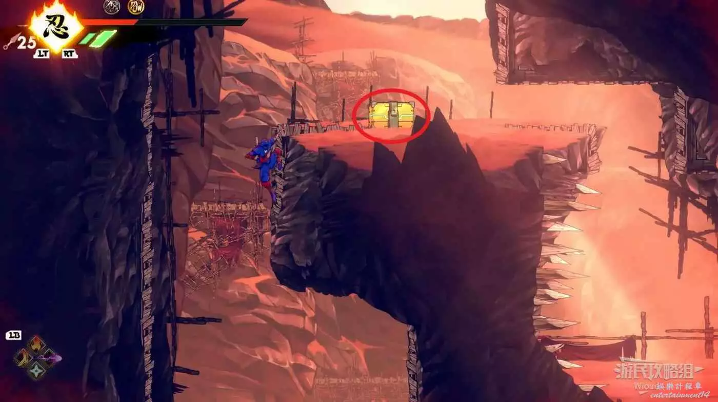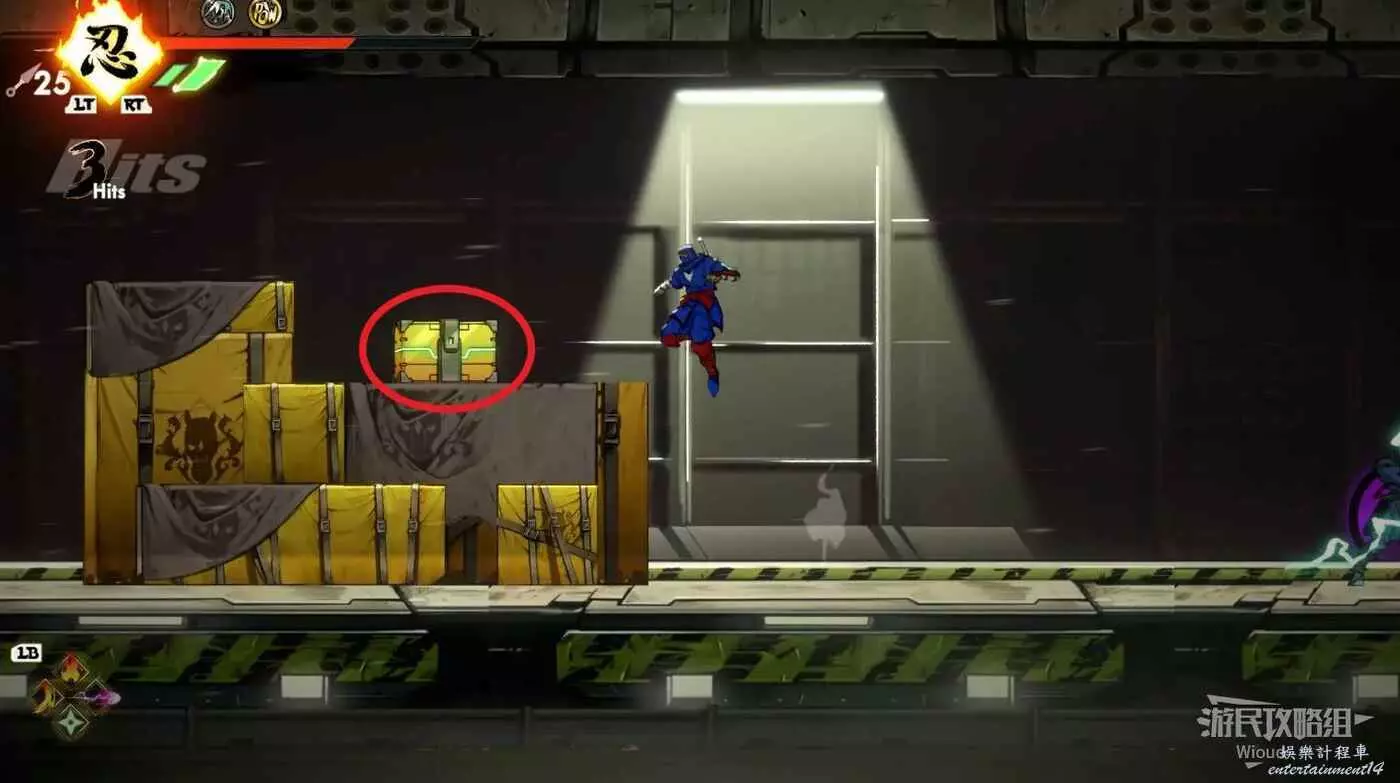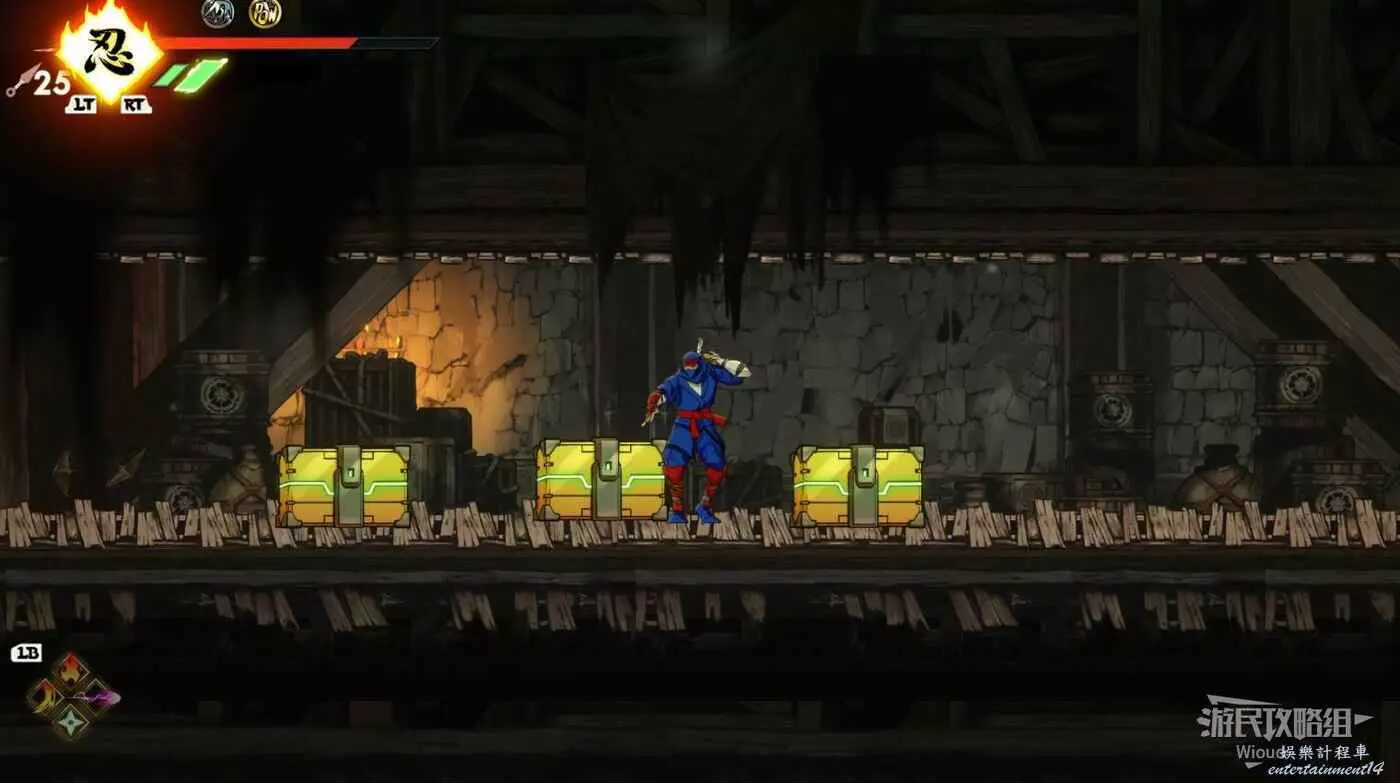 繼續移動,兩個高台上各有一個黃色箱子,攻擊箱子可獲得一定的補給,可恢復手裡劍與一定的血量。