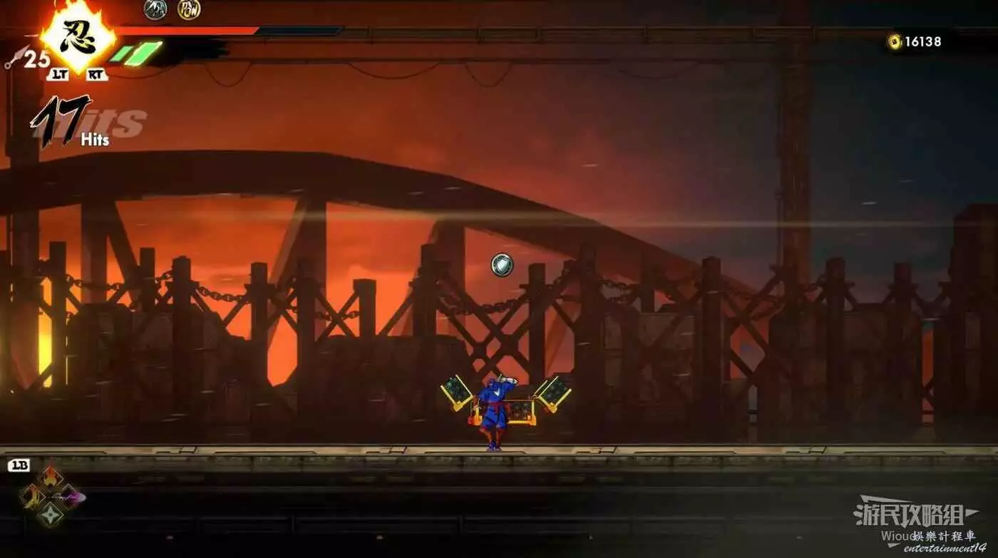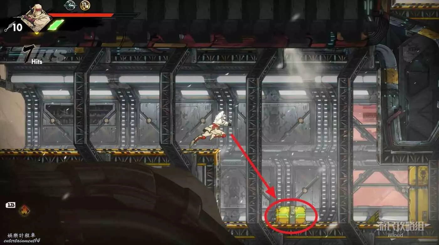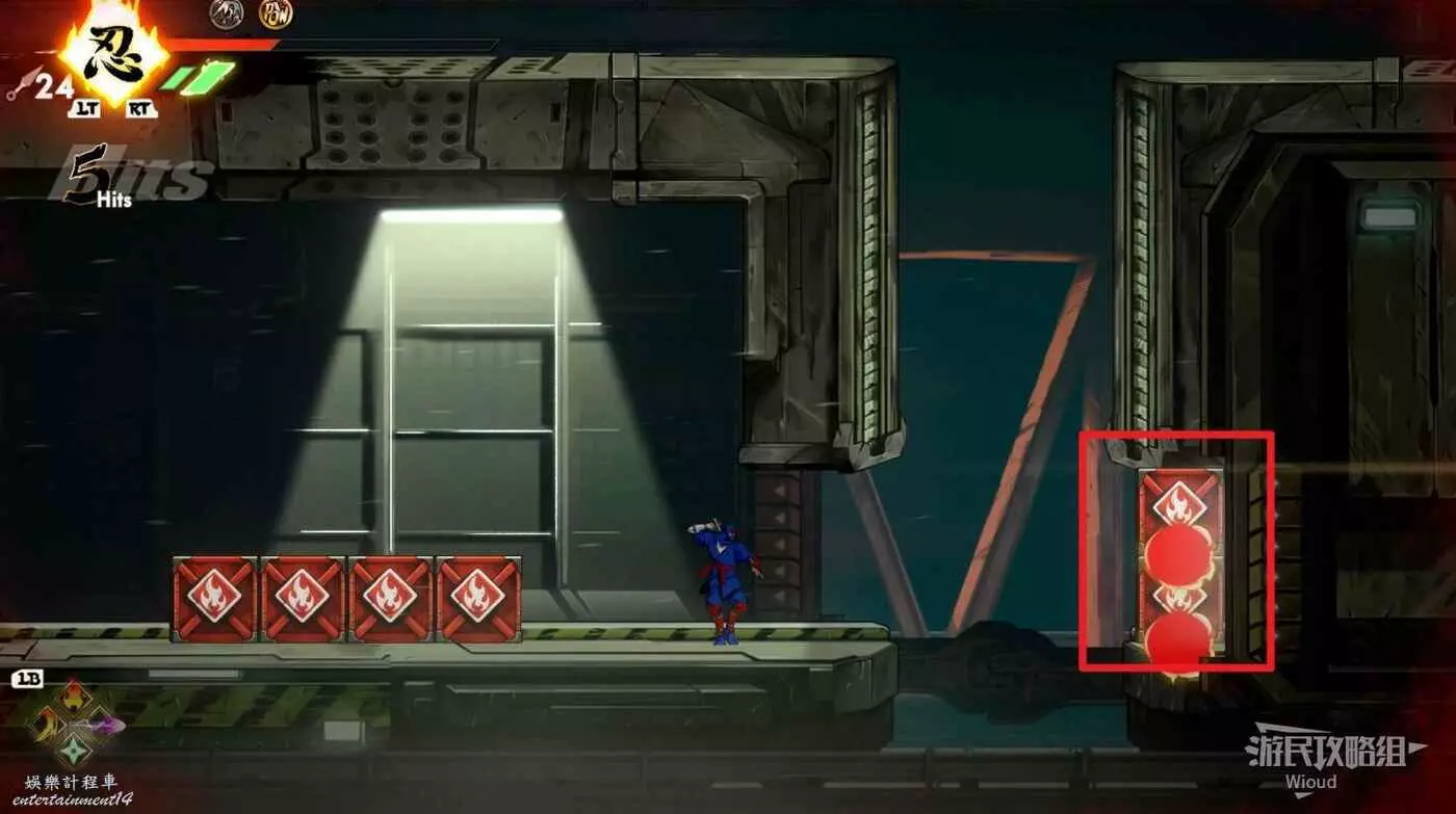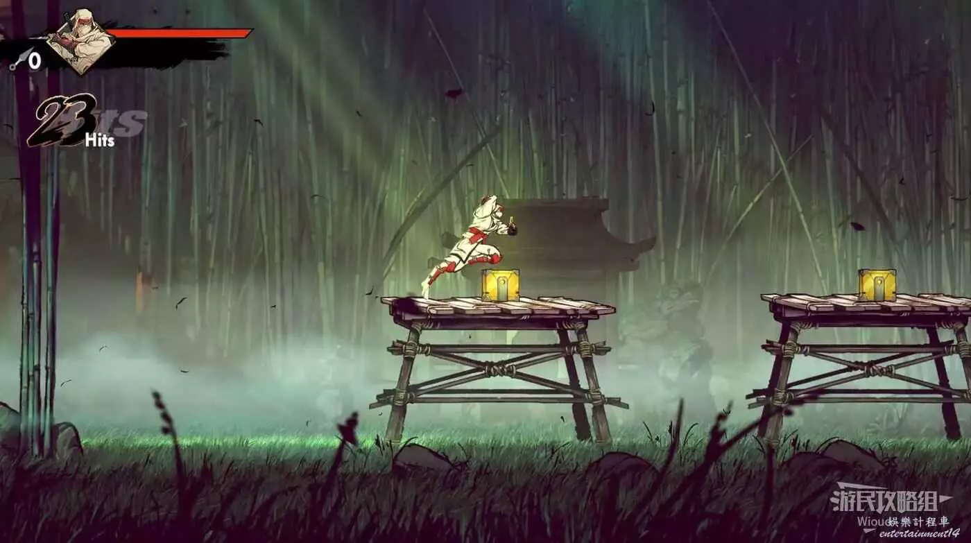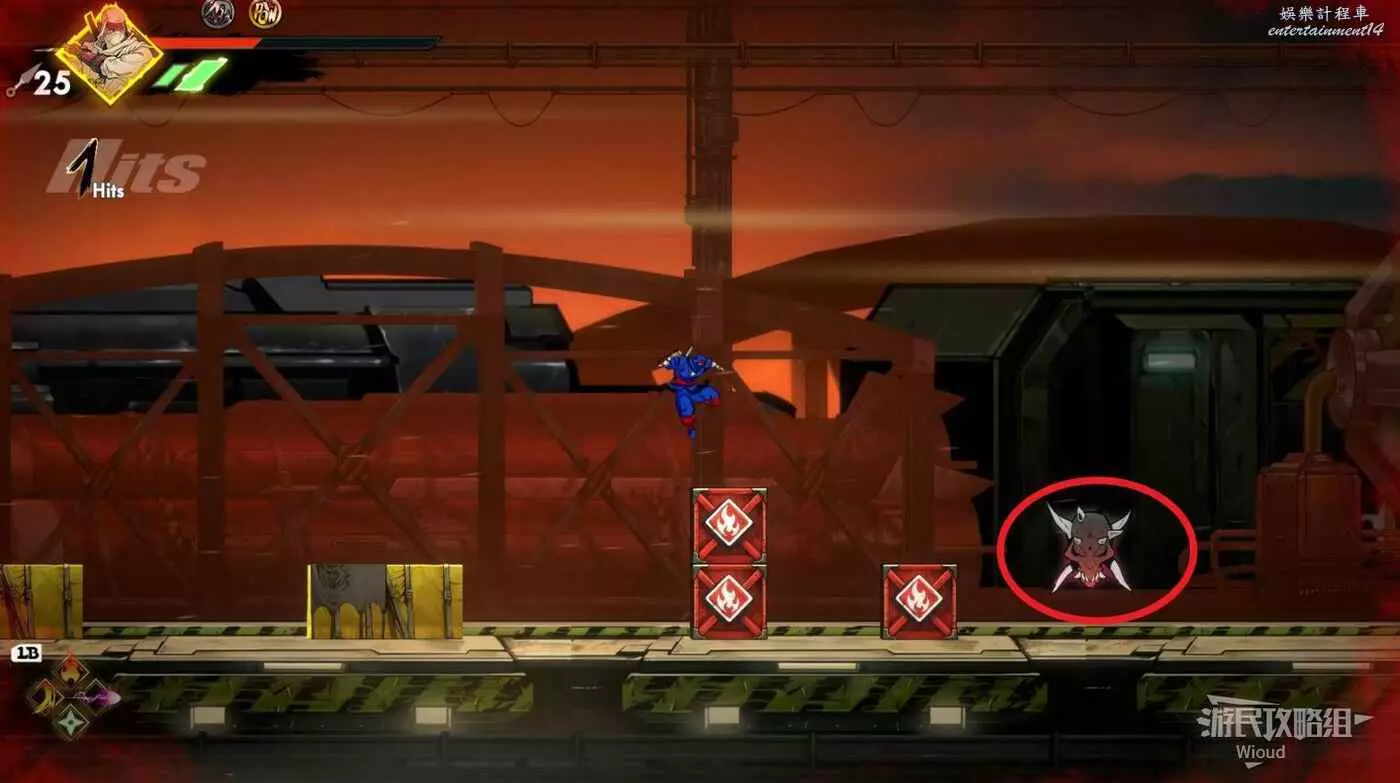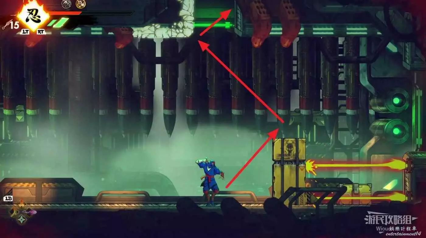 繼續移動,兩個高台上各有一個黃色箱子,攻擊箱子可獲得一定的補給,可恢復手裡劍與一定的血量。