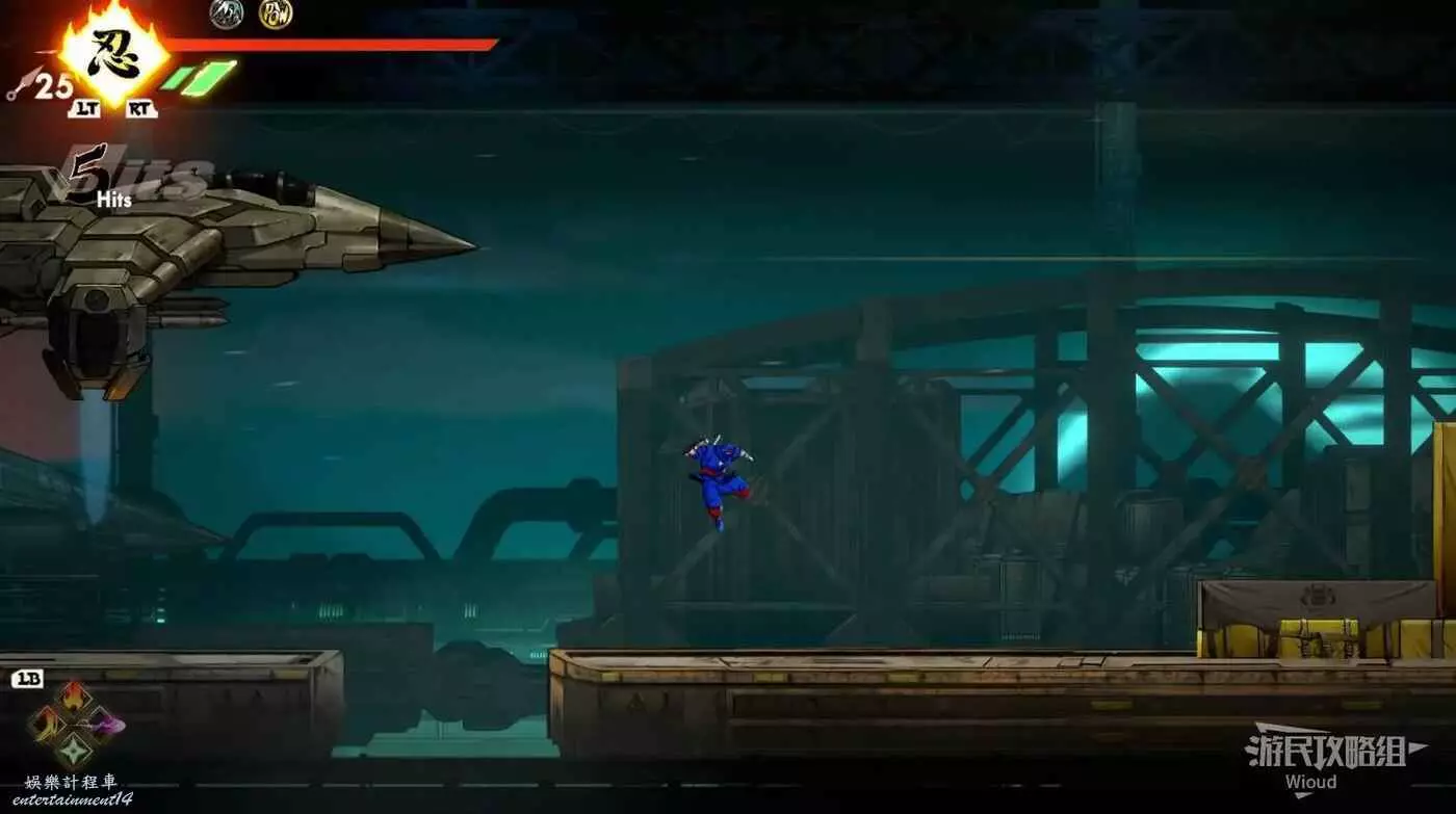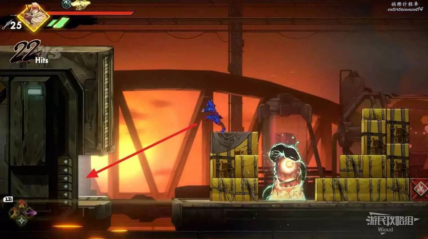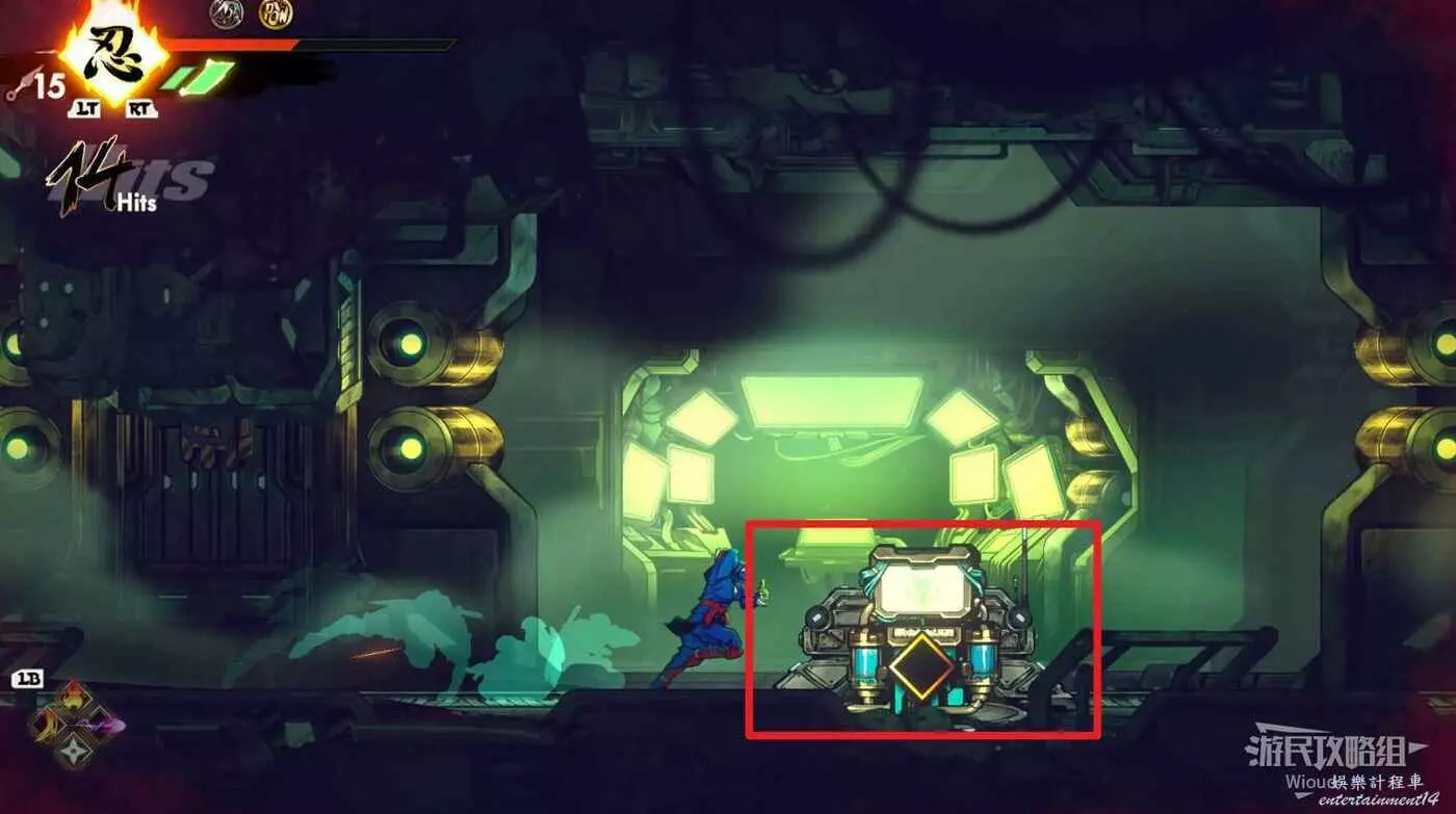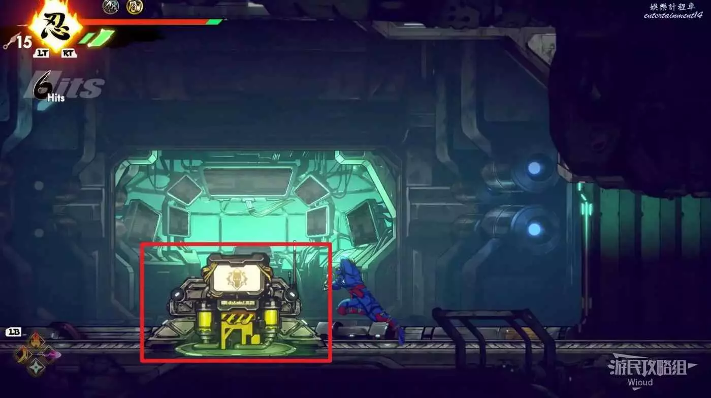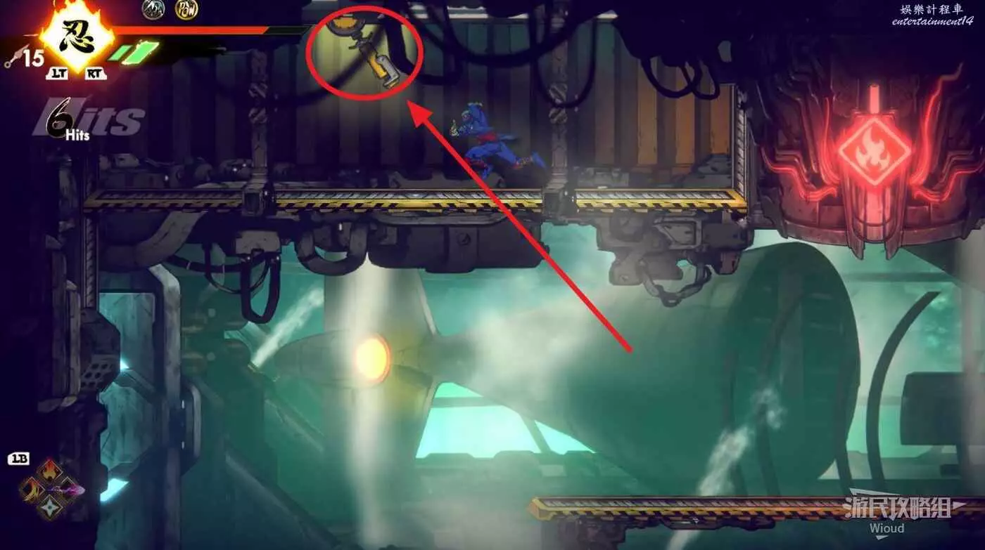 繼續移動,兩個高台上各有一個黃色箱子,攻擊箱子可獲得一定的補給,可恢復手裡劍與一定的血量。