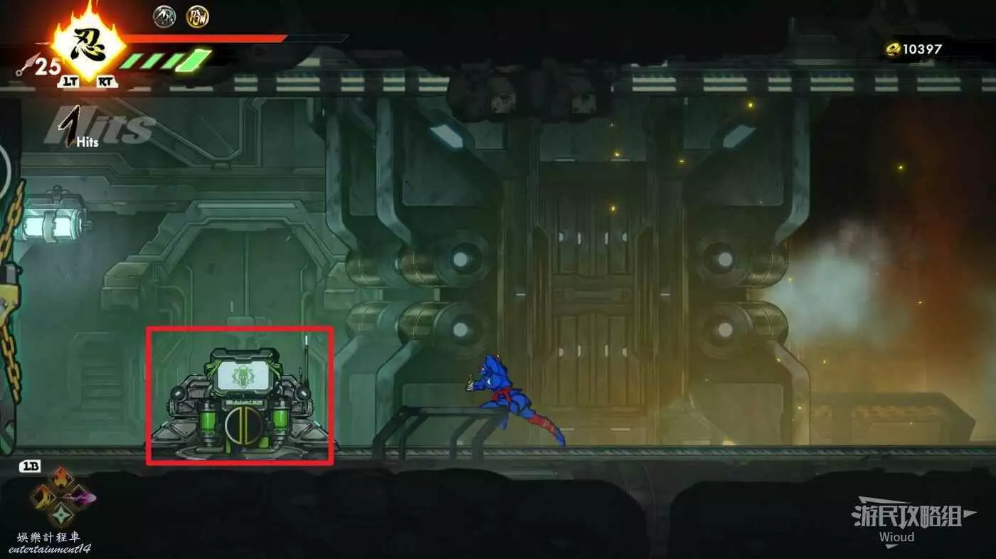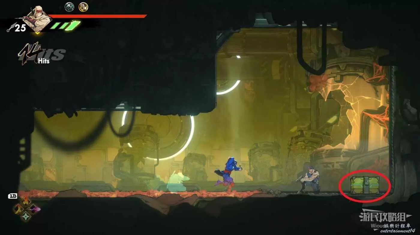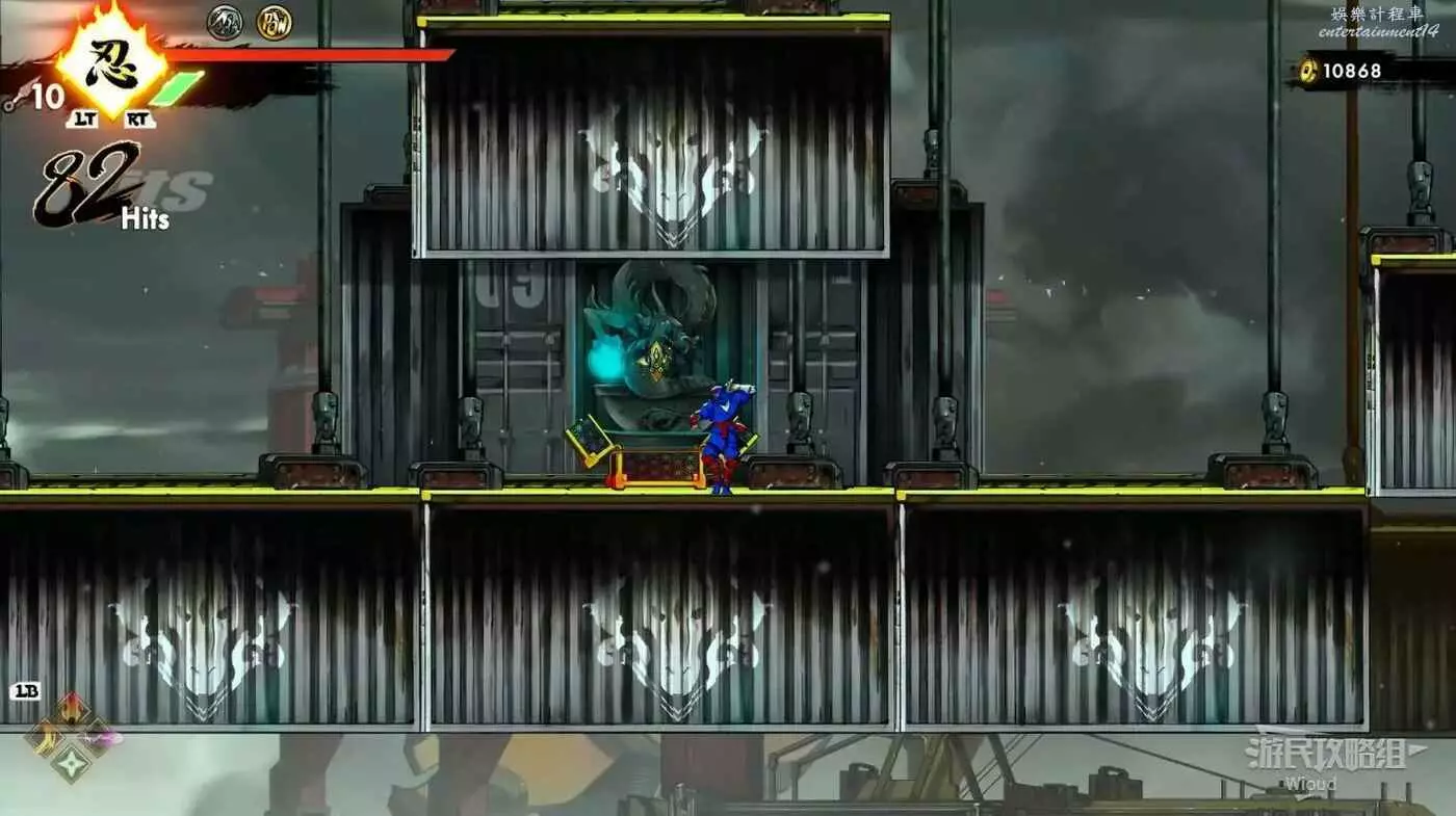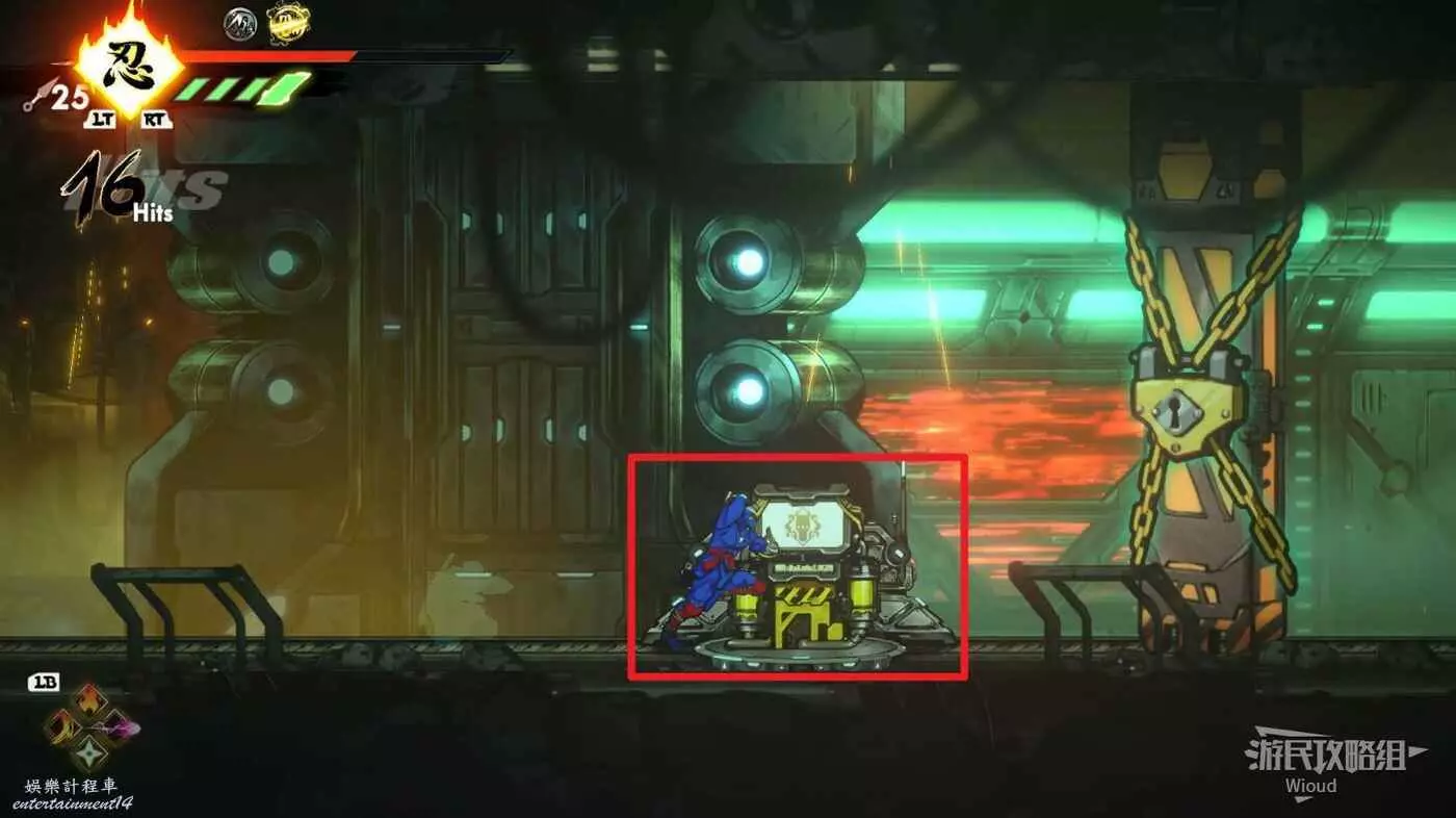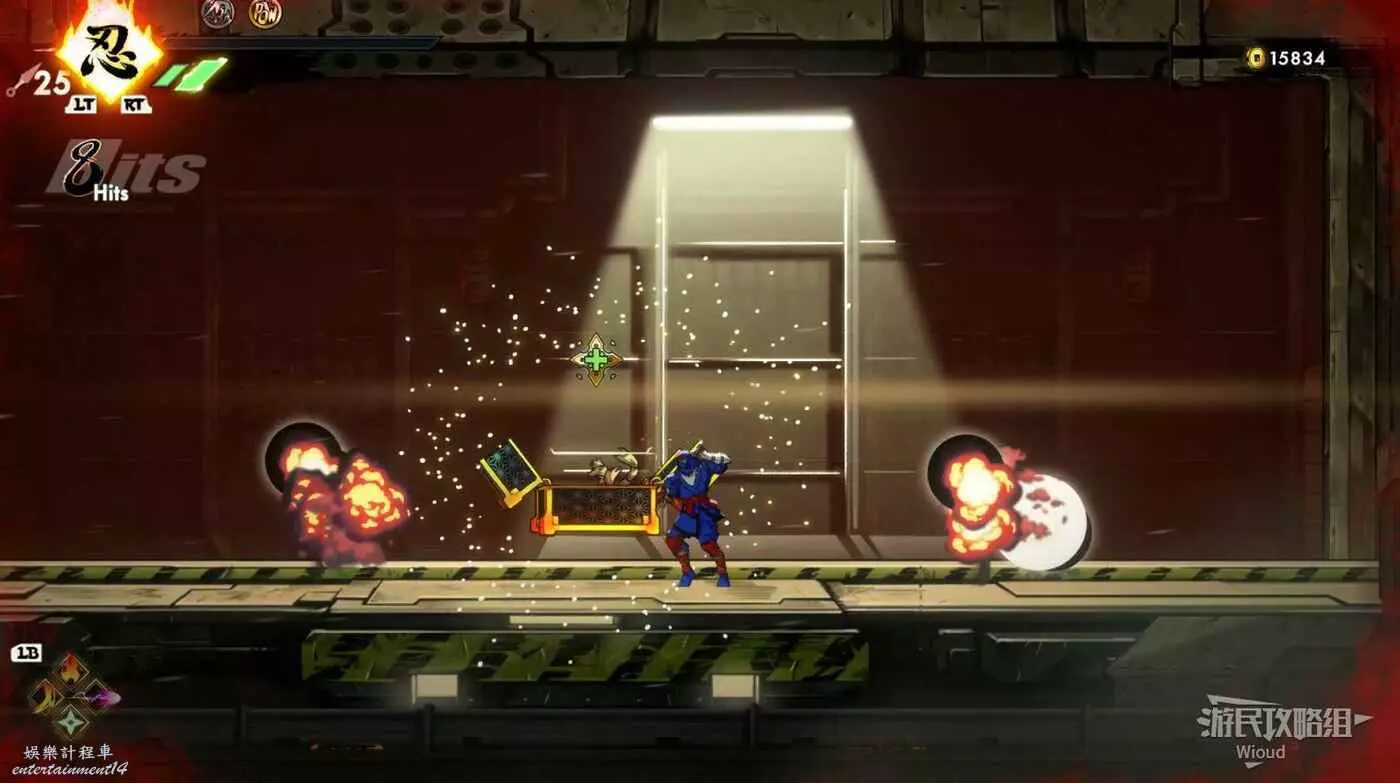 繼續移動,兩個高台上各有一個黃色箱子,攻擊箱子可獲得一定的補給,可恢復手裡劍與一定的血量。