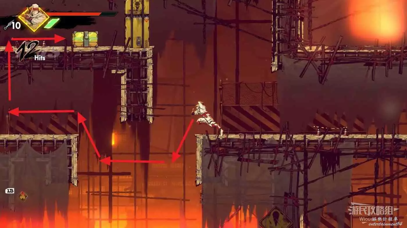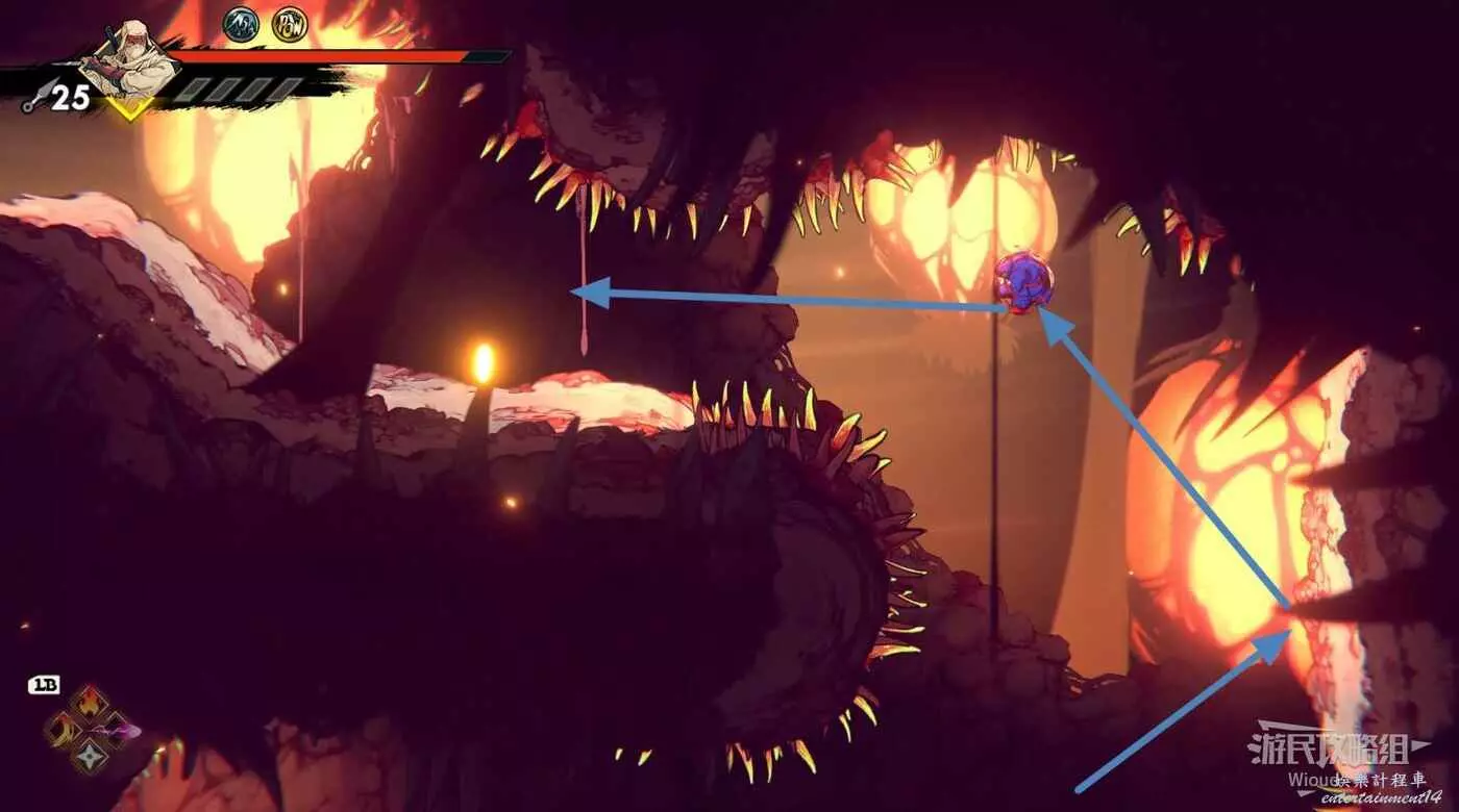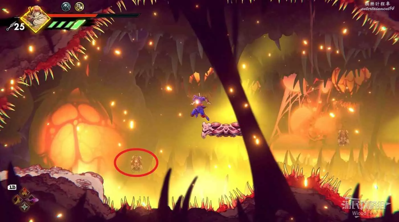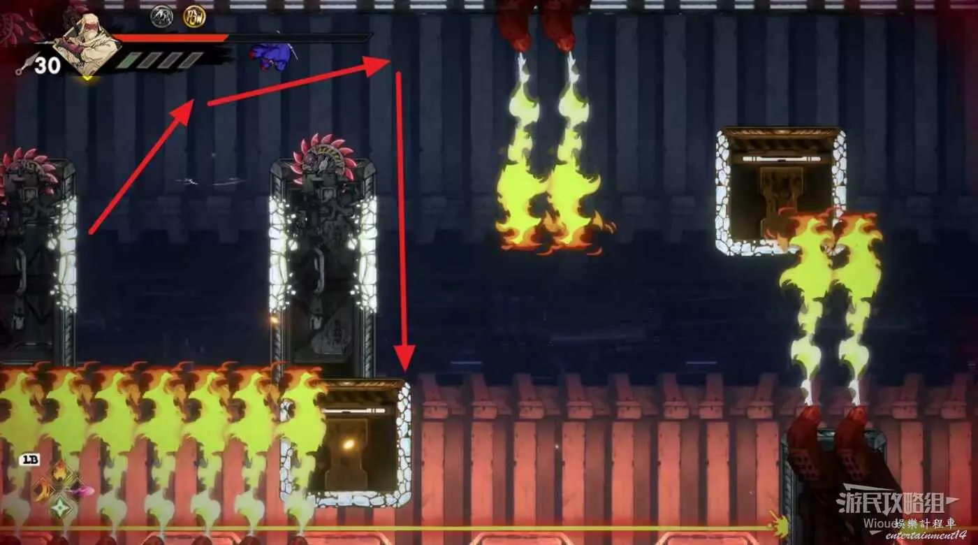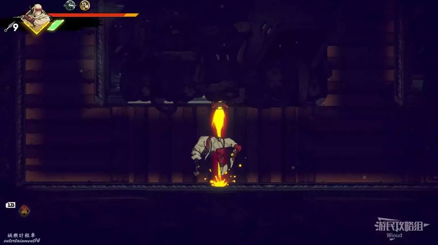 注意區域燃燒的火堆,主角只要碰到這種陷阱會立刻死亡,並消耗部分血量在旁邊復活。