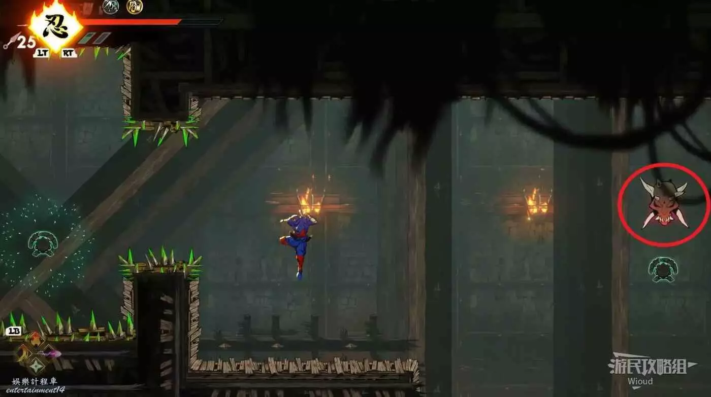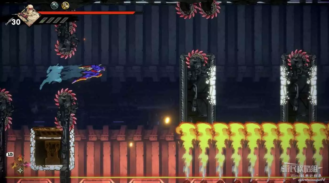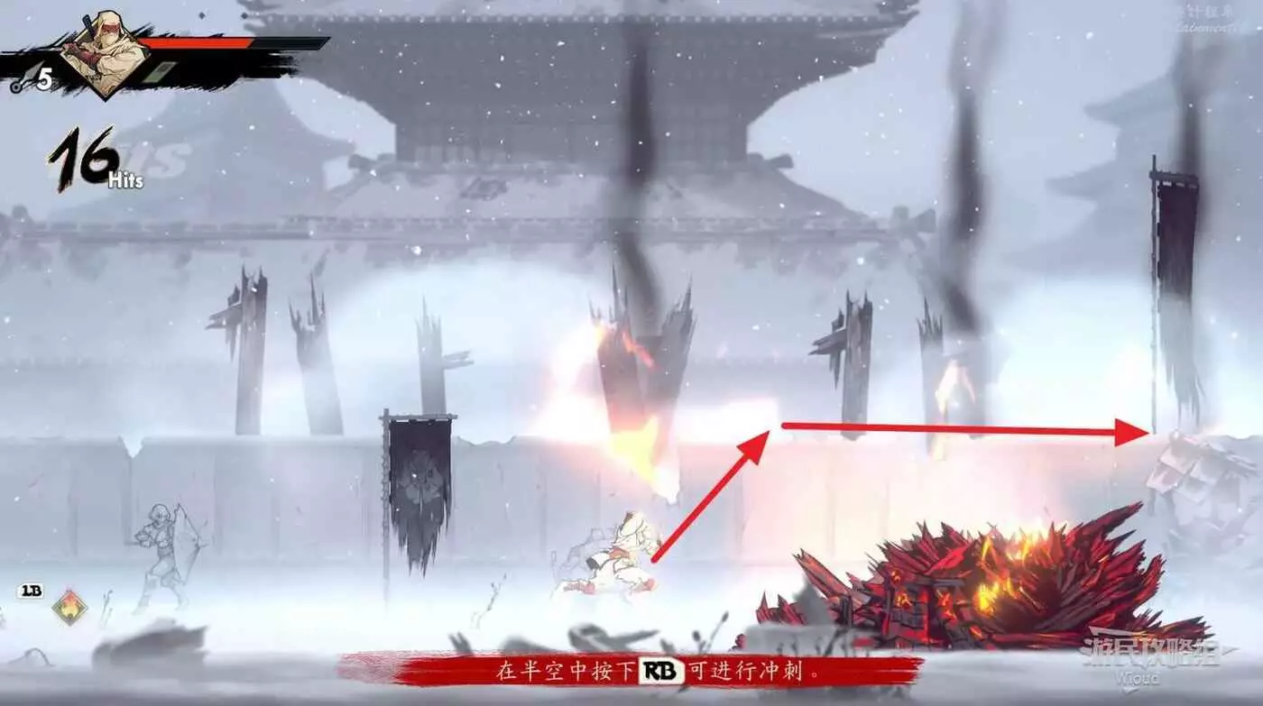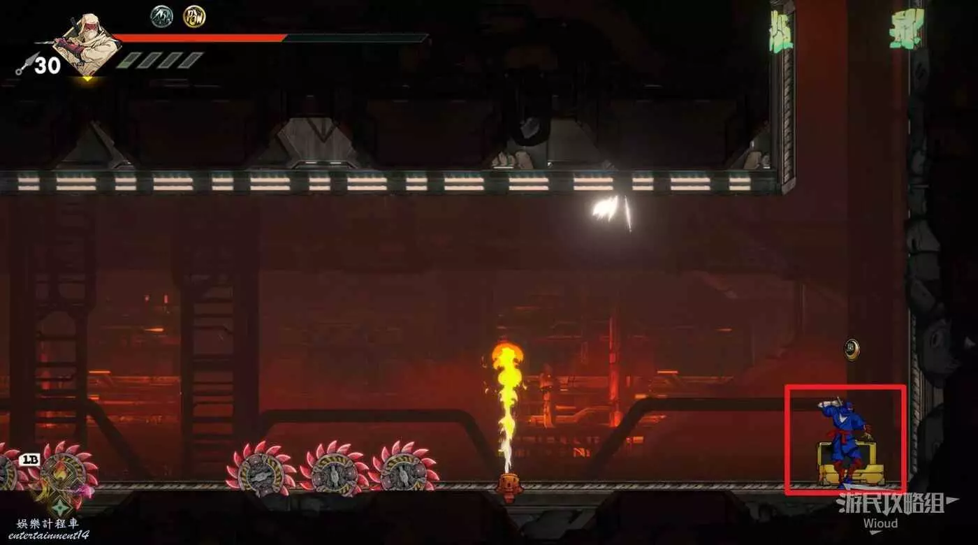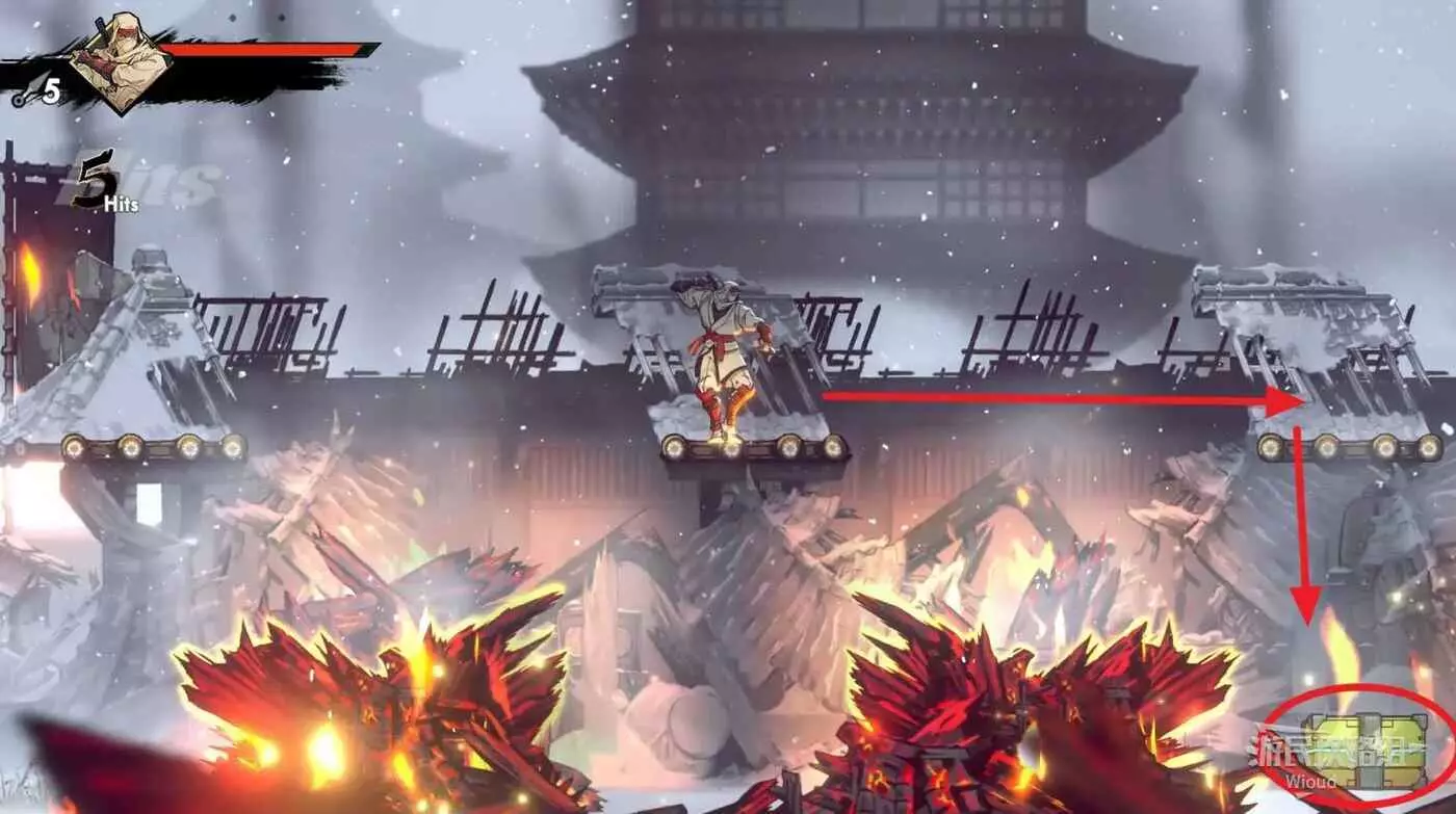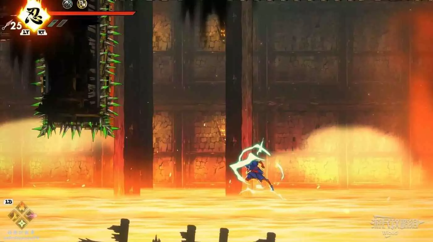注意區域燃燒的火堆,主角只要碰到這種陷阱會立刻死亡,並消耗部分血量在旁邊復活。