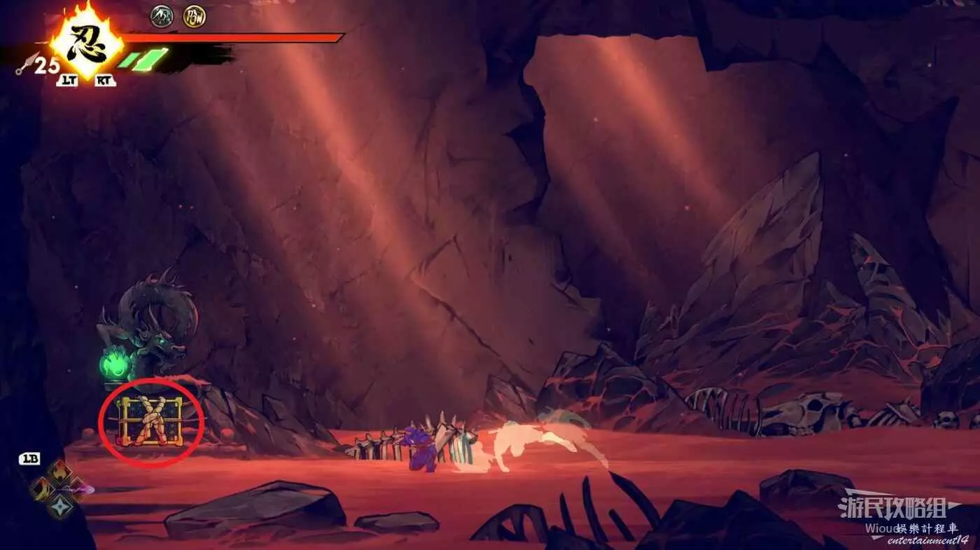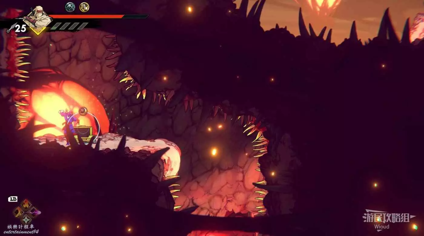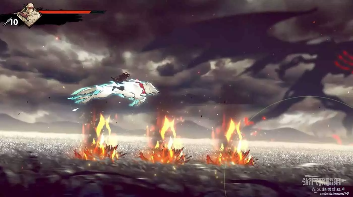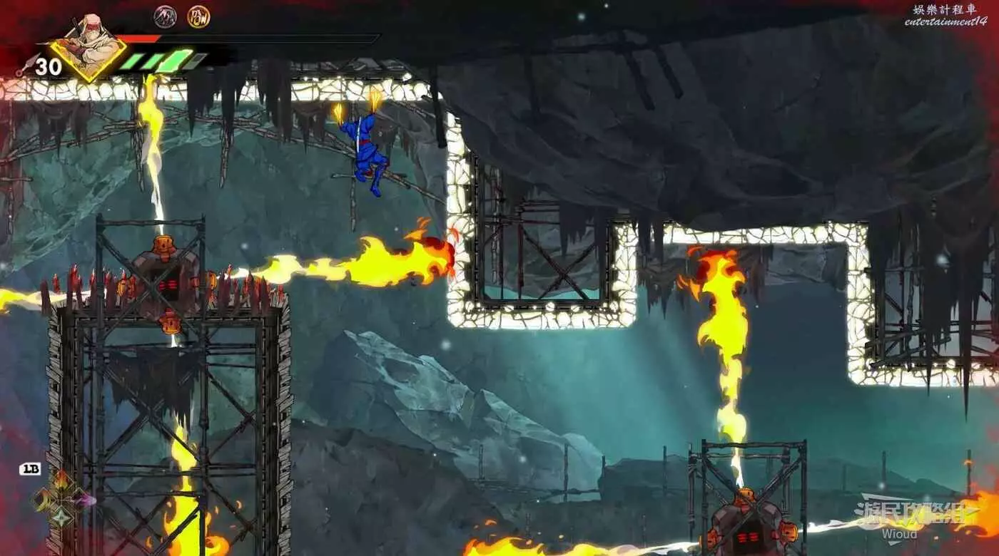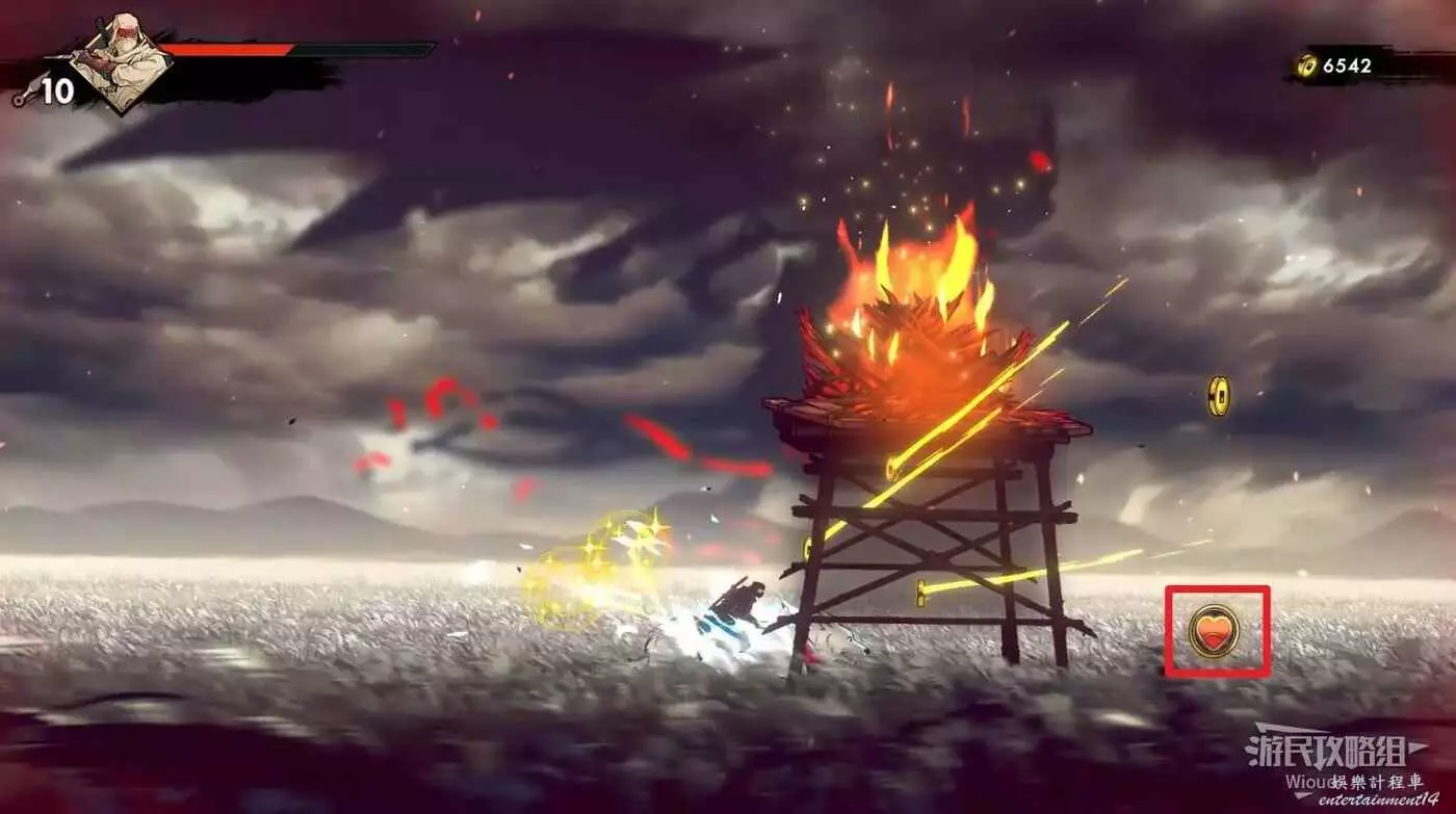 注意區域燃燒的火堆,主角只要碰到這種陷阱會立刻死亡,並消耗部分血量在旁邊復活。