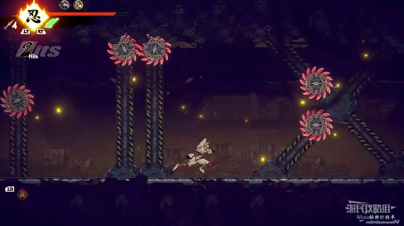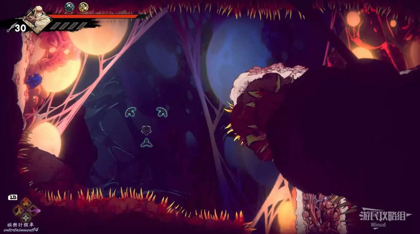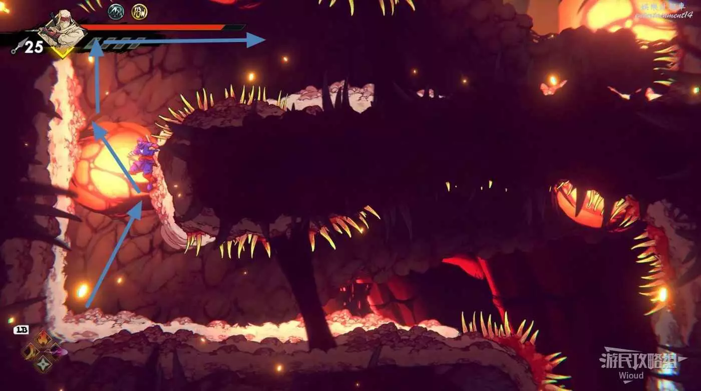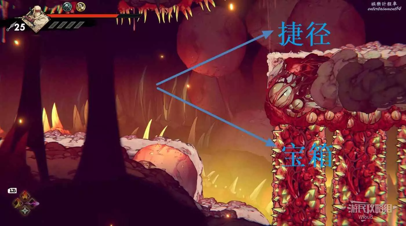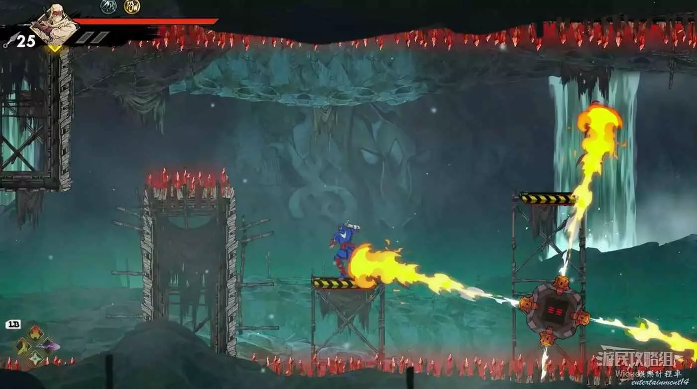 注意區域燃燒的火堆,主角只要碰到這種陷阱會立刻死亡,並消耗部分血量在旁邊復活。