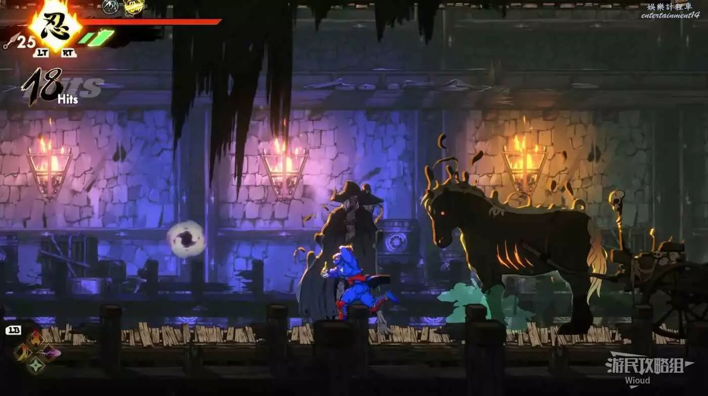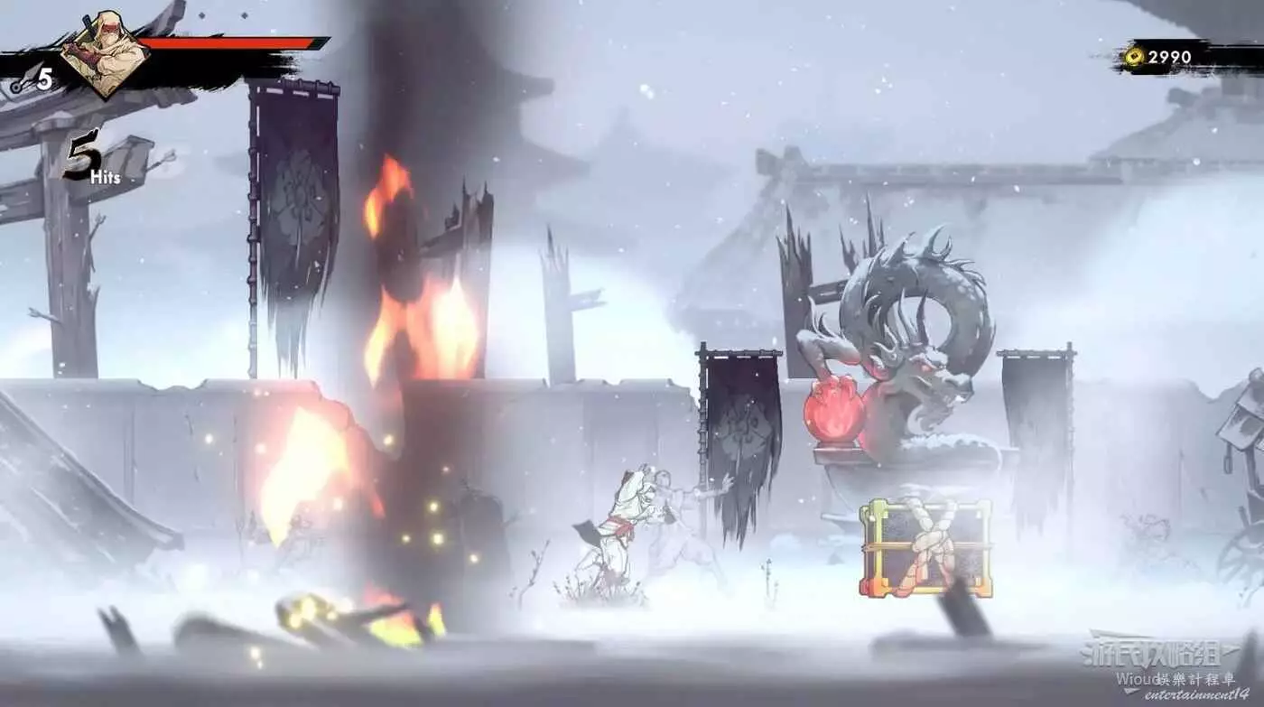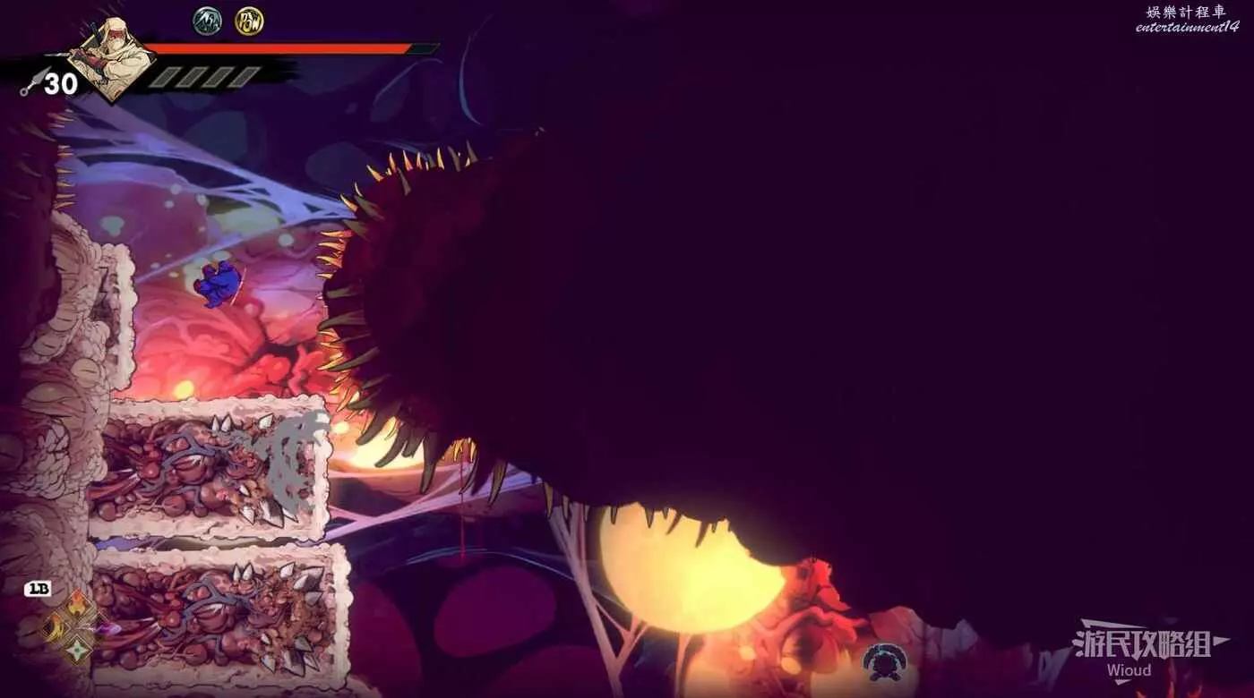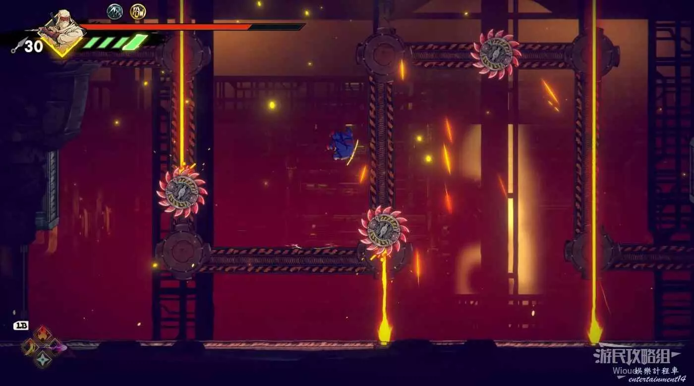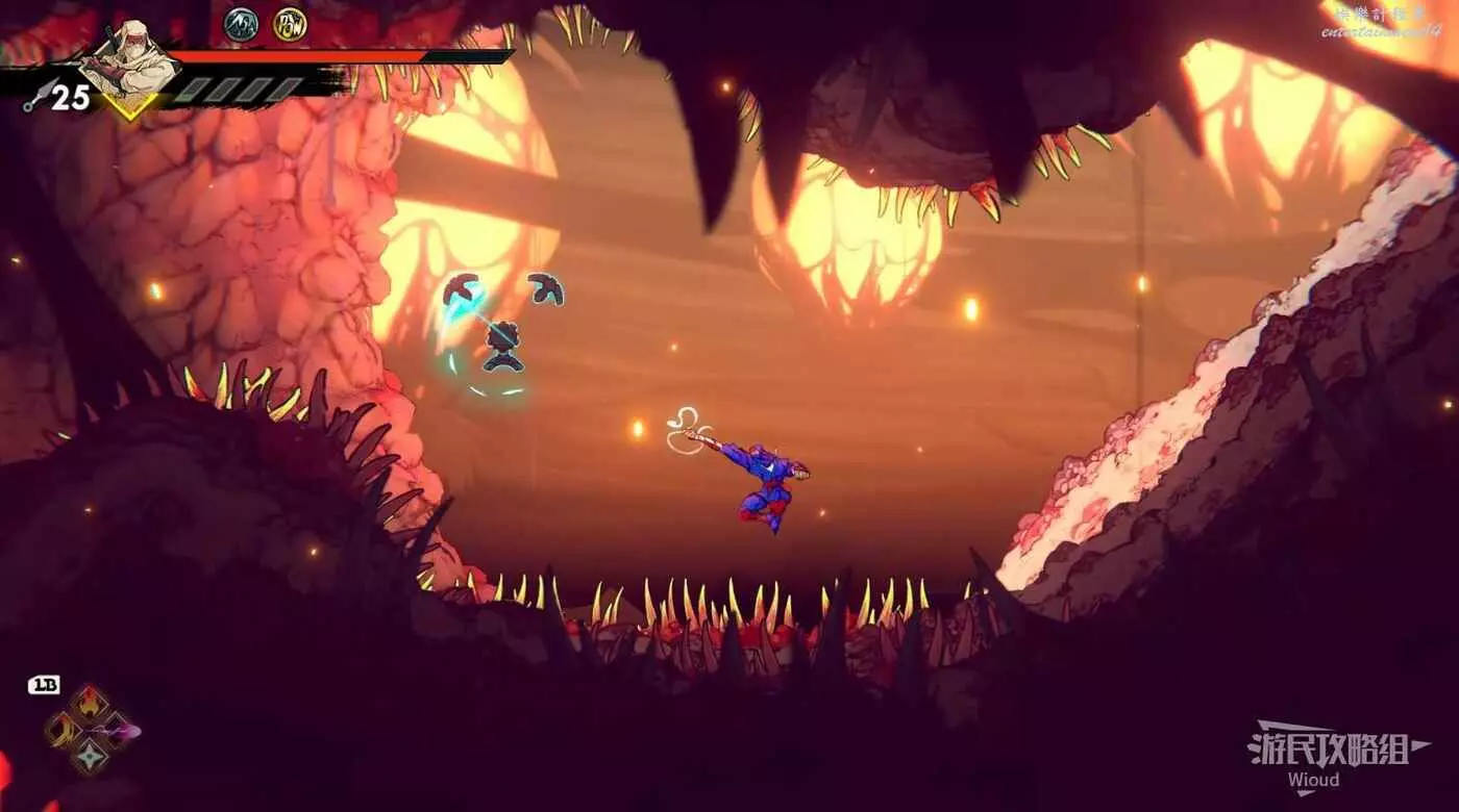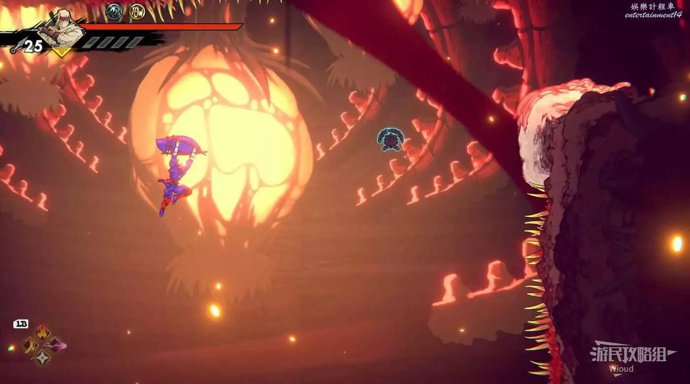 注意區域燃燒的火堆,主角只要碰到這種陷阱會立刻死亡,並消耗部分血量在旁邊復活。
