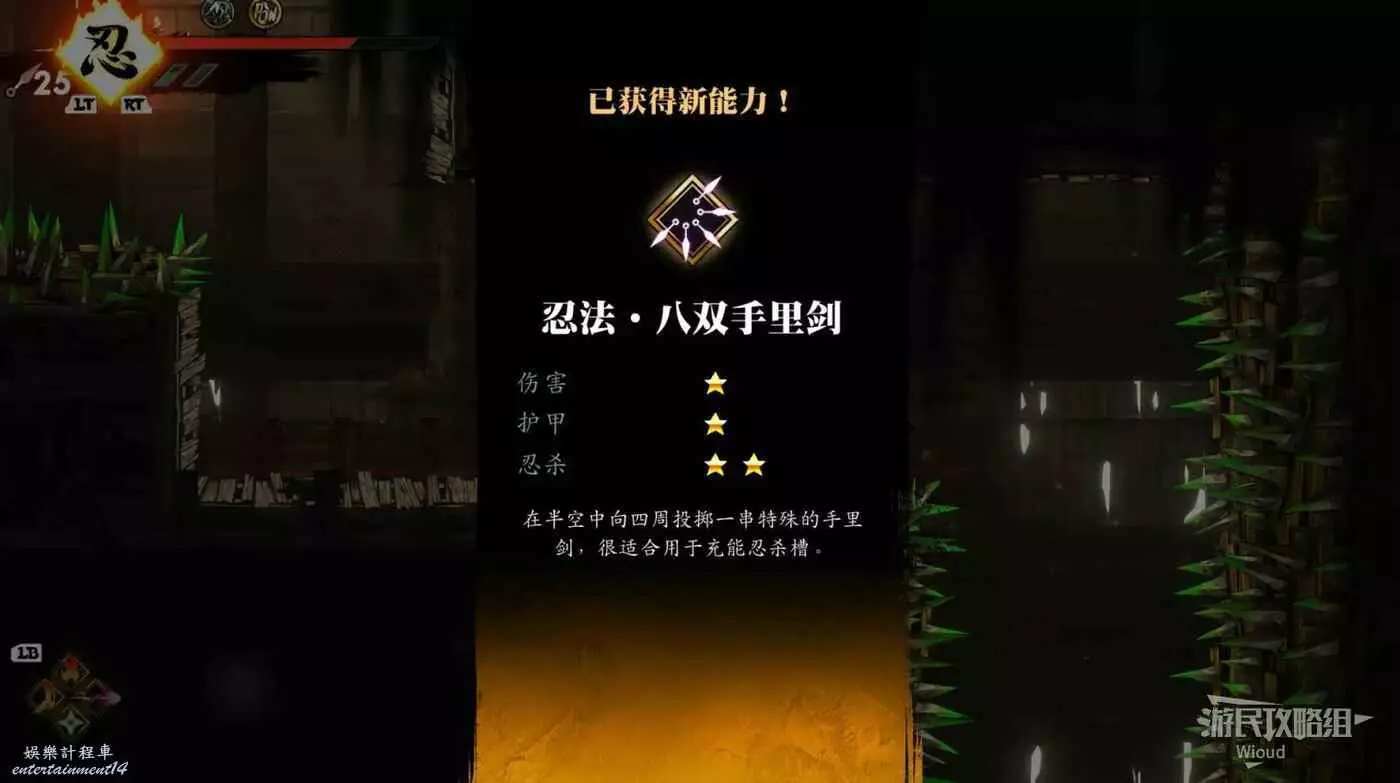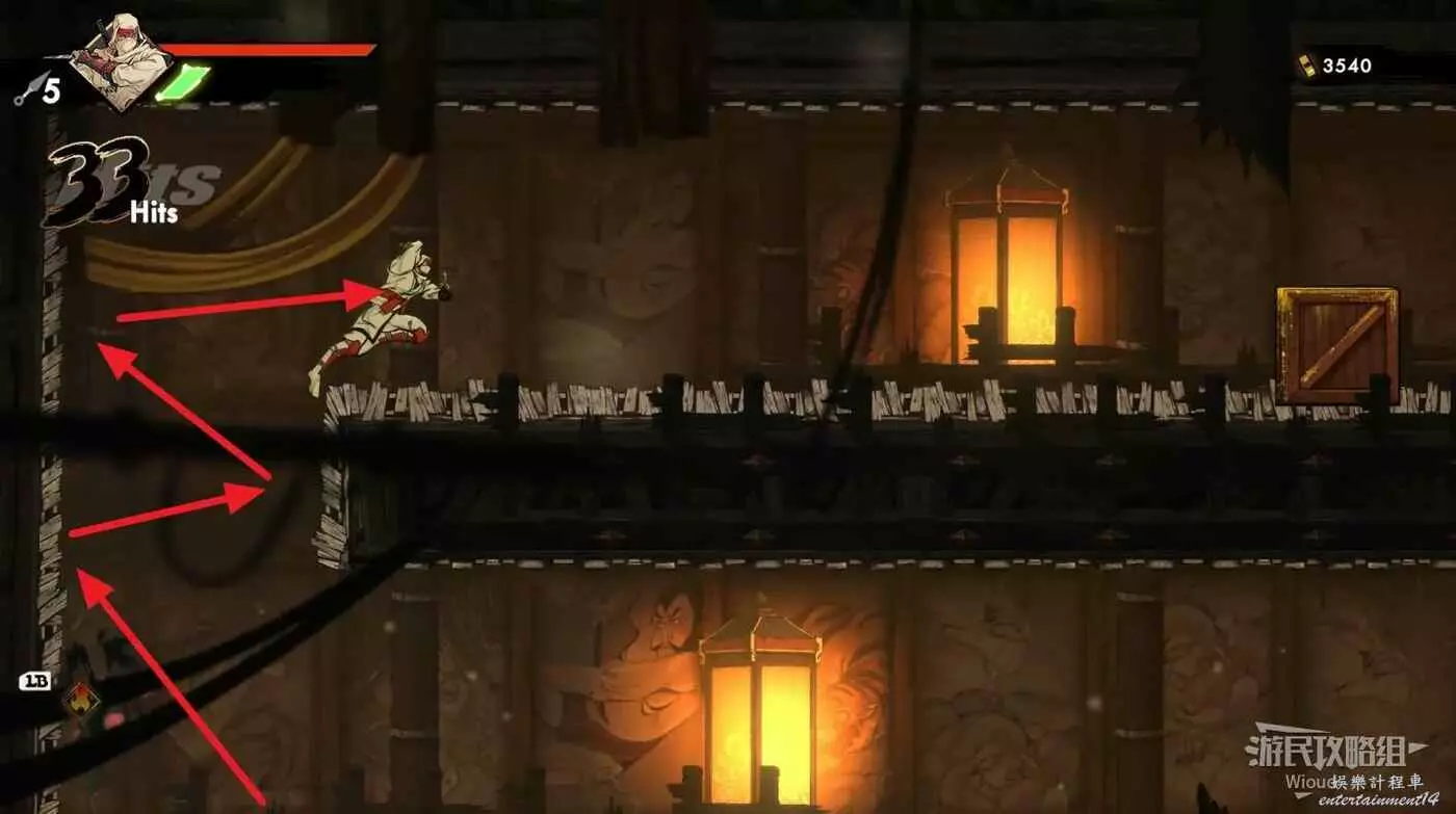再往右一段,到達第二個房屋位置時,通過上面的可抓爬牆壁到二樓,裡面有個寶箱,開啟可獲得【手裡劍持有數提升】。