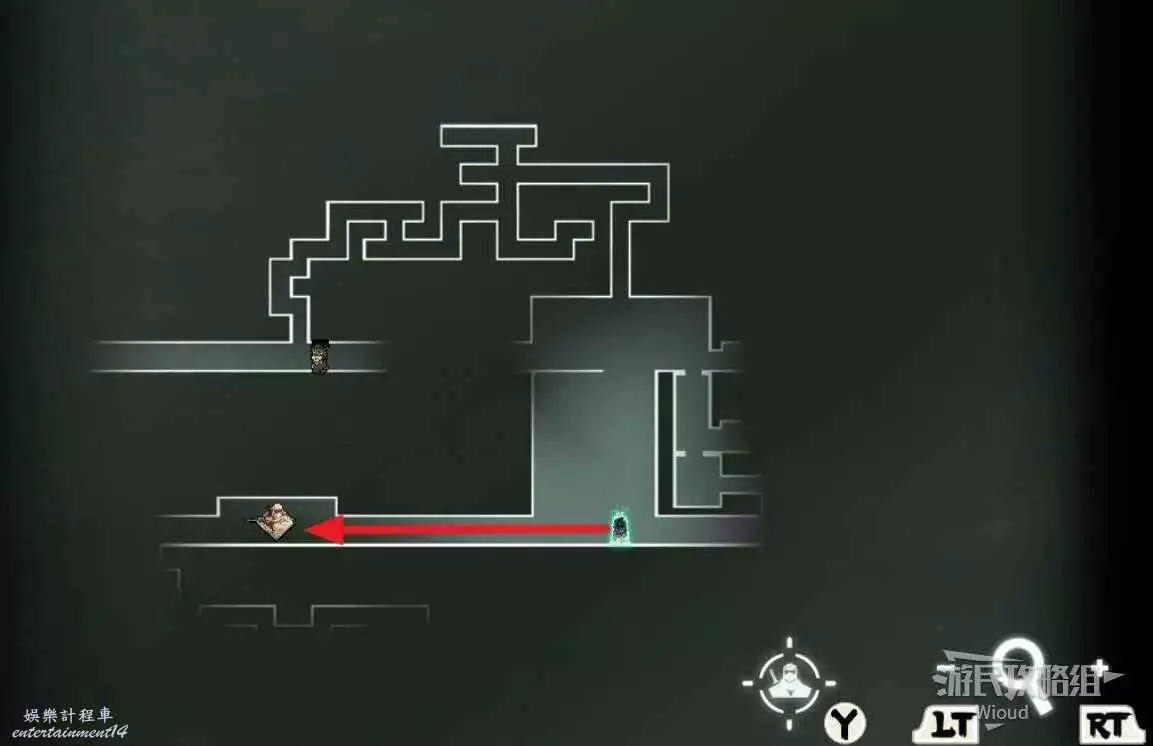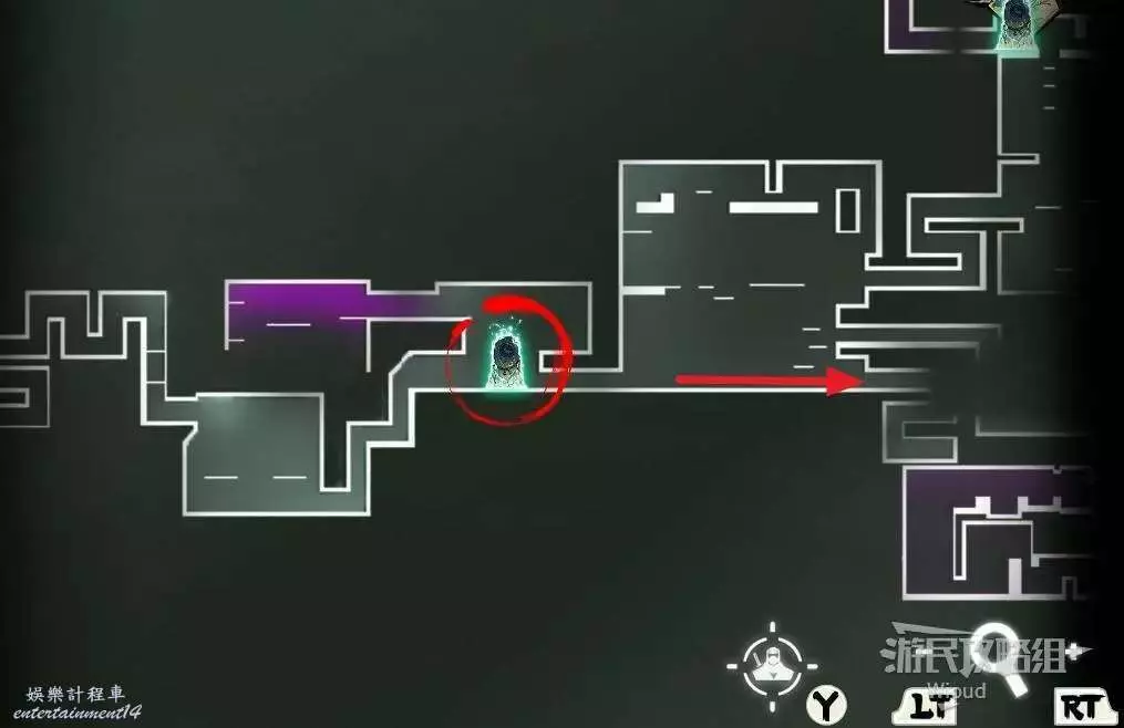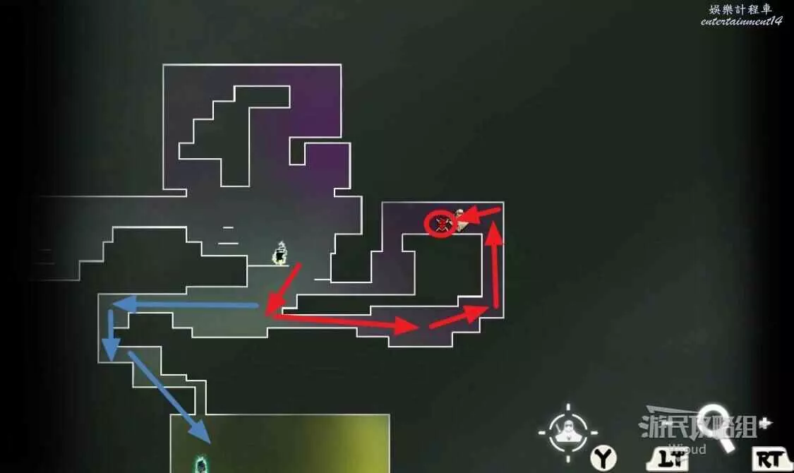 啟動石碑後走右邊,終點繞到左下角可找到一支【精英部隊】,然後跟著藍色箭頭貼牆往上走。