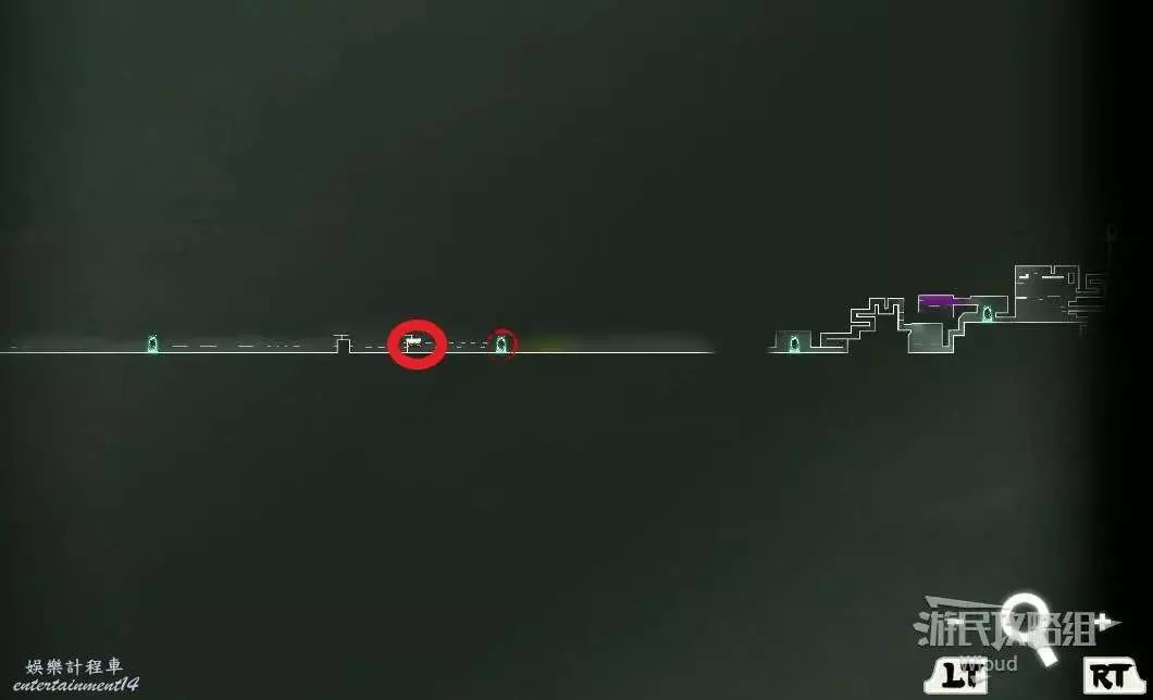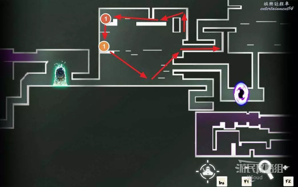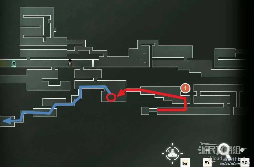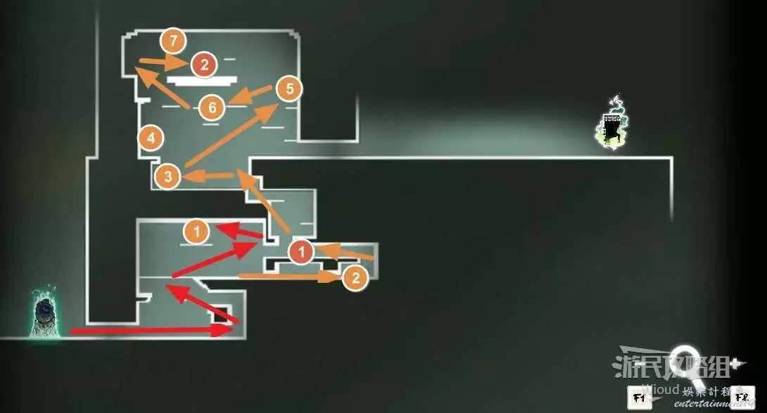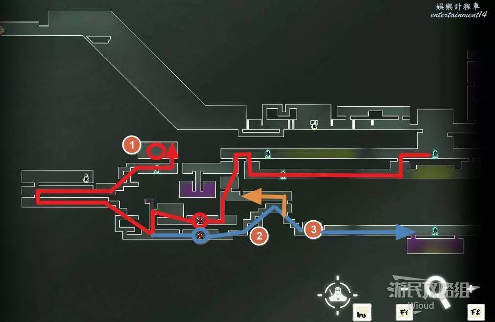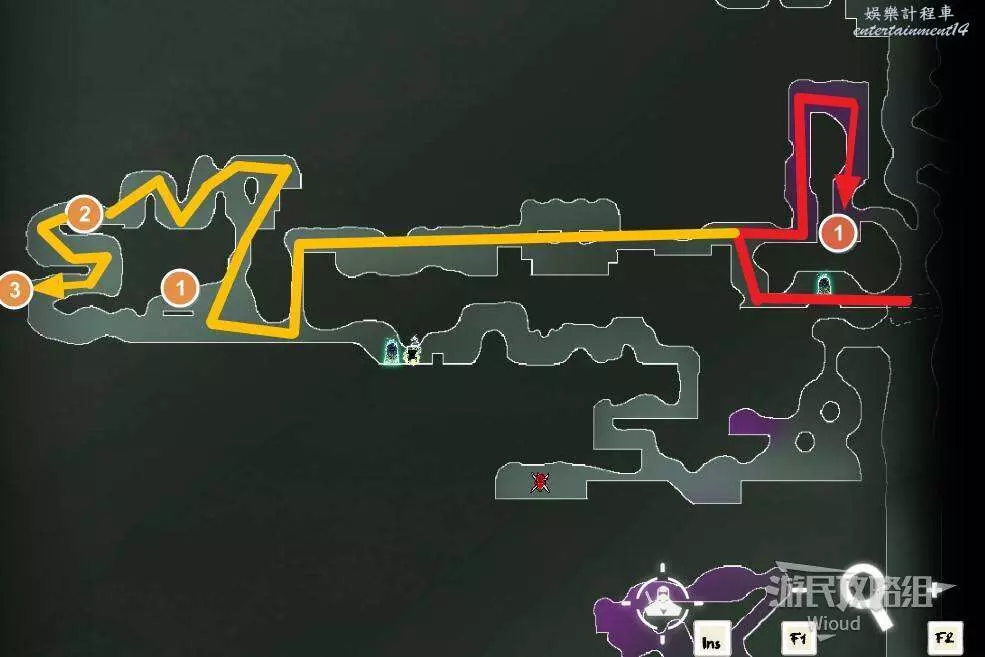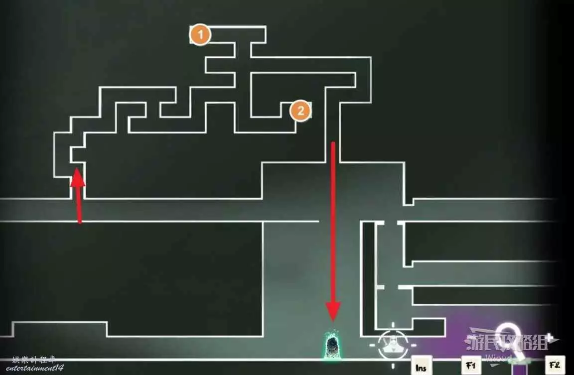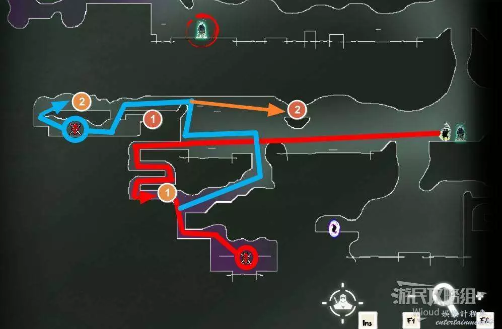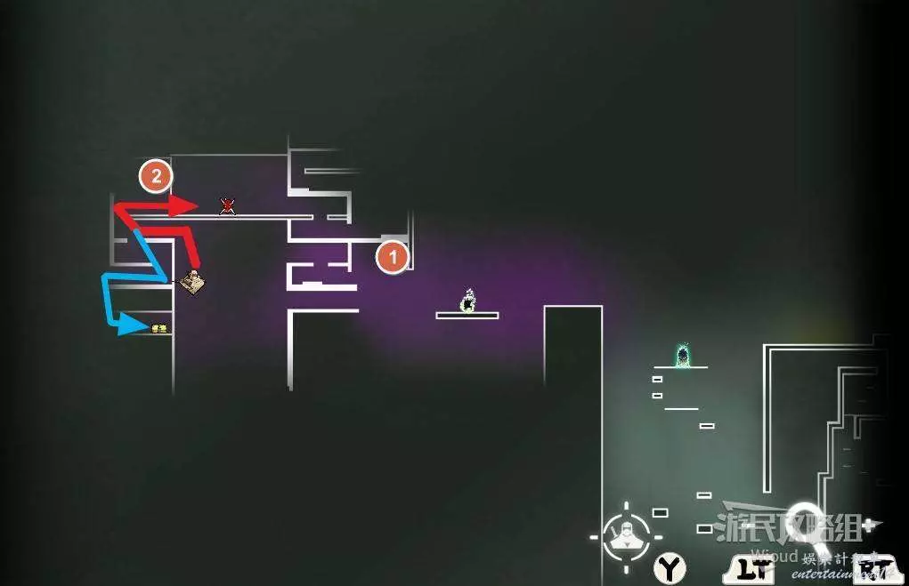 完事通過風道繼續上升跟隨藍色路線降落到地圖右下角石碑位置,繼續往左走到紅色標識2的位置,中間都是風道躲避陷阱,沒有額外機關。