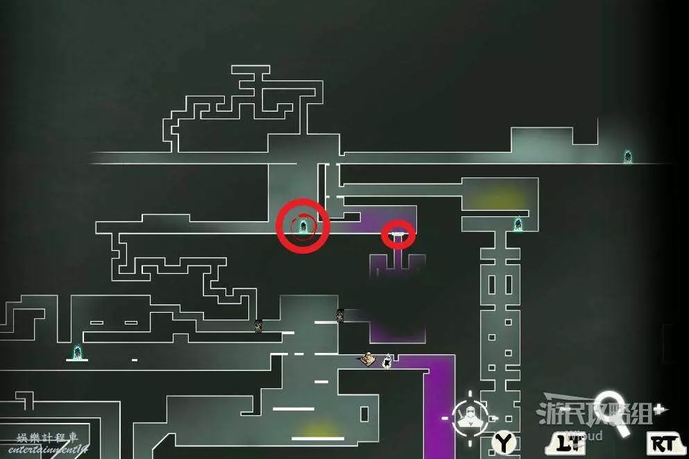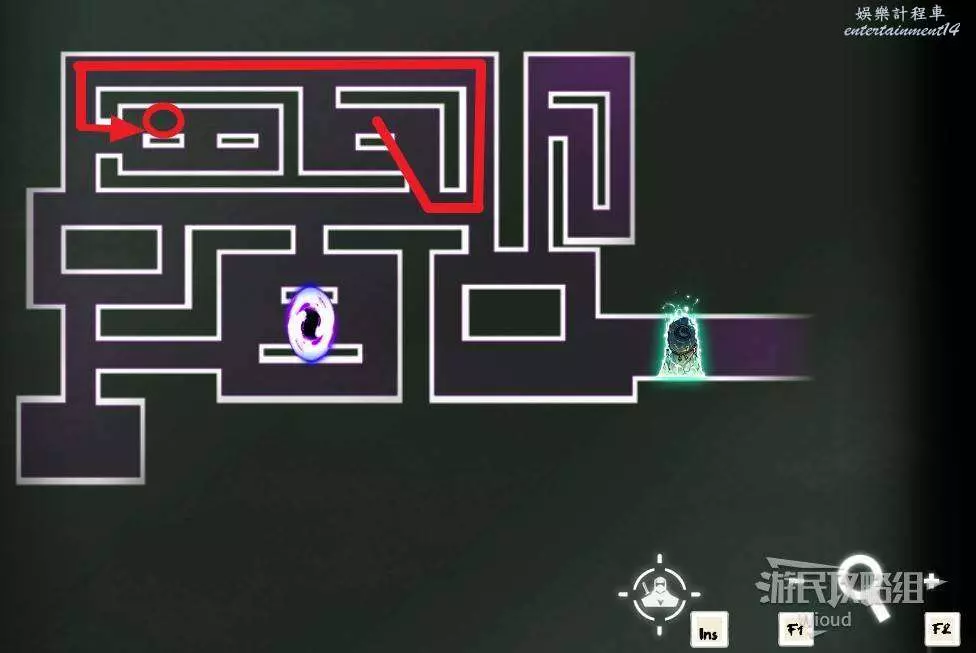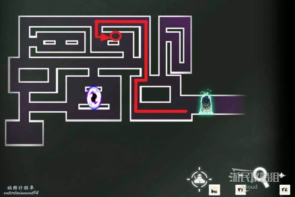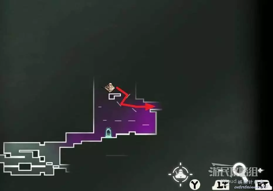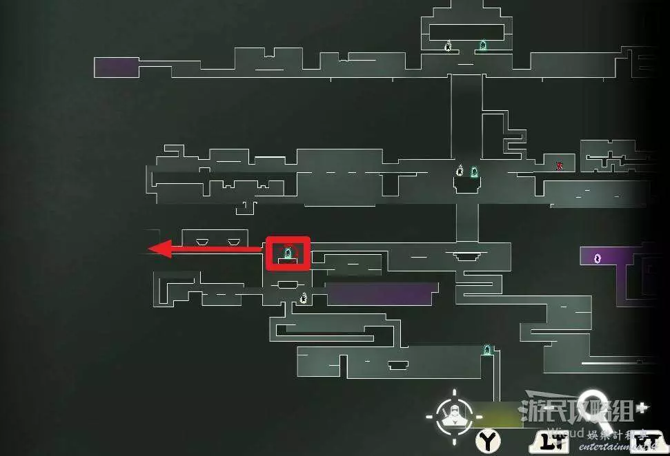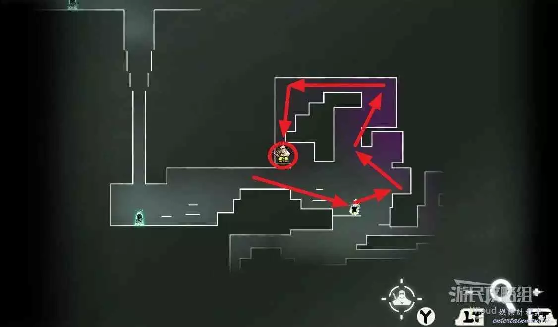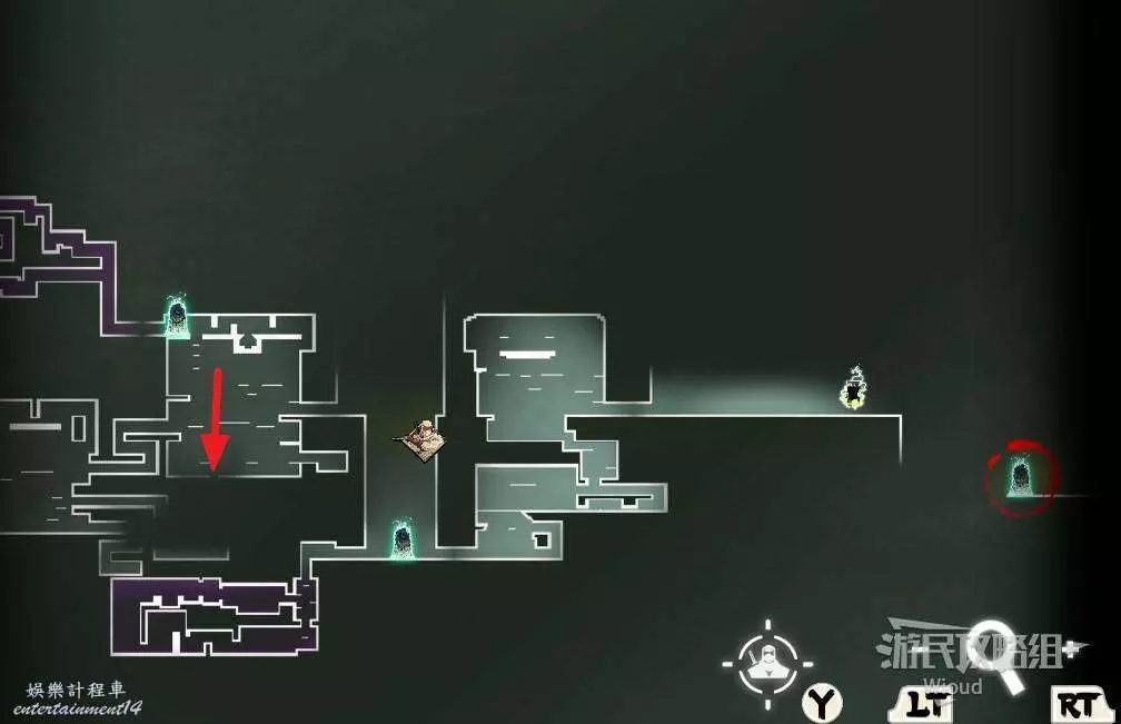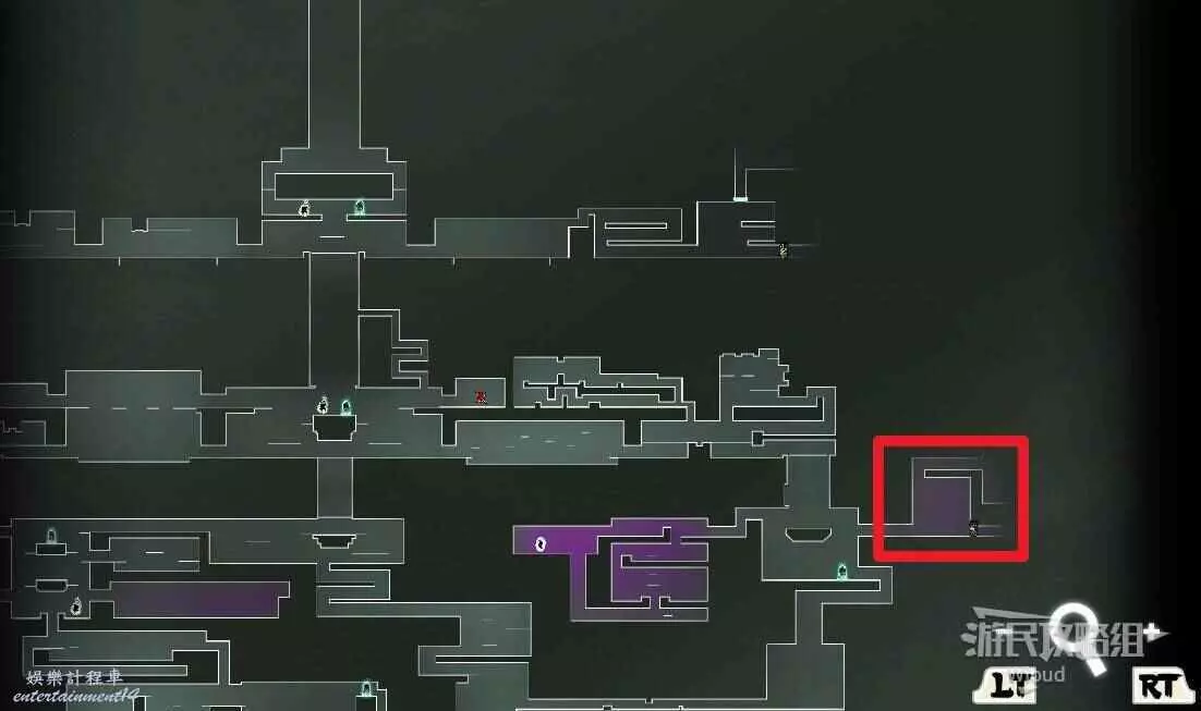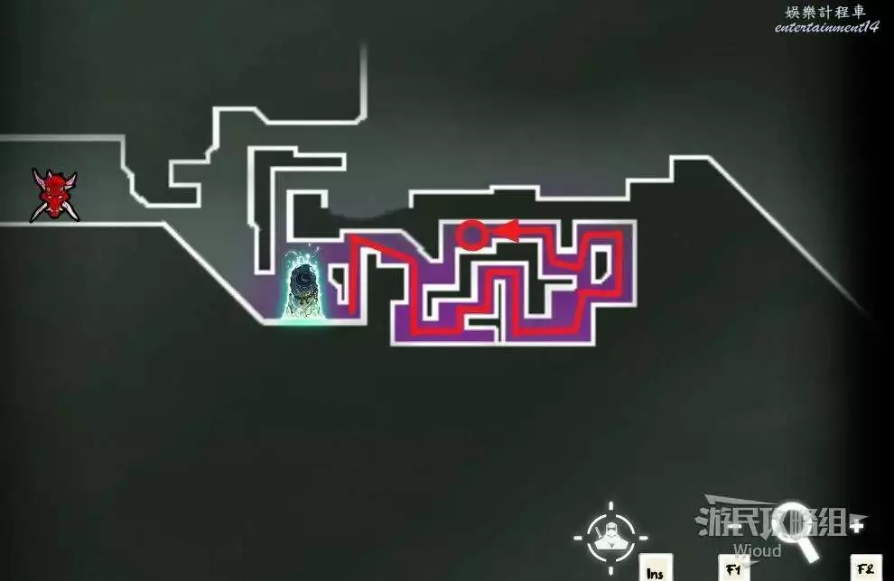 完事通過風道繼續上升跟隨藍色路線降落到地圖右下角石碑位置,繼續往左走到紅色標識2的位置,中間都是風道躲避陷阱,沒有額外機關。