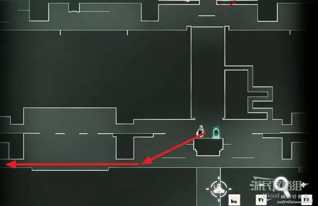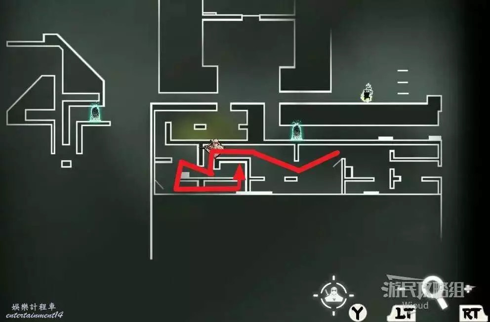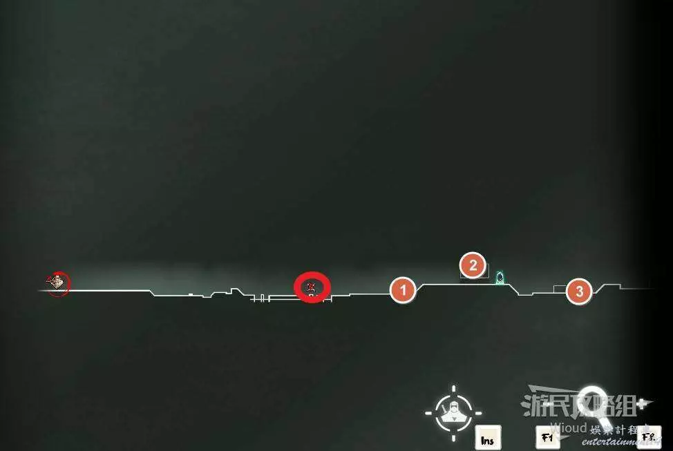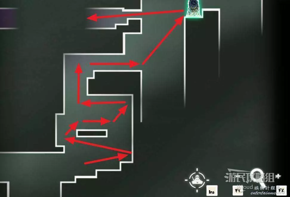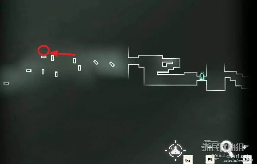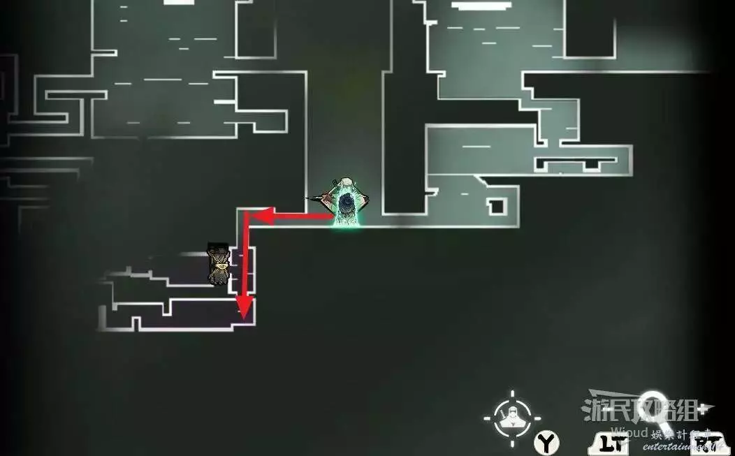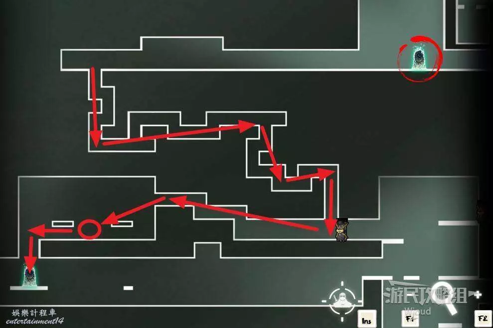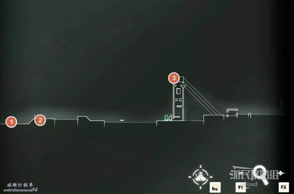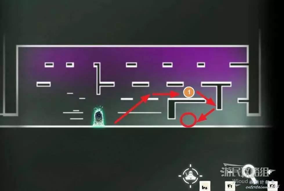 完事通過風道繼續上升跟隨藍色路線降落到地圖右下角石碑位置,繼續往左走到紅色標識2的位置,中間都是風道躲避陷阱,沒有額外機關。