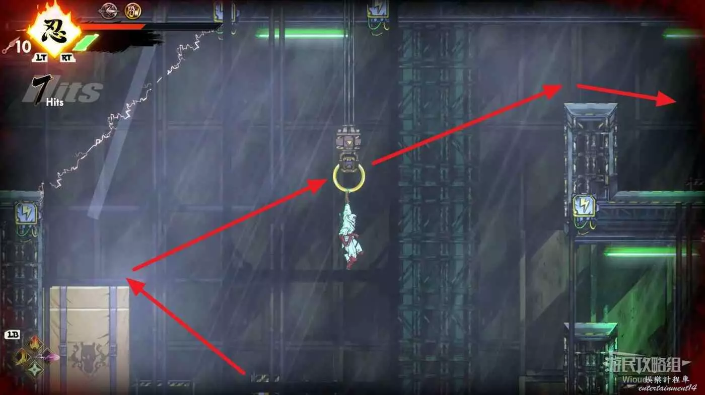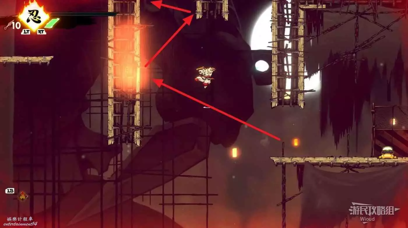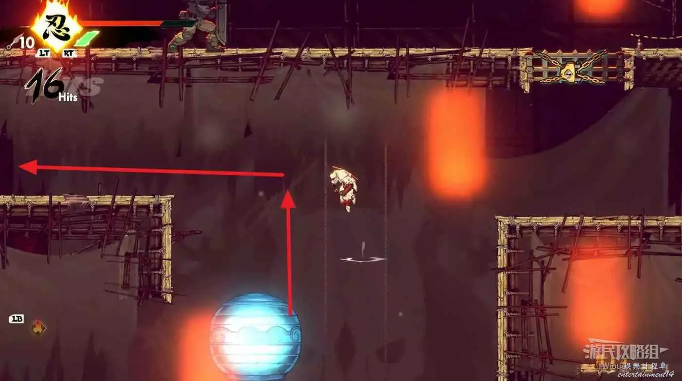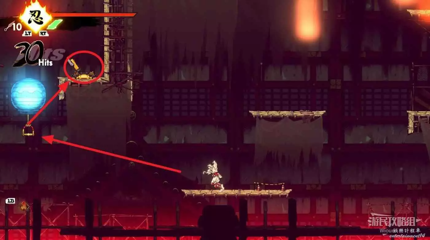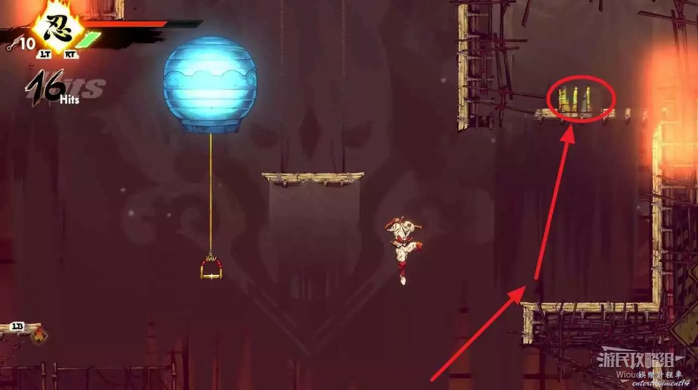 完成精英部隊的挑戰後,通過右邊的燈籠把手跳到右側第一個屋頂上,注意藍色燈籠可隨意使用,但紫色燈籠玩家站立時會慢慢往下降落,在一些機關處降落到低點會直接死亡。