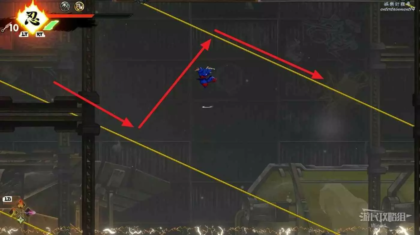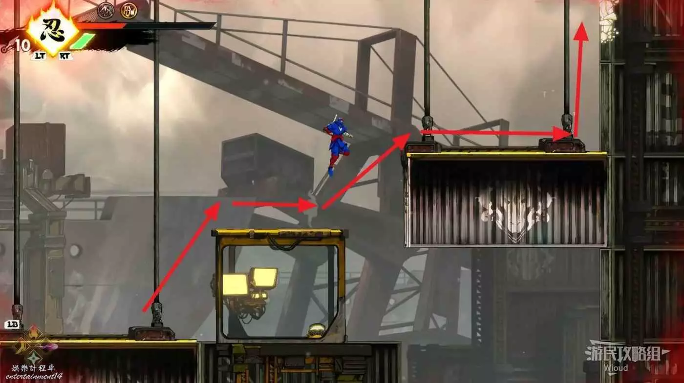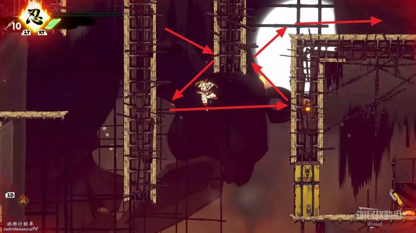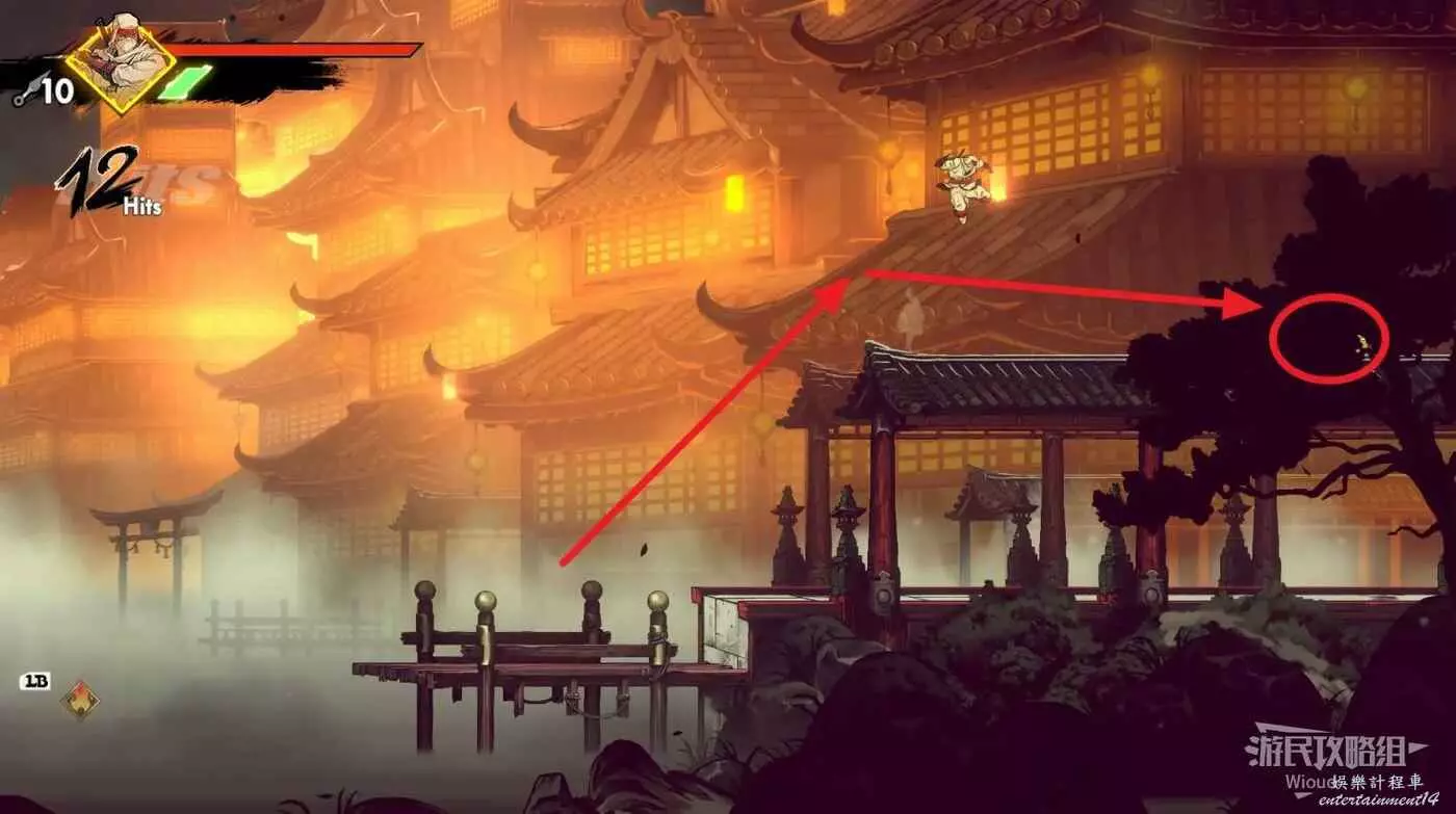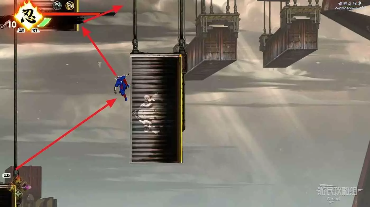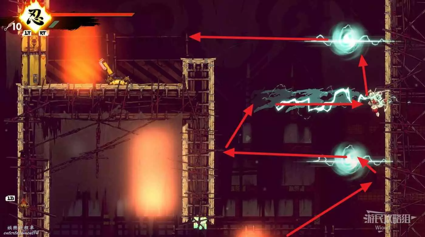 完成精英部隊的挑戰後,通過右邊的燈籠把手跳到右側第一個屋頂上,注意藍色燈籠可隨意使用,但紫色燈籠玩家站立時會慢慢往下降落,在一些機關處降落到低點會直接死亡。