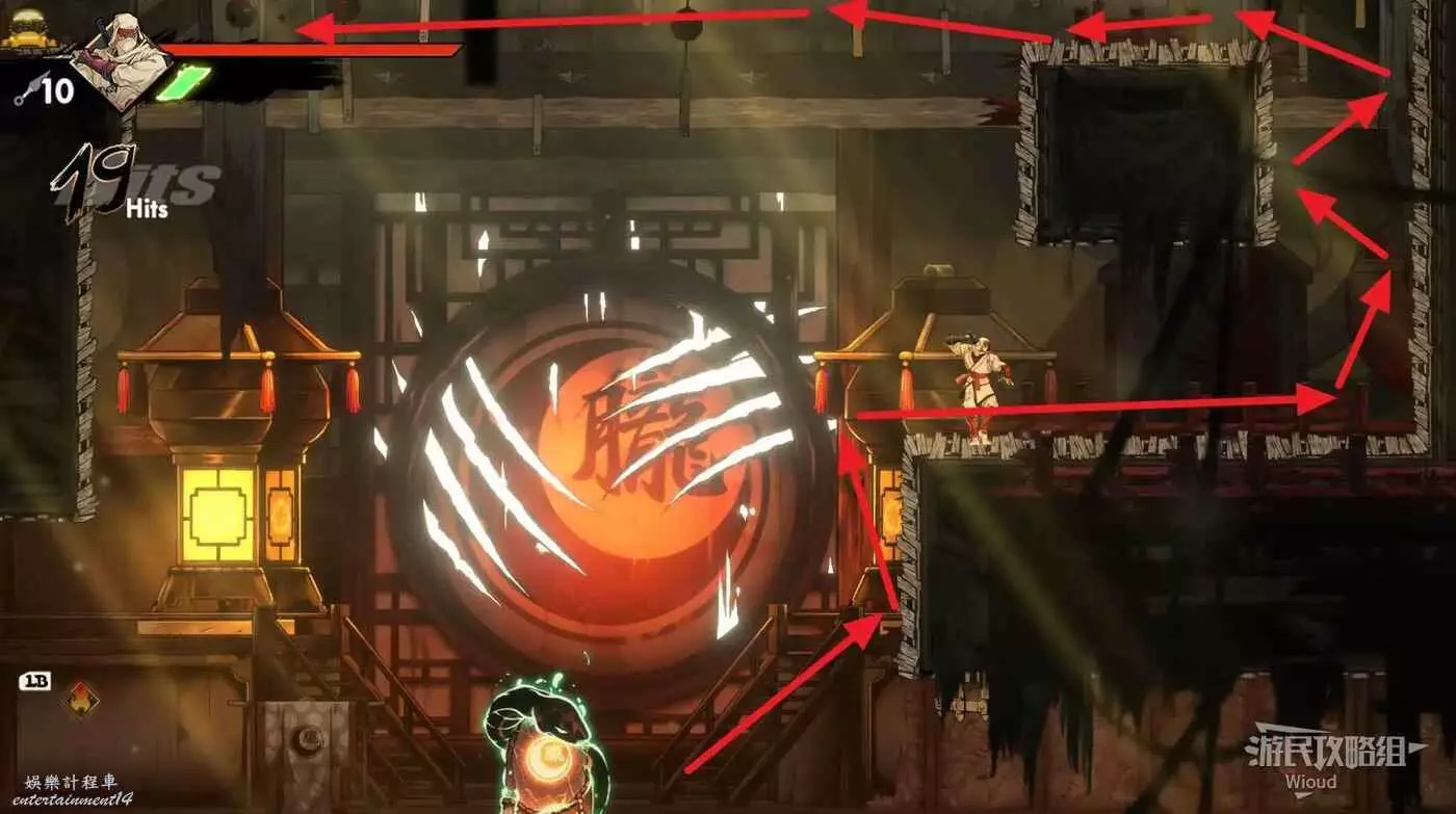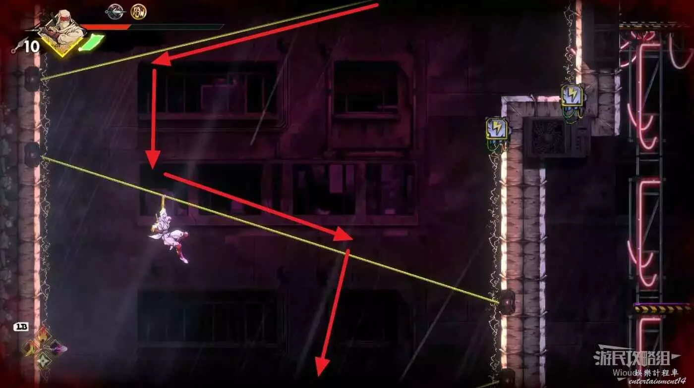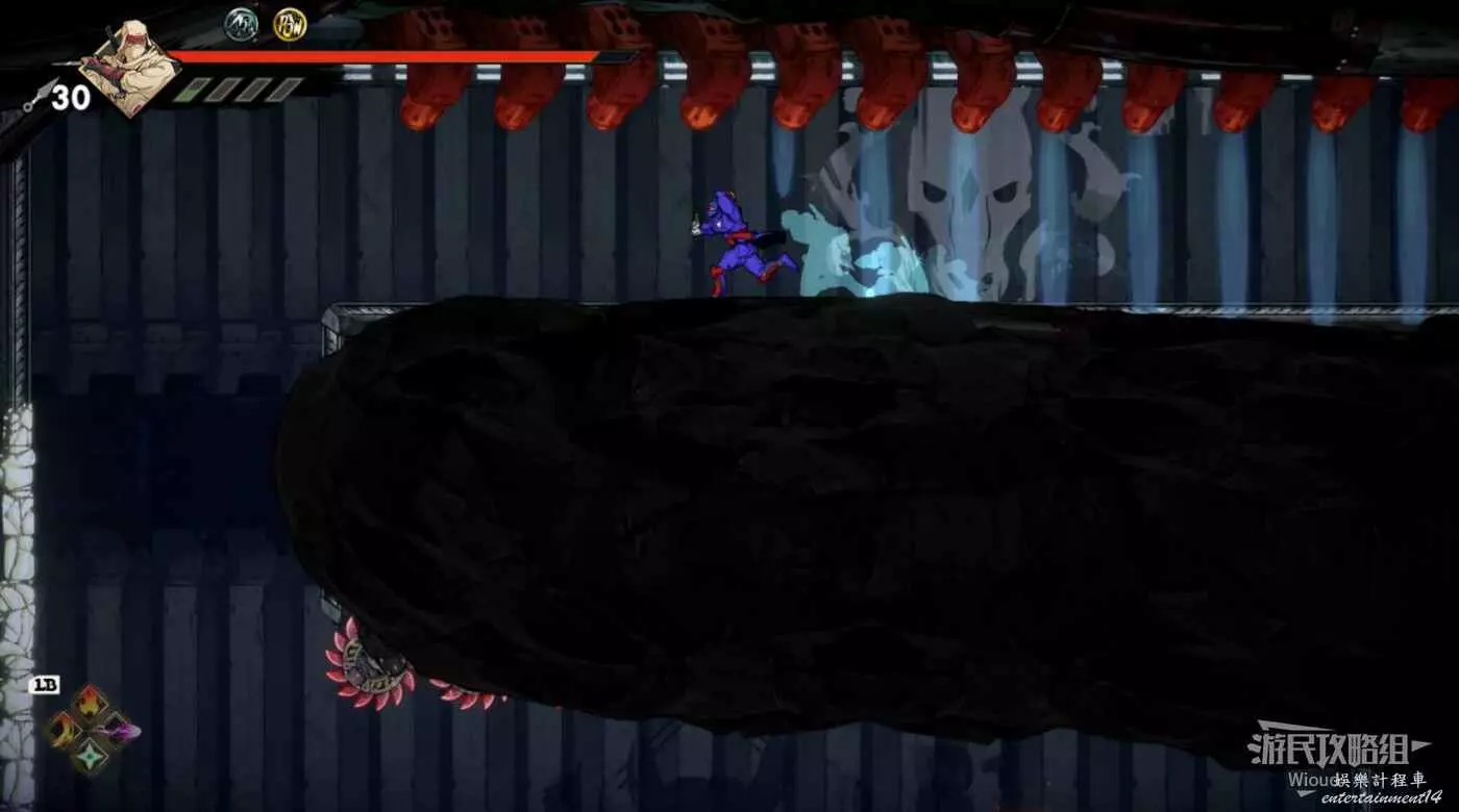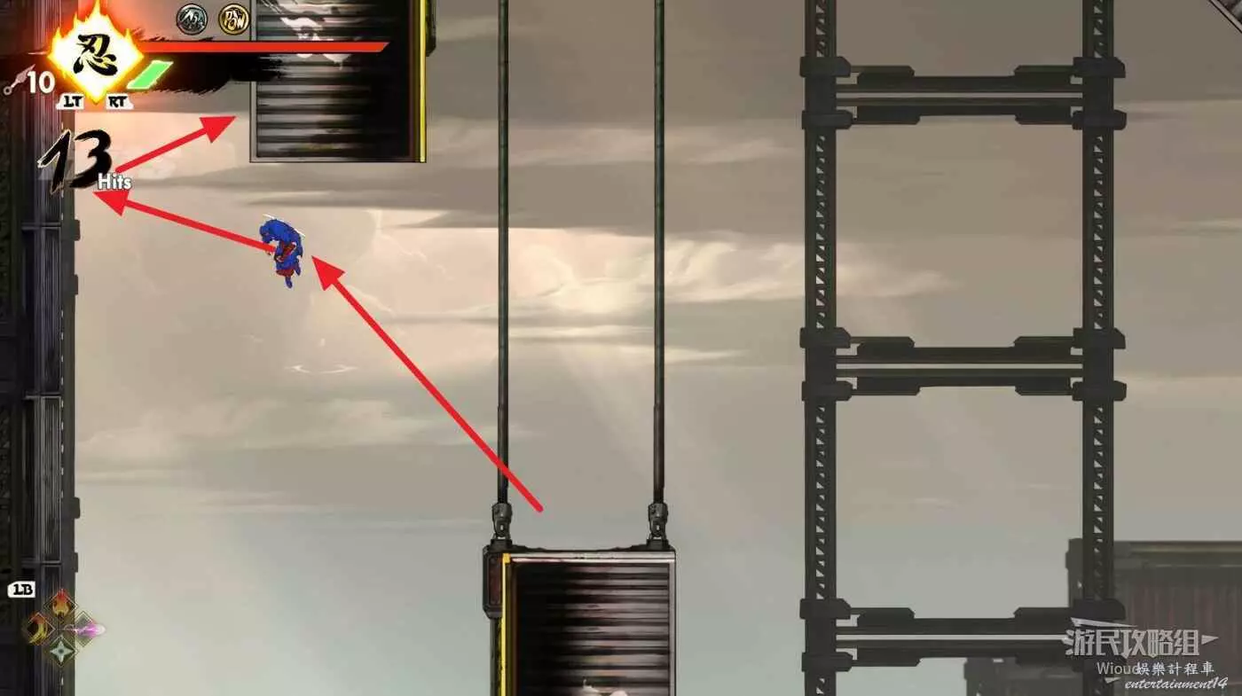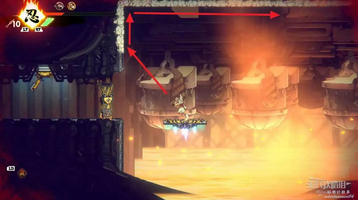 完成精英部隊的挑戰後,通過右邊的燈籠把手跳到右側第一個屋頂上,注意藍色燈籠可隨意使用,但紫色燈籠玩家站立時會慢慢往下降落,在一些機關處降落到低點會直接死亡。