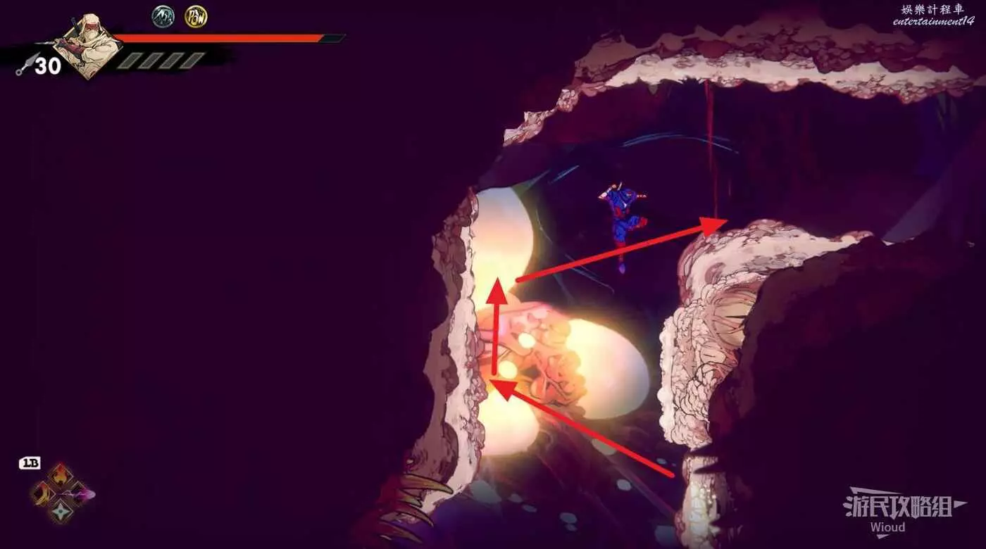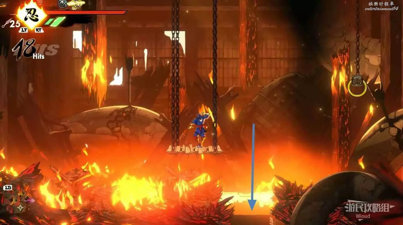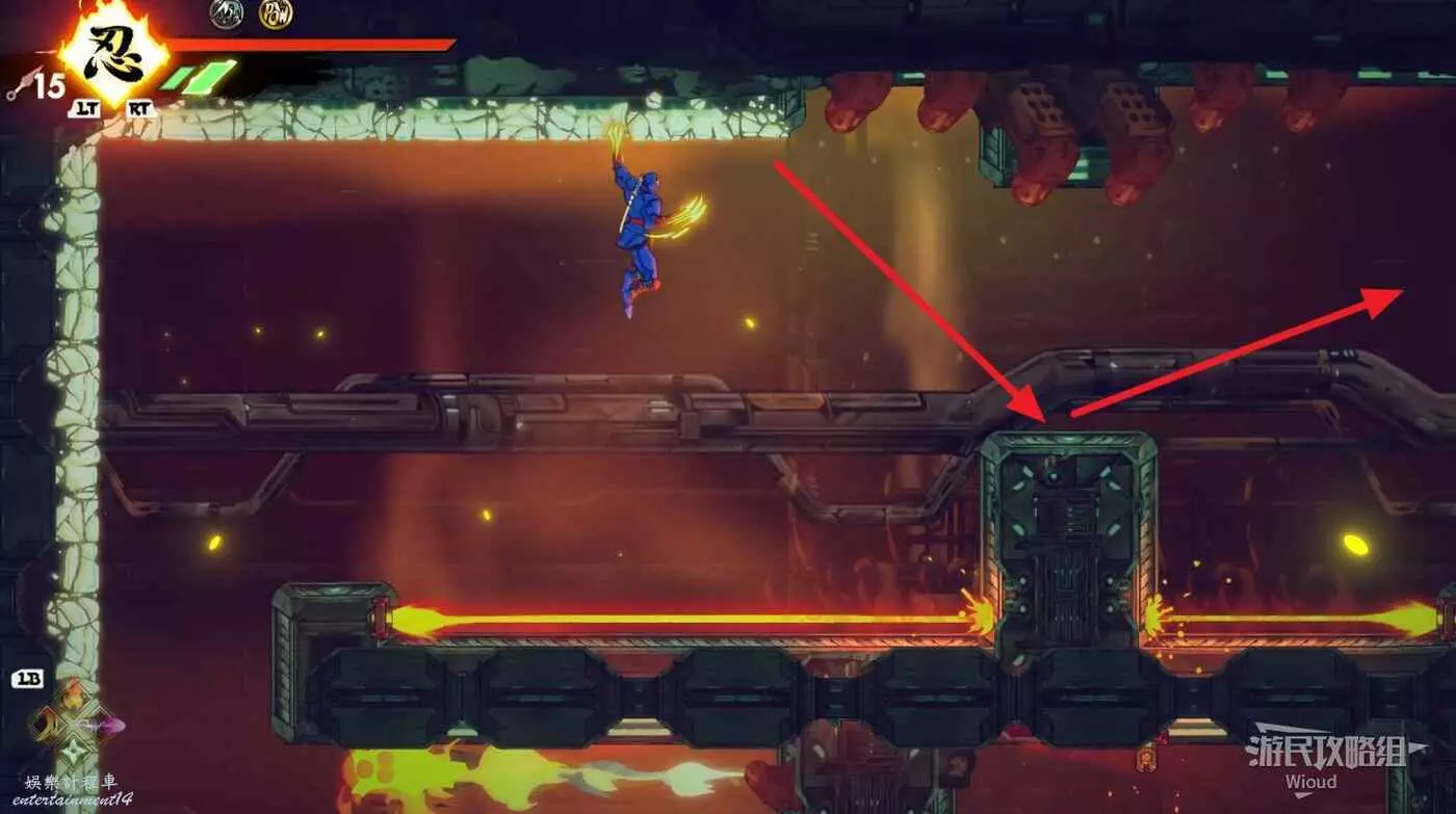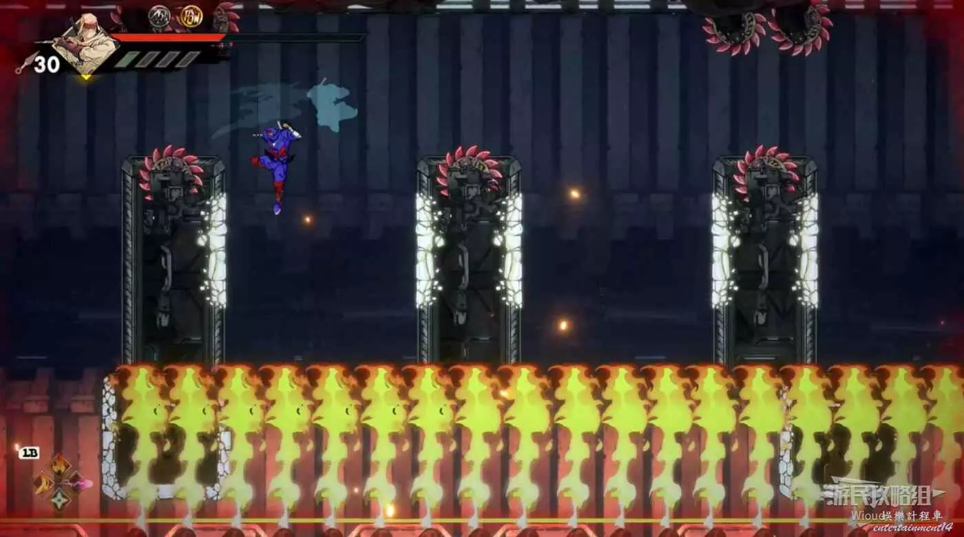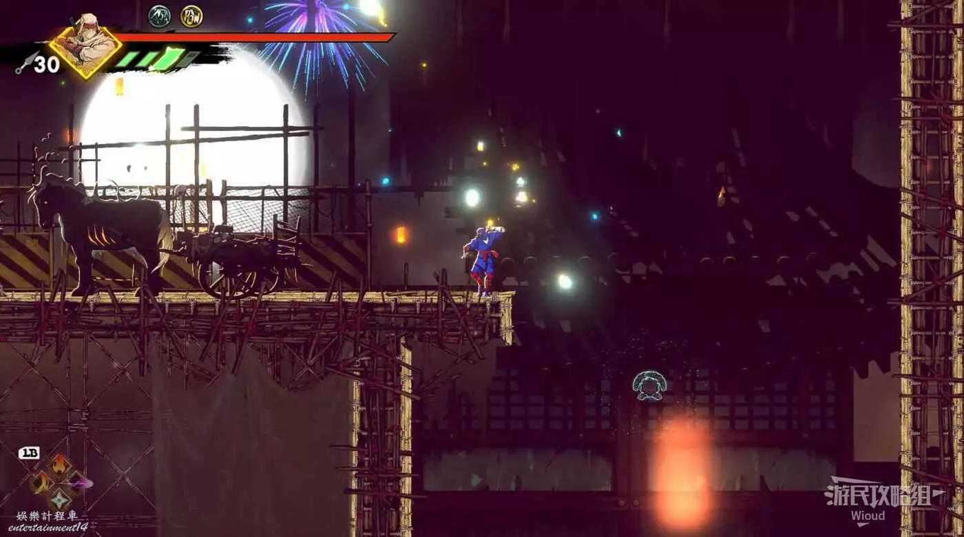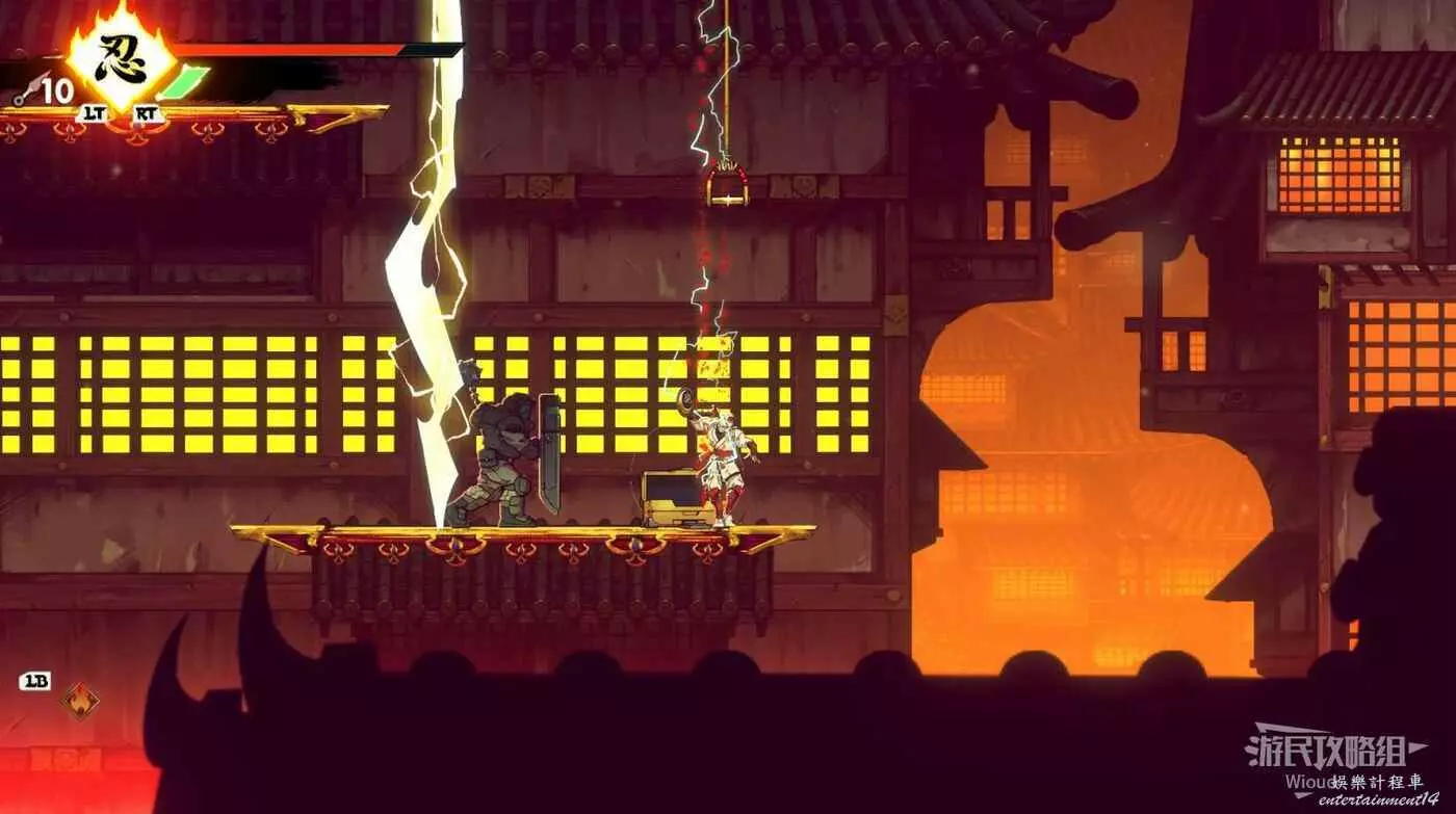 完成精英部隊的挑戰後,通過右邊的燈籠把手跳到右側第一個屋頂上,注意藍色燈籠可隨意使用,但紫色燈籠玩家站立時會慢慢往下降落,在一些機關處降落到低點會直接死亡。