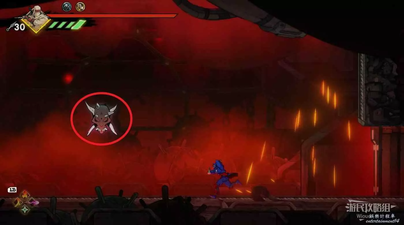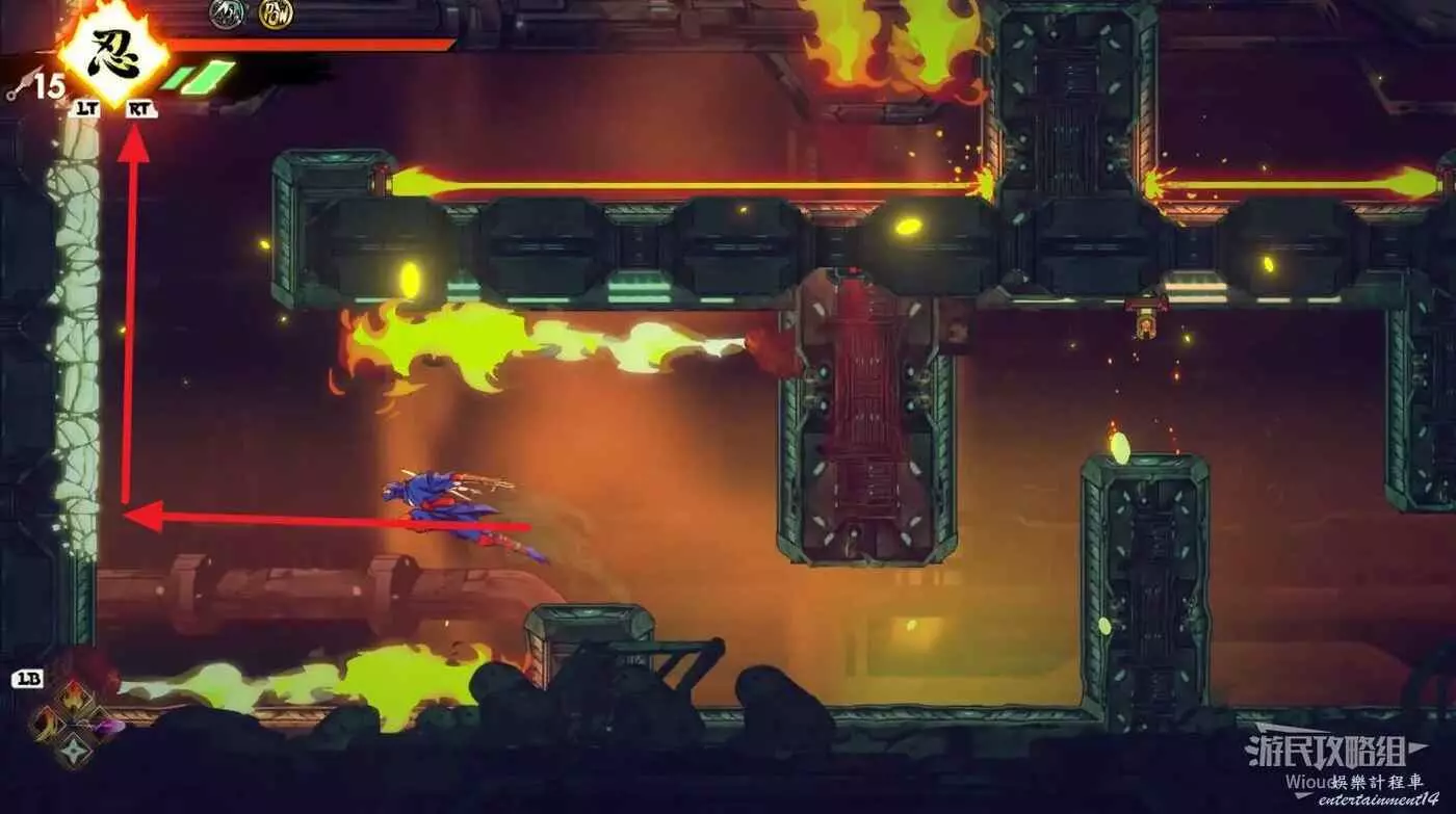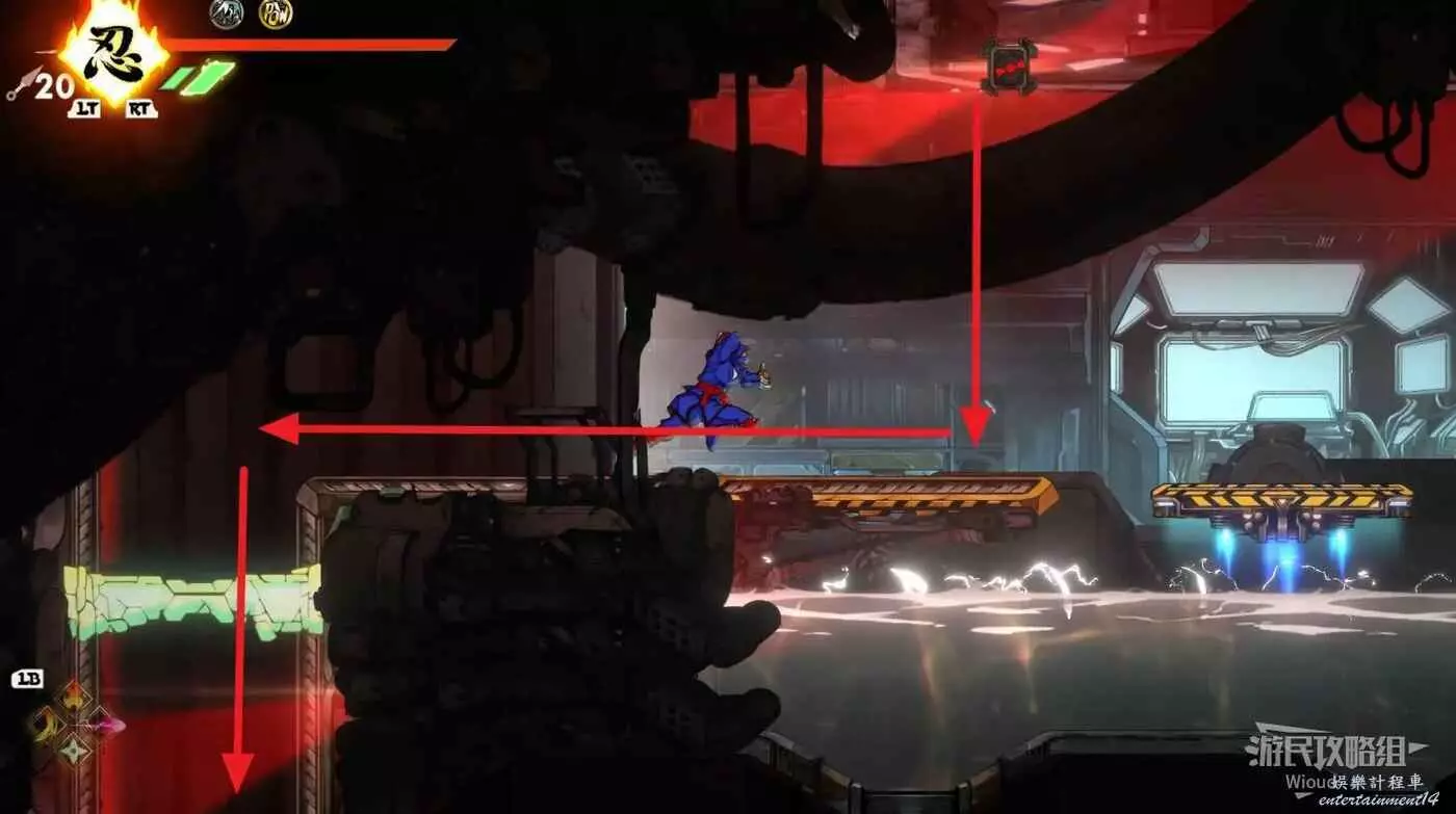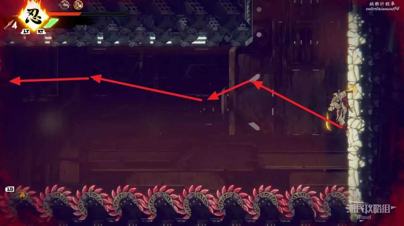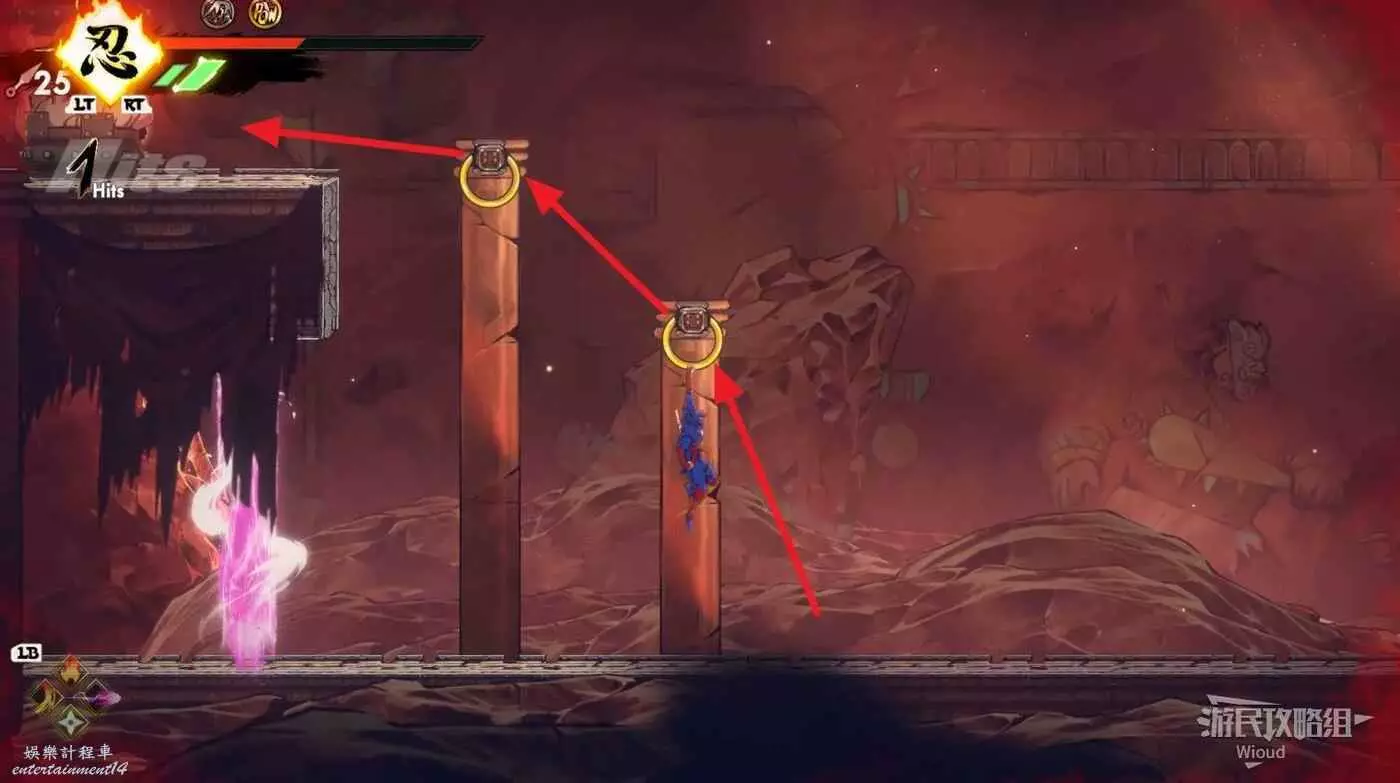 完成精英部隊的挑戰後,通過右邊的燈籠把手跳到右側第一個屋頂上,注意藍色燈籠可隨意使用,但紫色燈籠玩家站立時會慢慢往下降落,在一些機關處降落到低點會直接死亡。