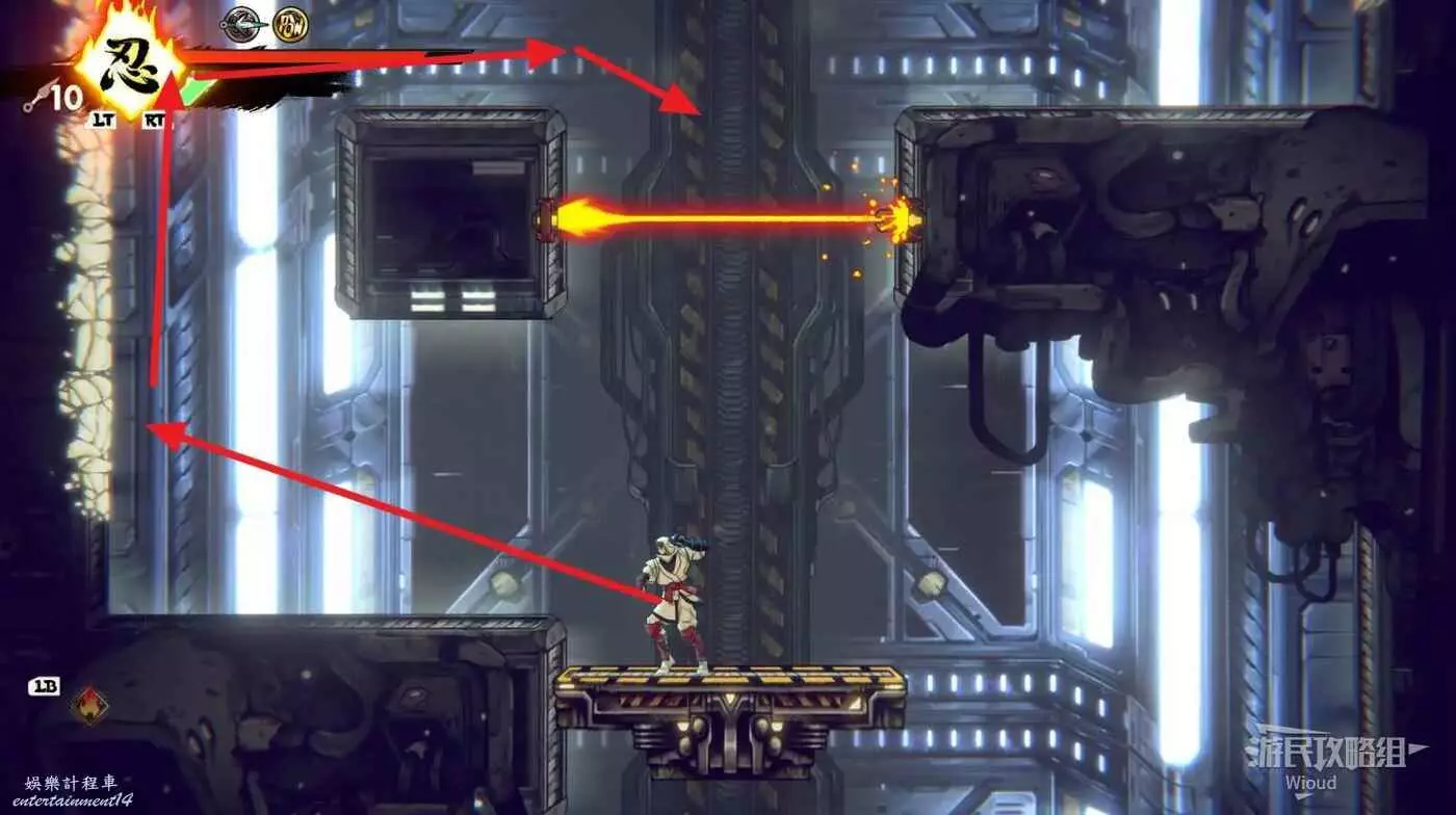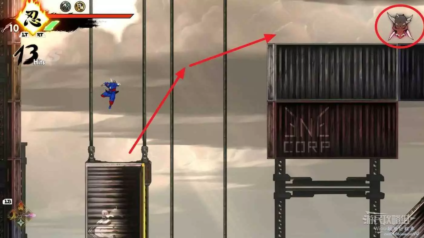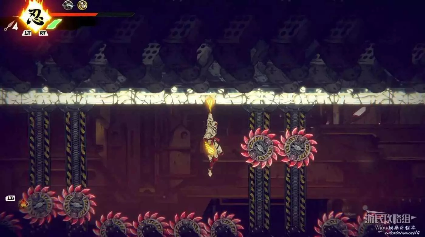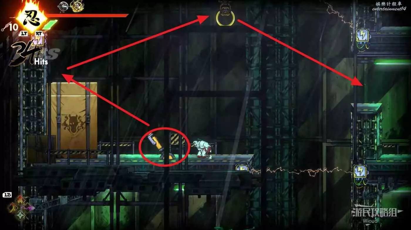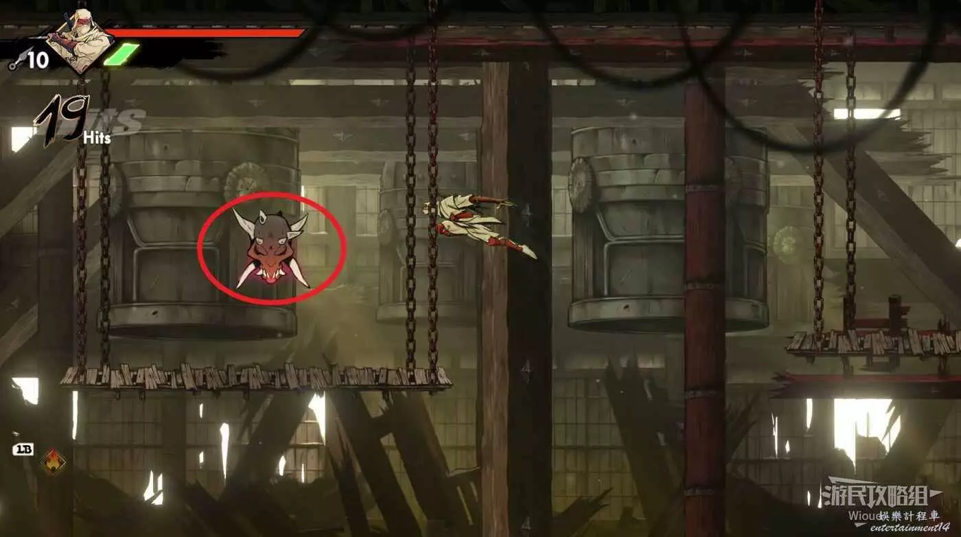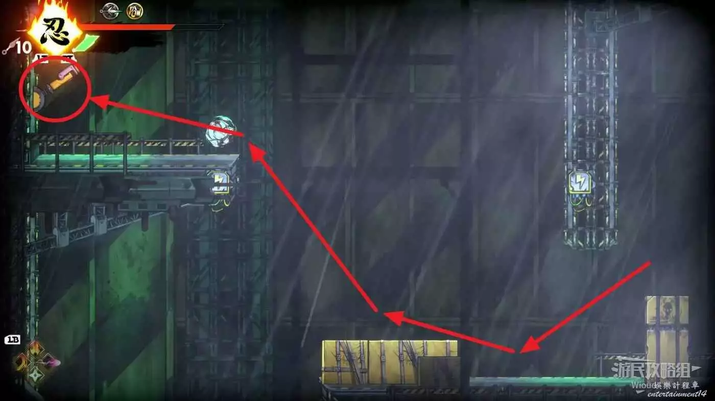 完成精英部隊的挑戰後,通過右邊的燈籠把手跳到右側第一個屋頂上,注意藍色燈籠可隨意使用,但紫色燈籠玩家站立時會慢慢往下降落,在一些機關處降落到低點會直接死亡。