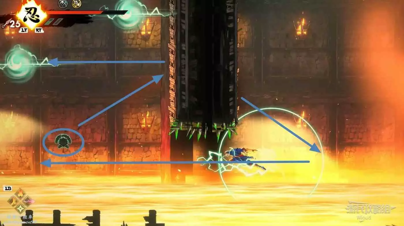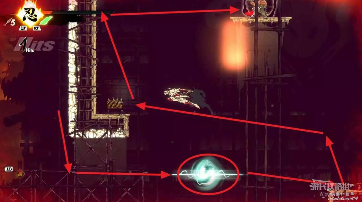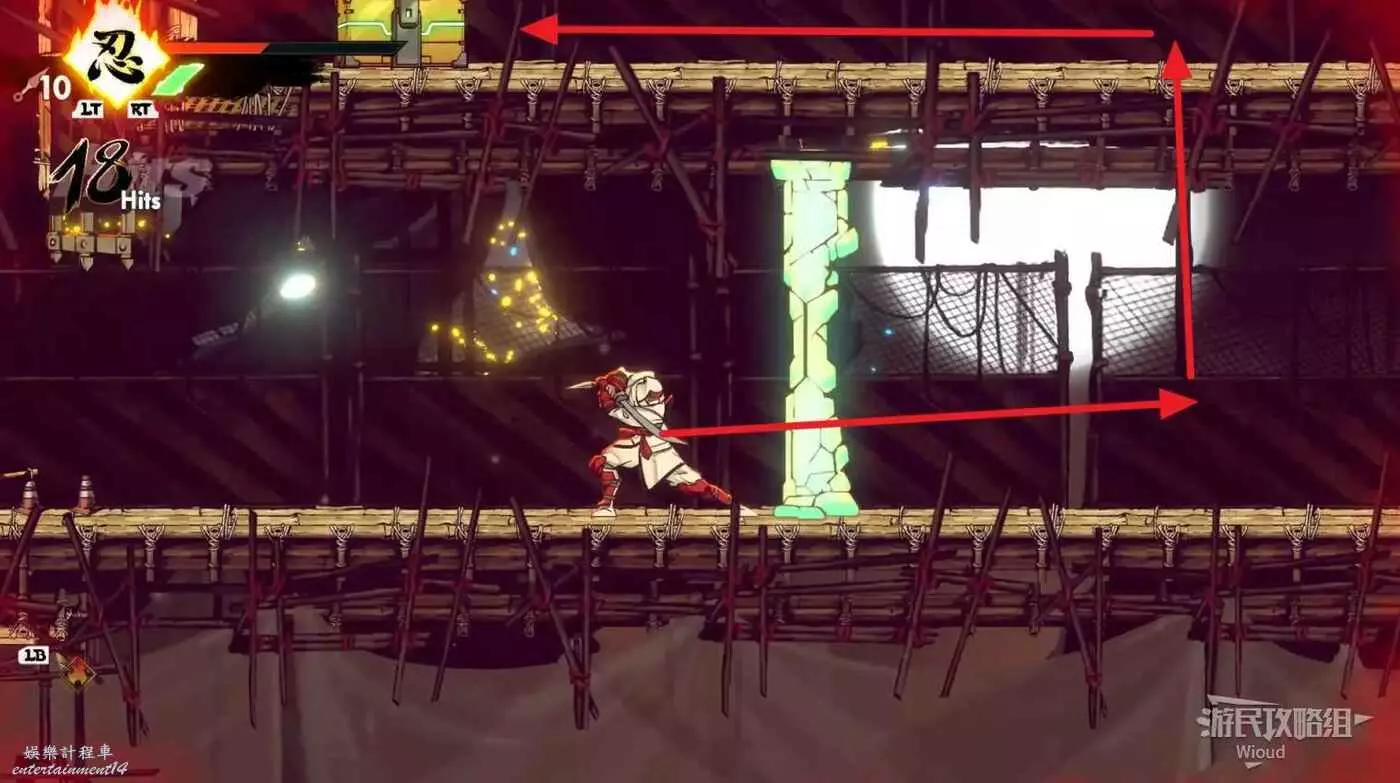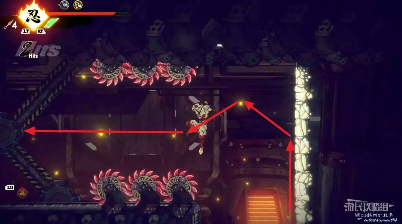 到達道場右邊會有大一片需要熟悉折返跳才能通過的區域,先跳到一側牆壁並往另一側跳躍,主角可以通過這種折返跳到高處。