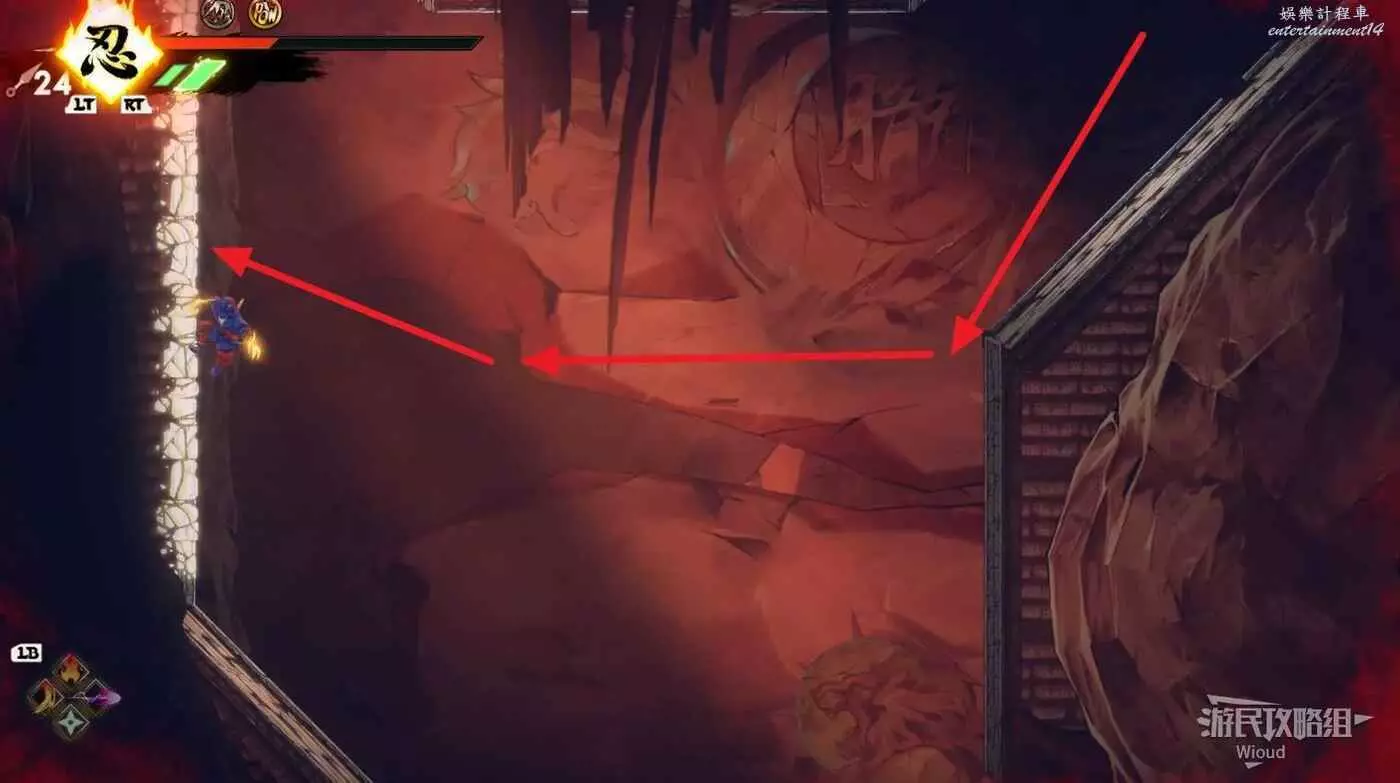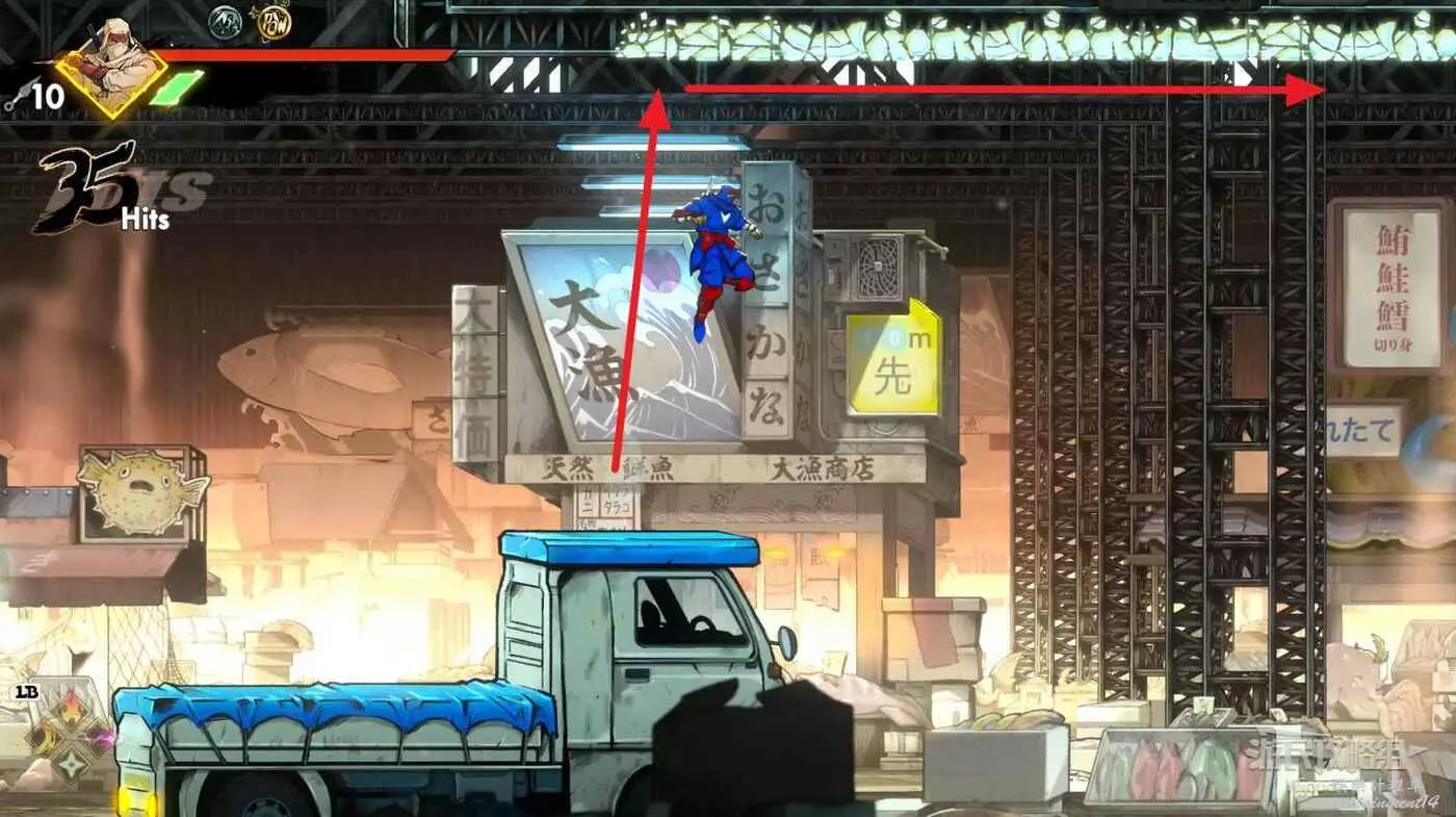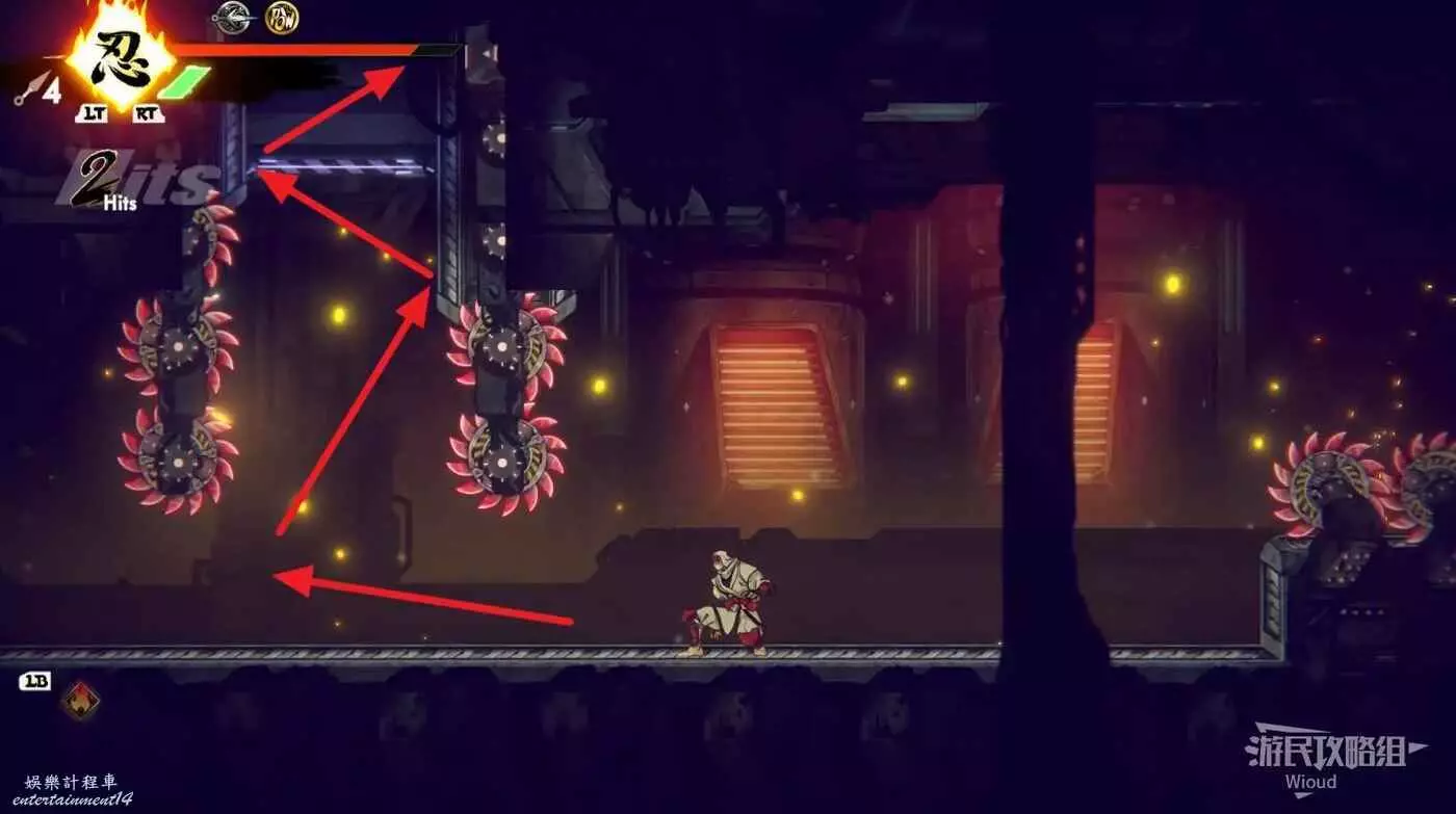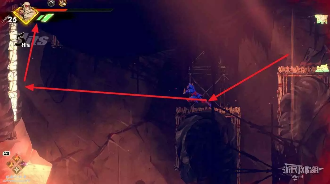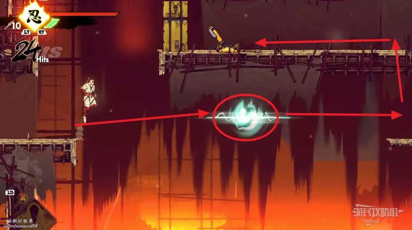 到達道場右邊會有大一片需要熟悉折返跳才能通過的區域,先跳到一側牆壁並往另一側跳躍,主角可以通過這種折返跳到高處。