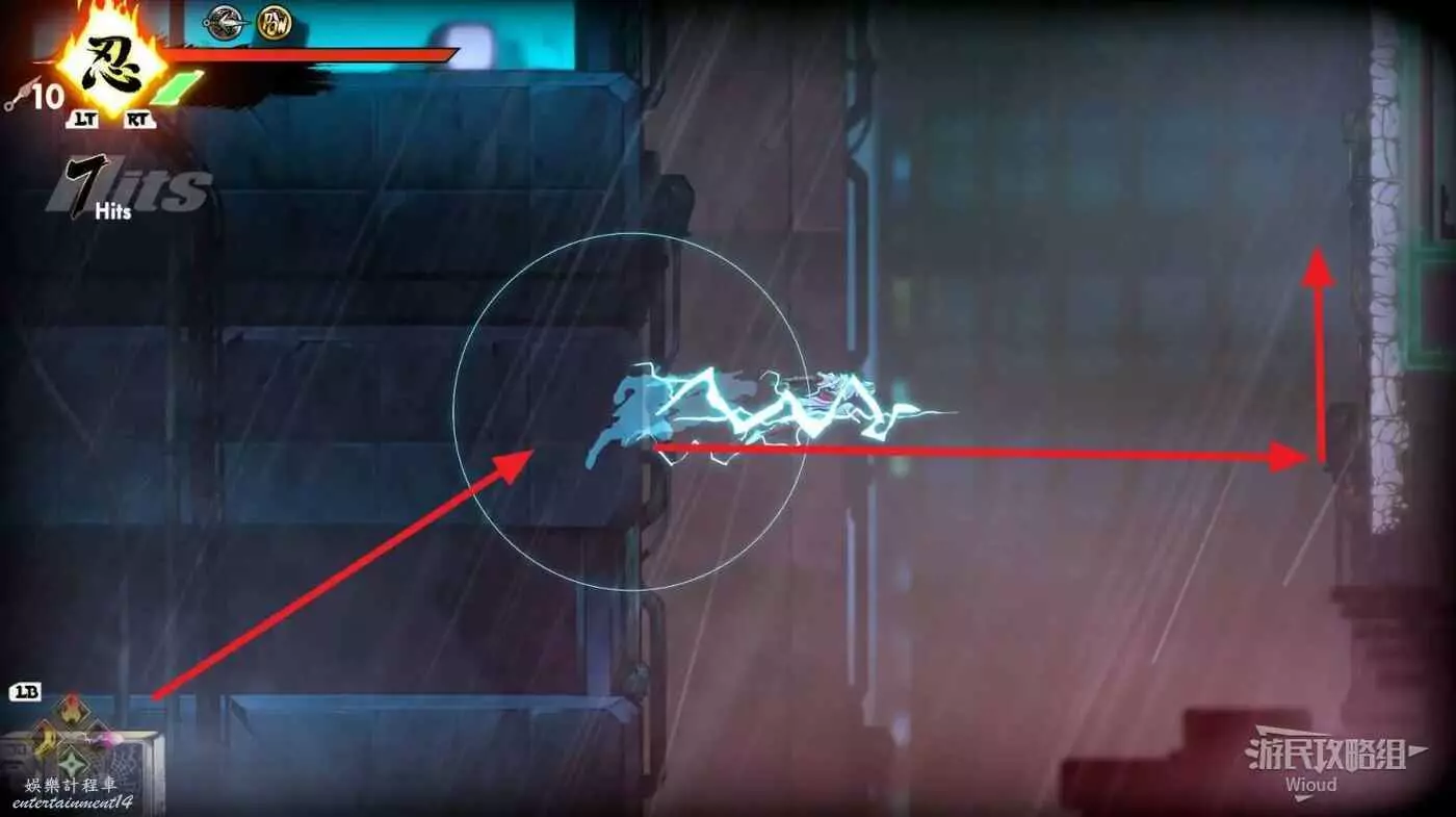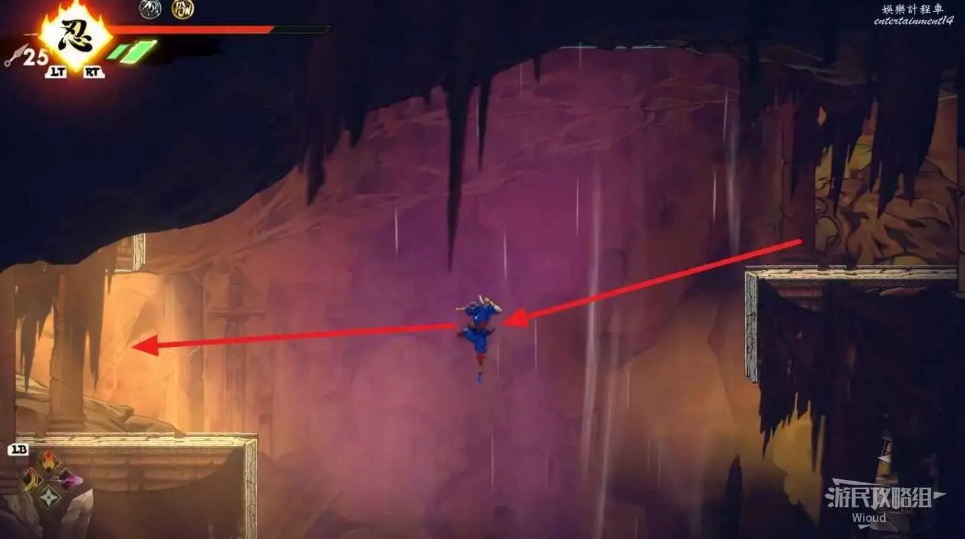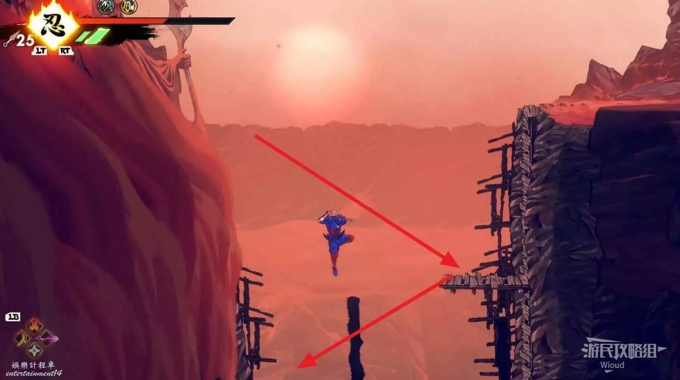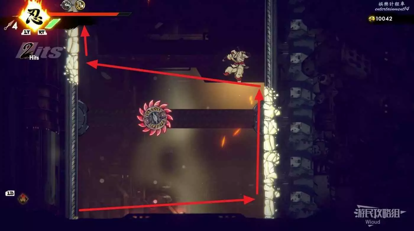 到達道場右邊會有大一片需要熟悉折返跳才能通過的區域,先跳到一側牆壁並往另一側跳躍,主角可以通過這種折返跳到高處。