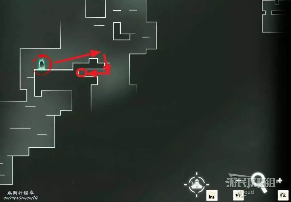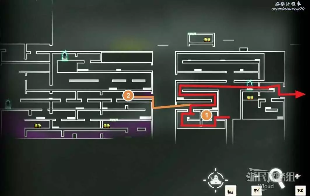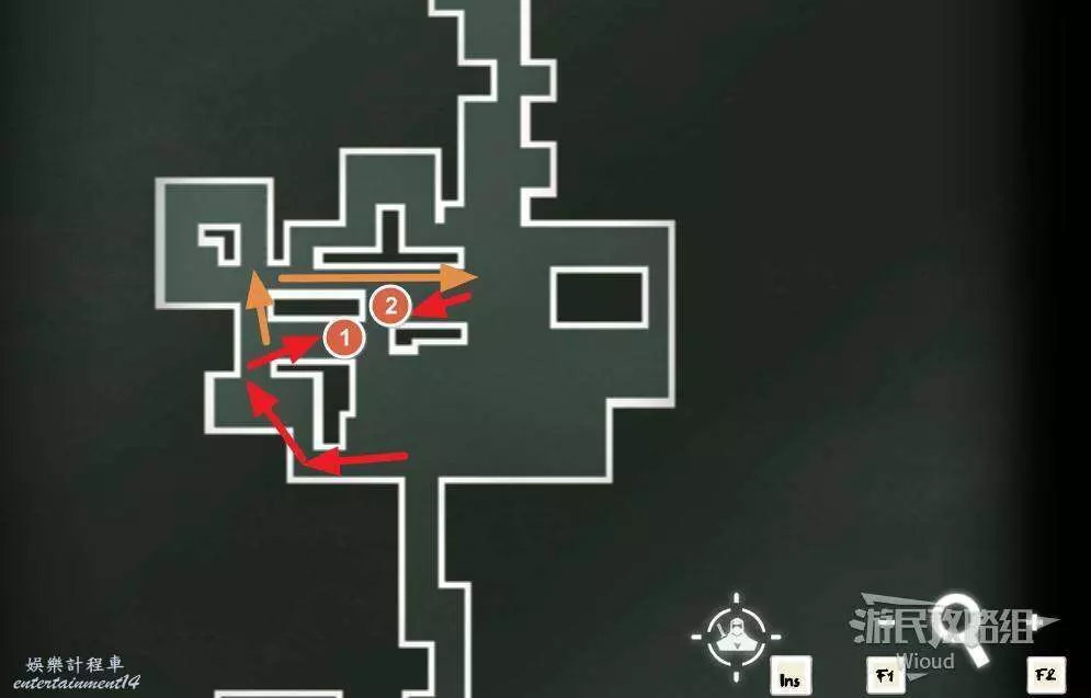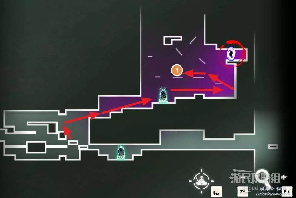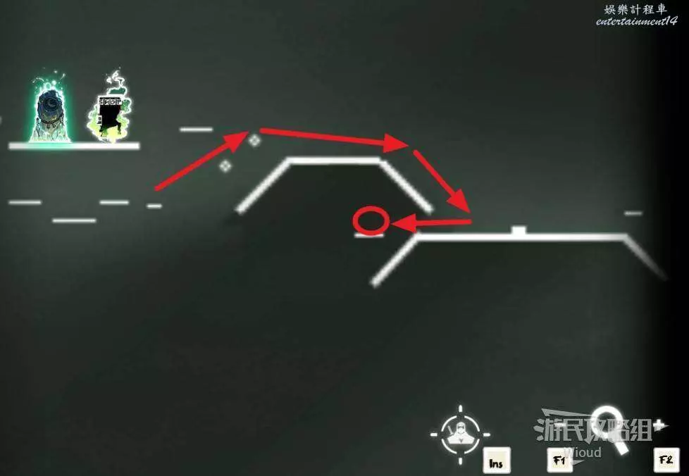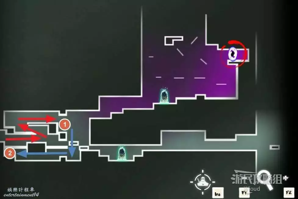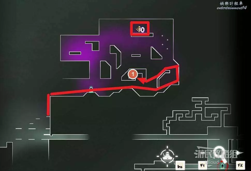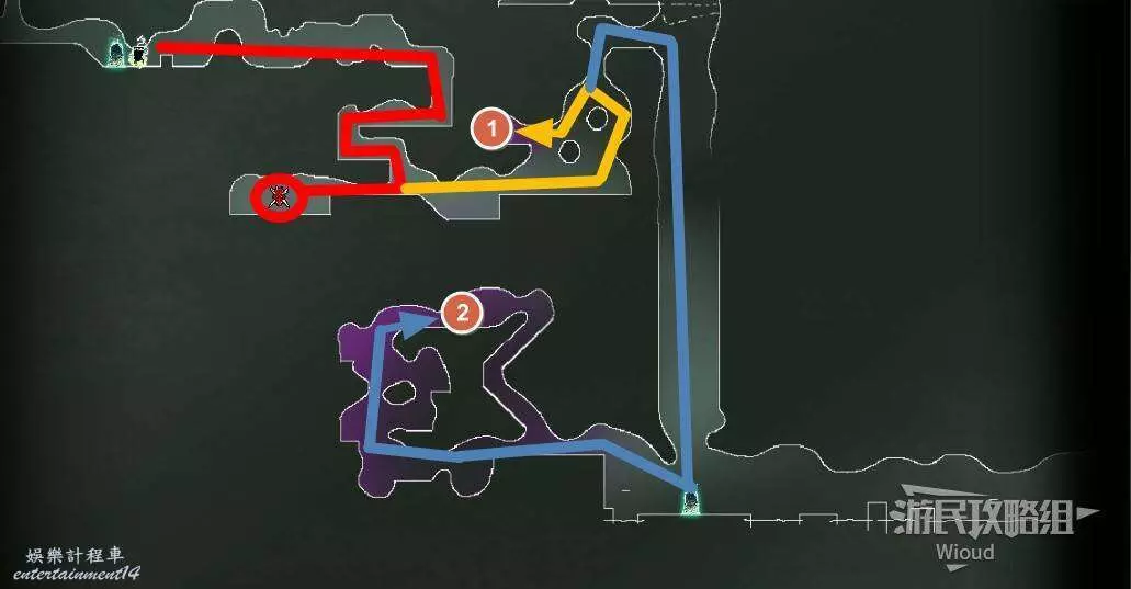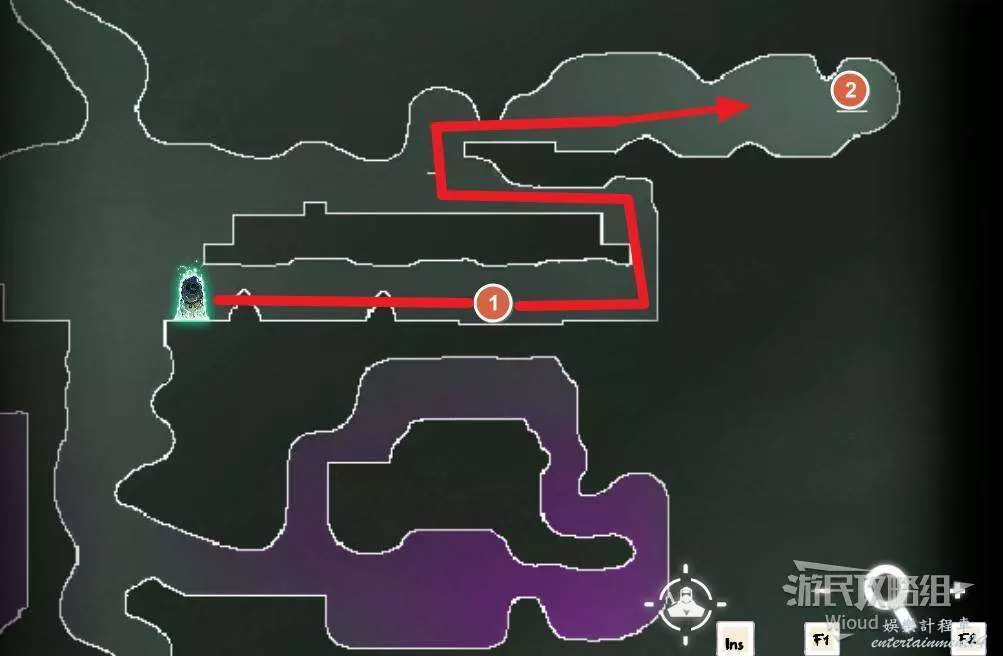 先往石碑右邊走,沿著下圖紅色路線走到右上角,中間的紅色標識1-2代表此處的兩個膿包。
