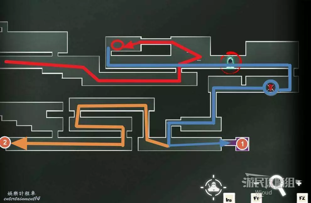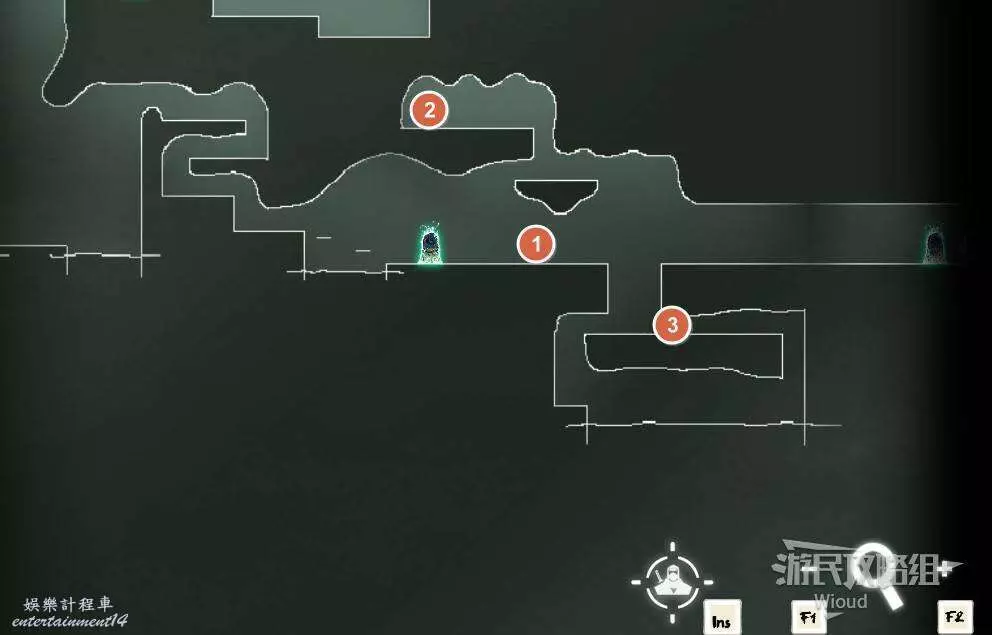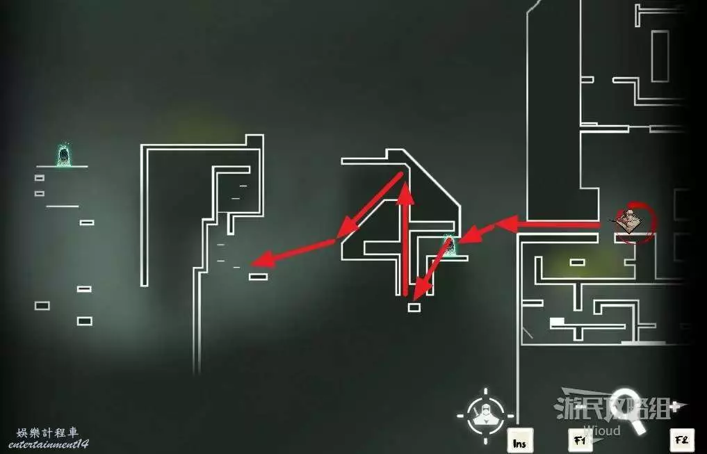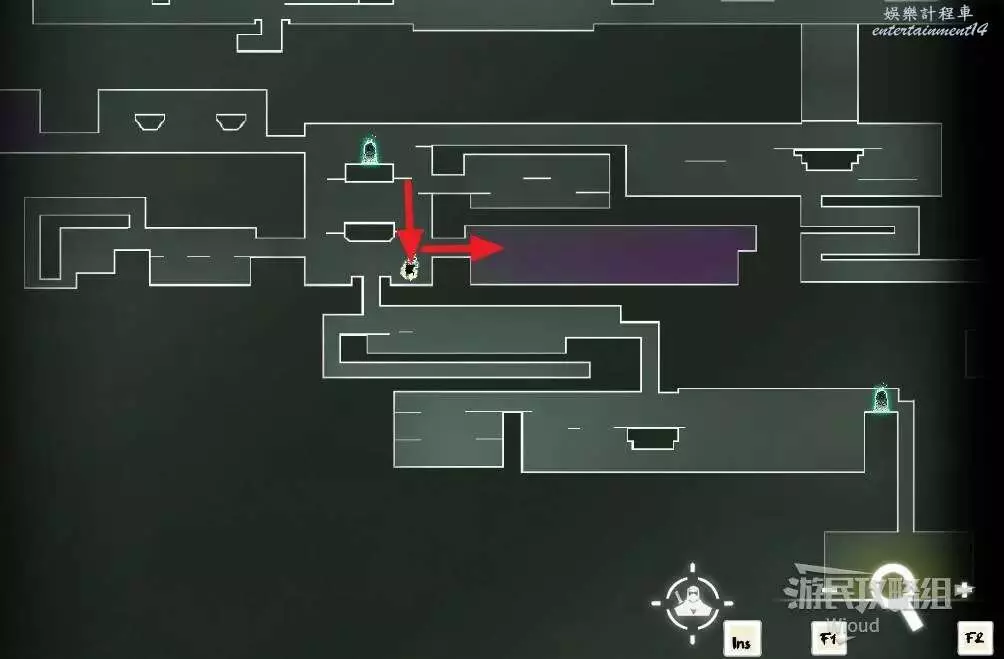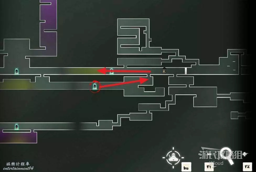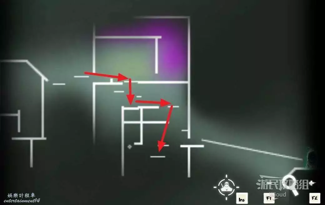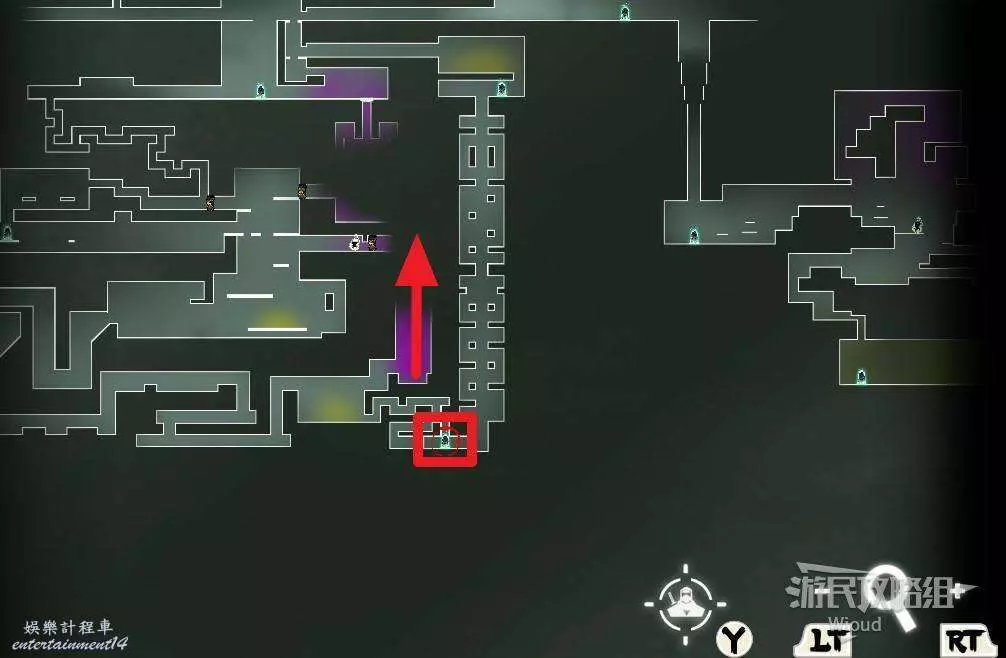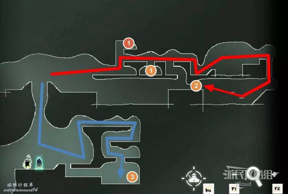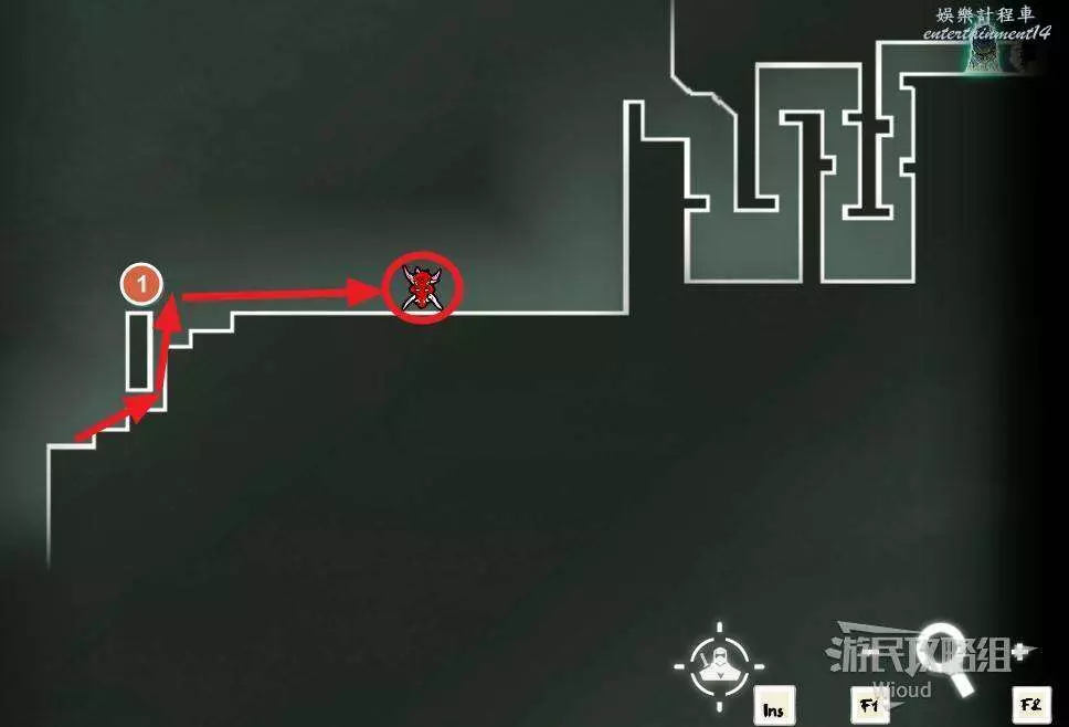 先往石碑右邊走,沿著下圖紅色路線走到右上角,中間的紅色標識1-2代表此處的兩個膿包。