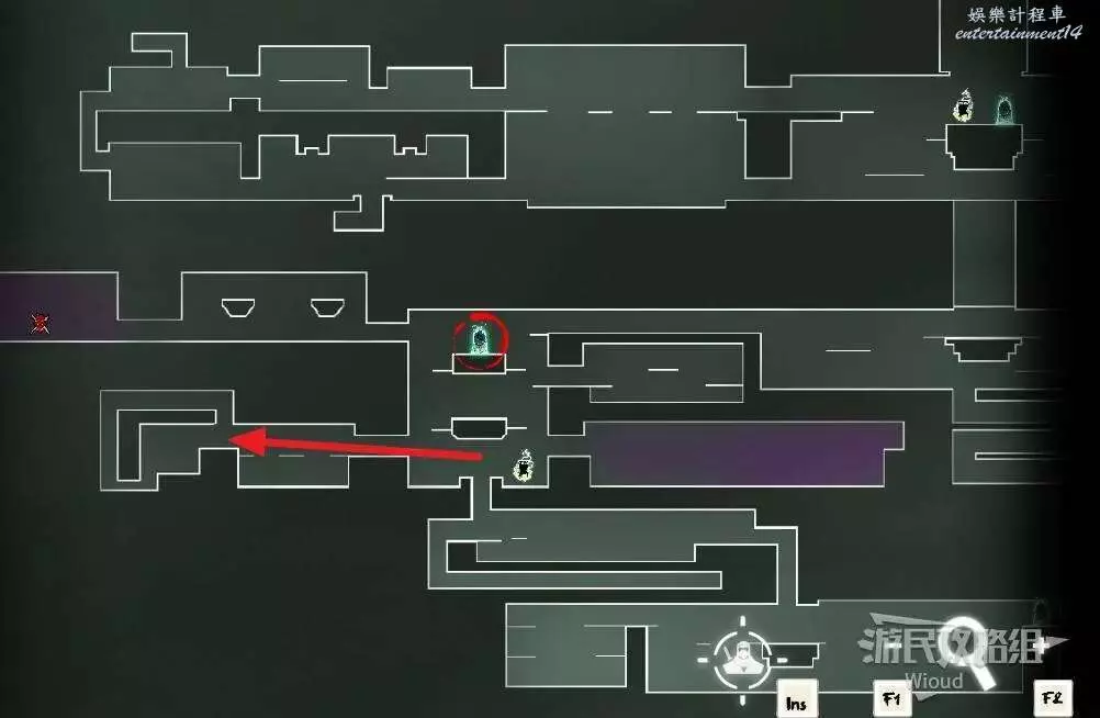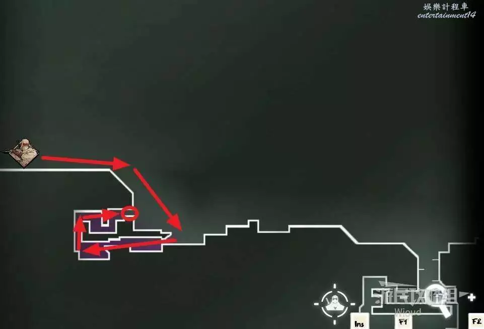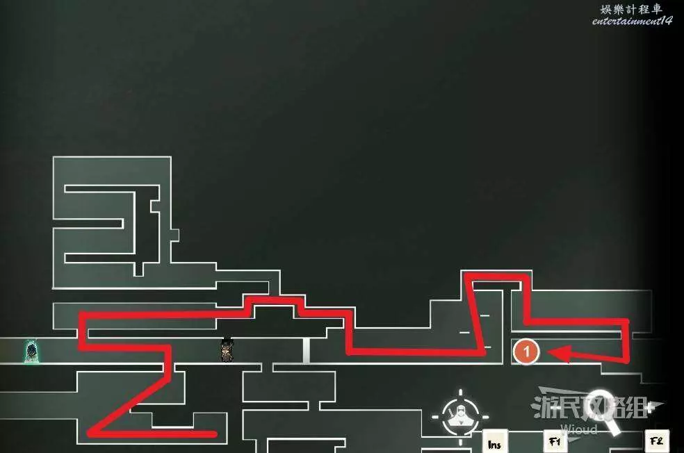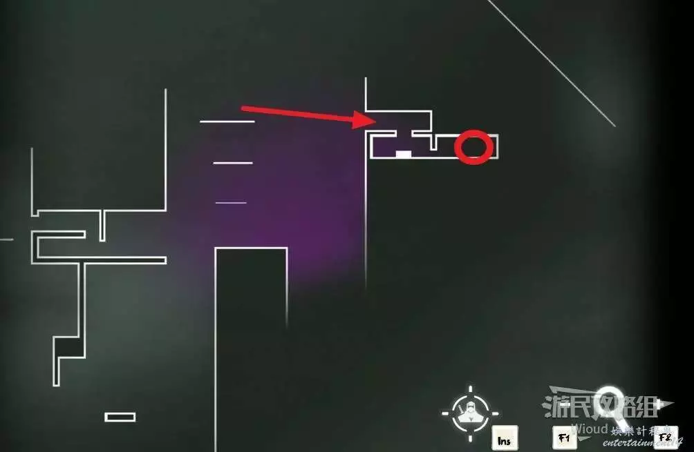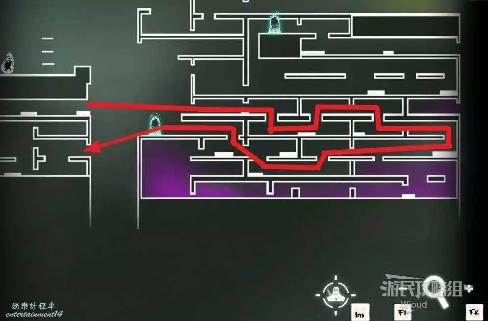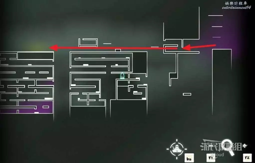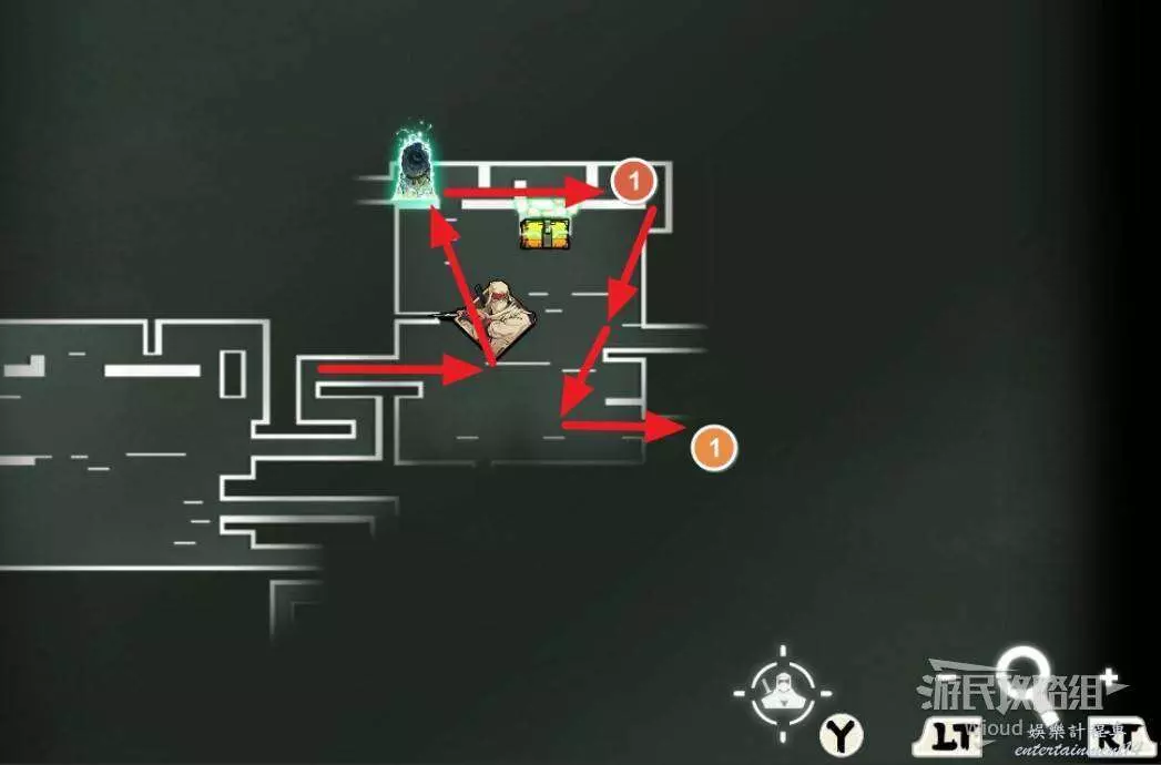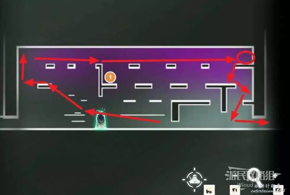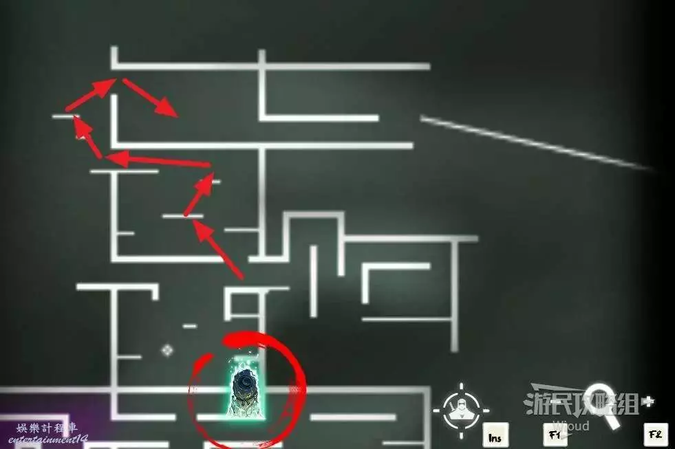 先往石碑右邊走,沿著下圖紅色路線走到右上角,中間的紅色標識1-2代表此處的兩個膿包。