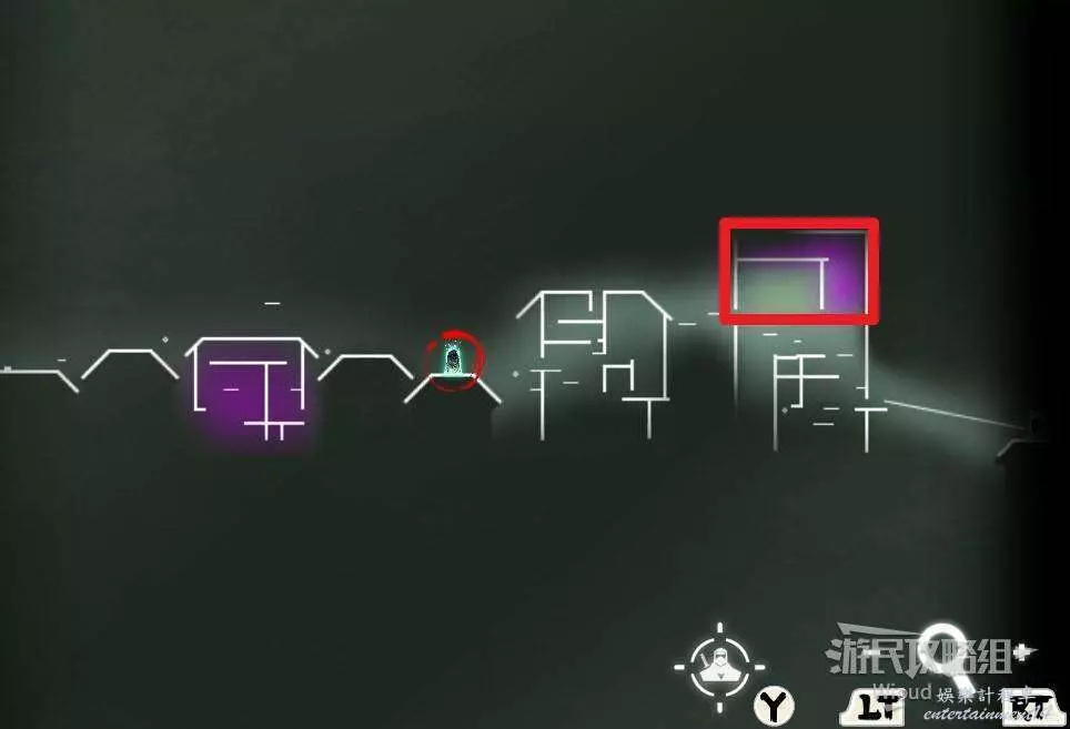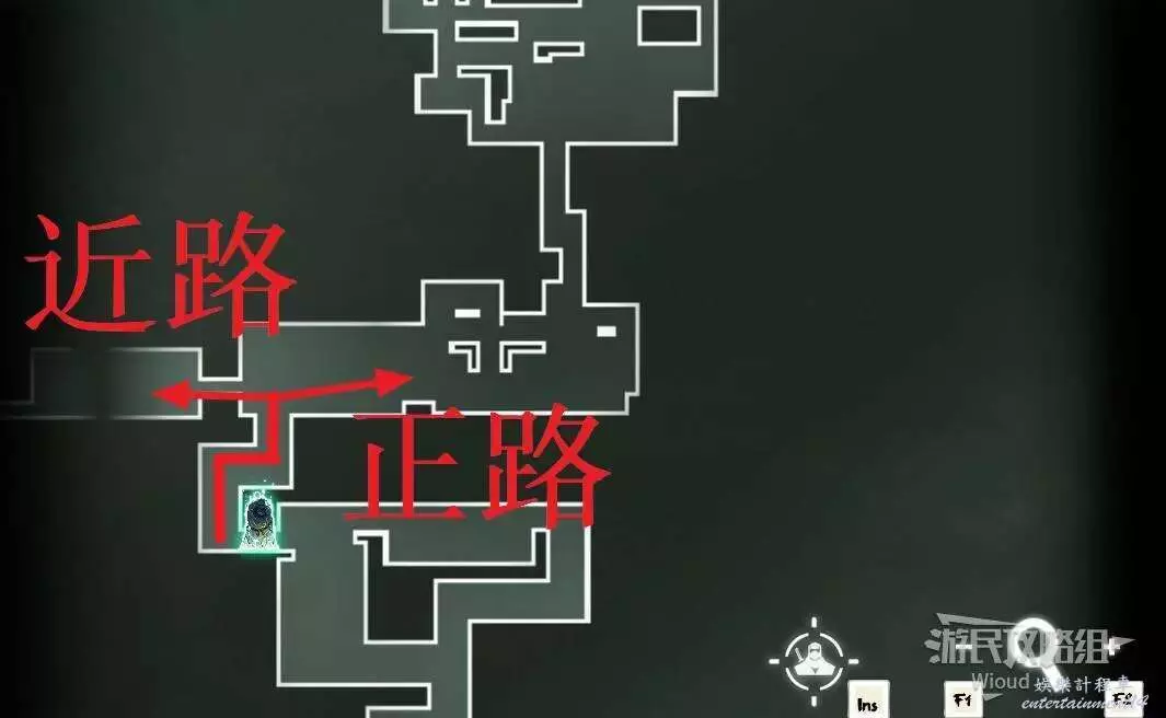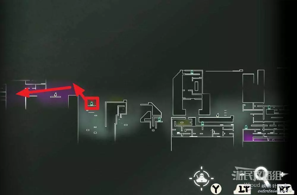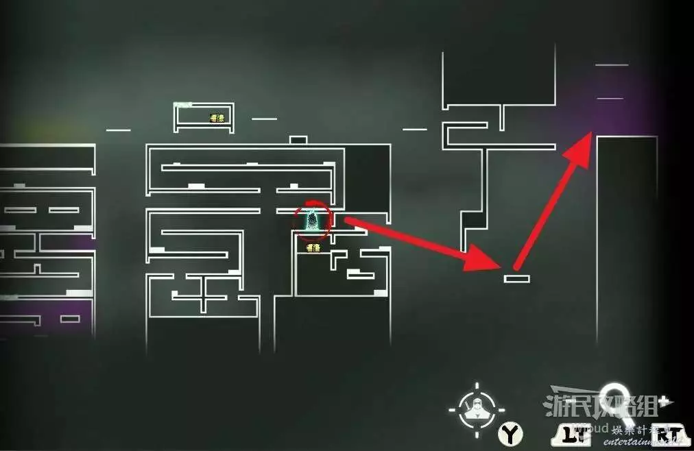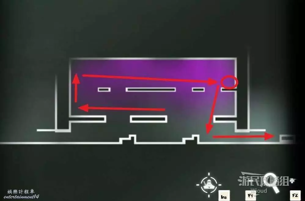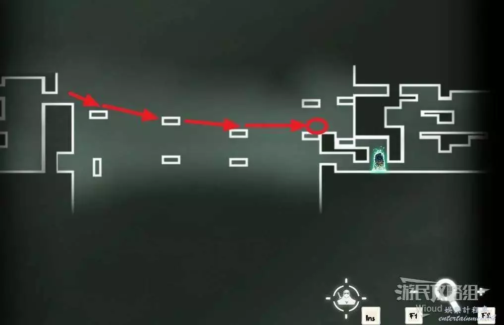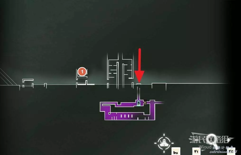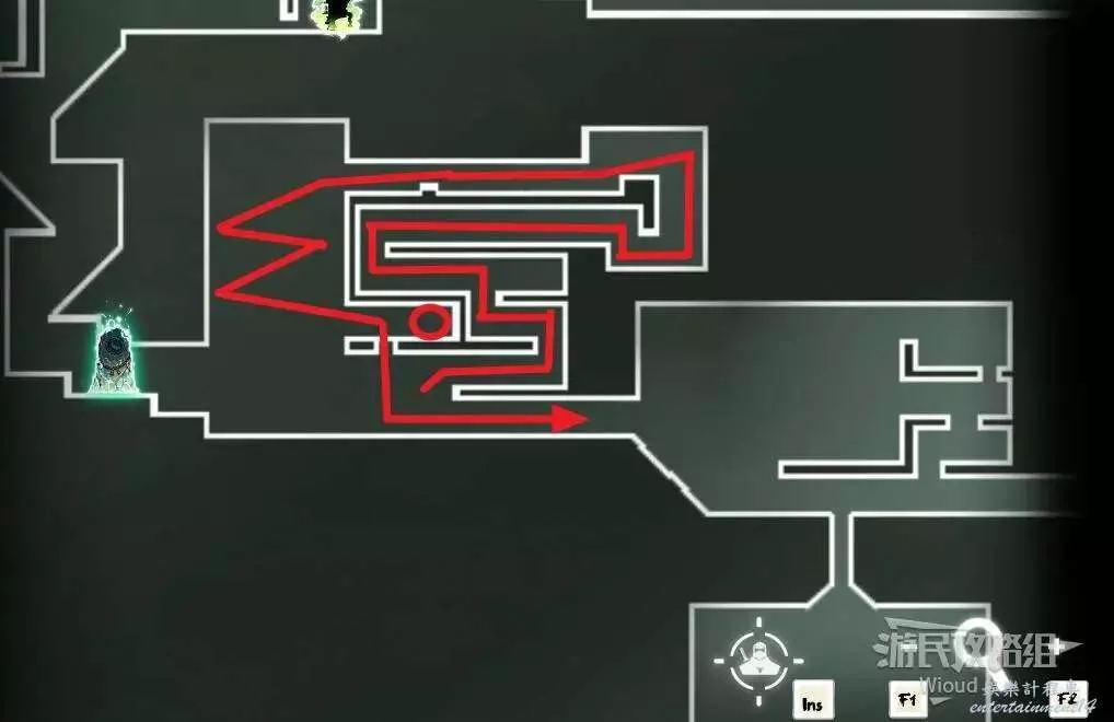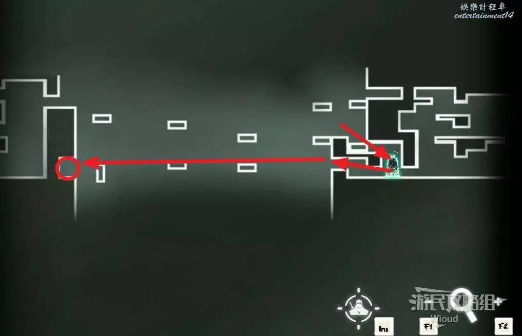 先往石碑右邊走,沿著下圖紅色路線走到右上角,中間的紅色標識1-2代表此處的兩個膿包。