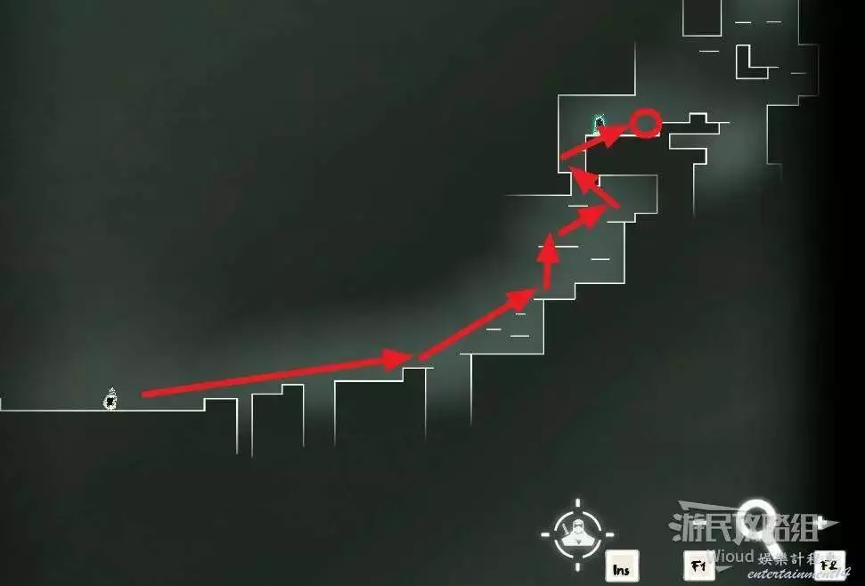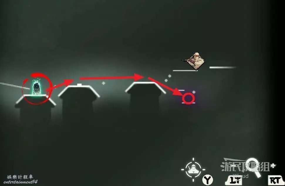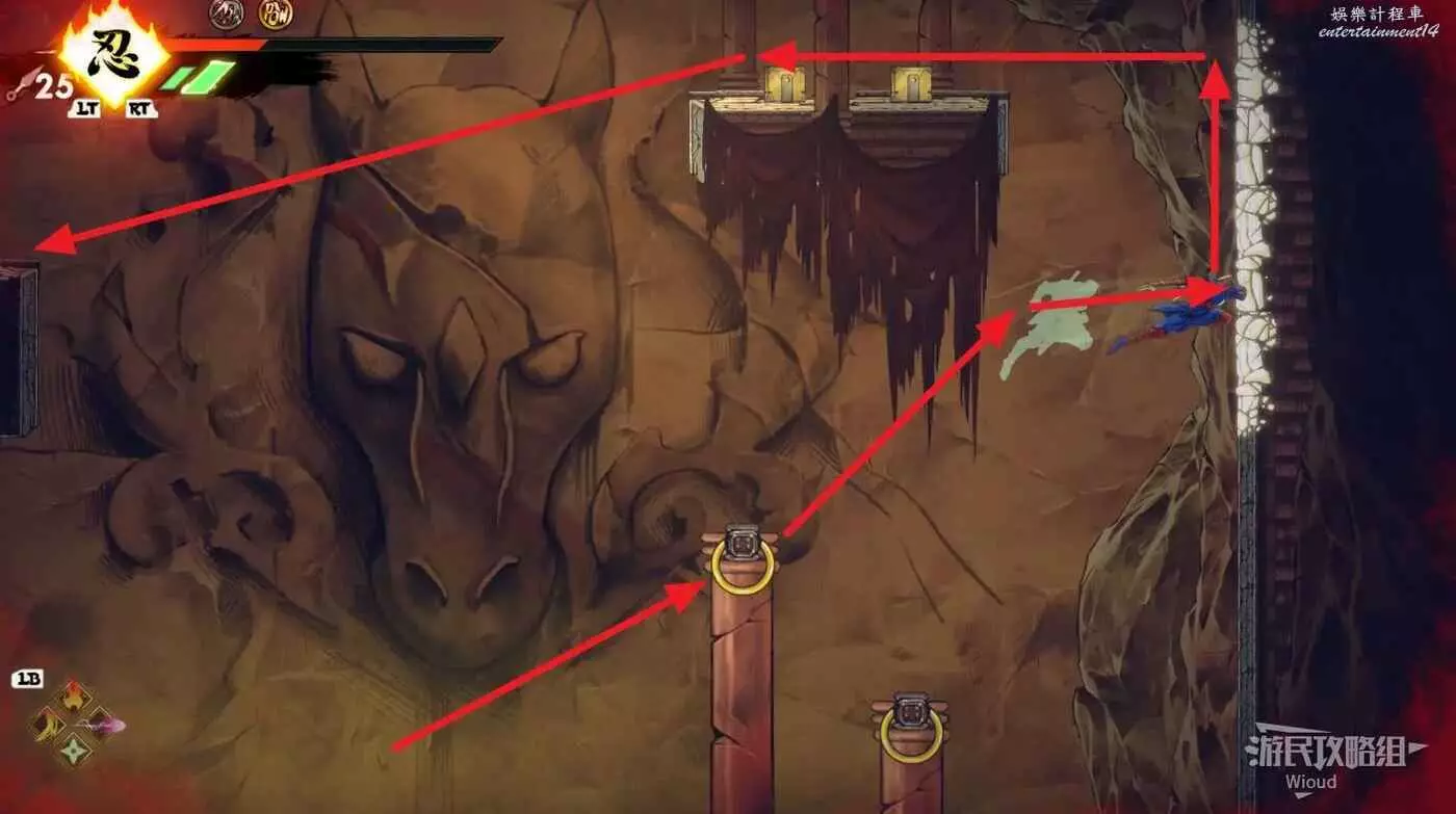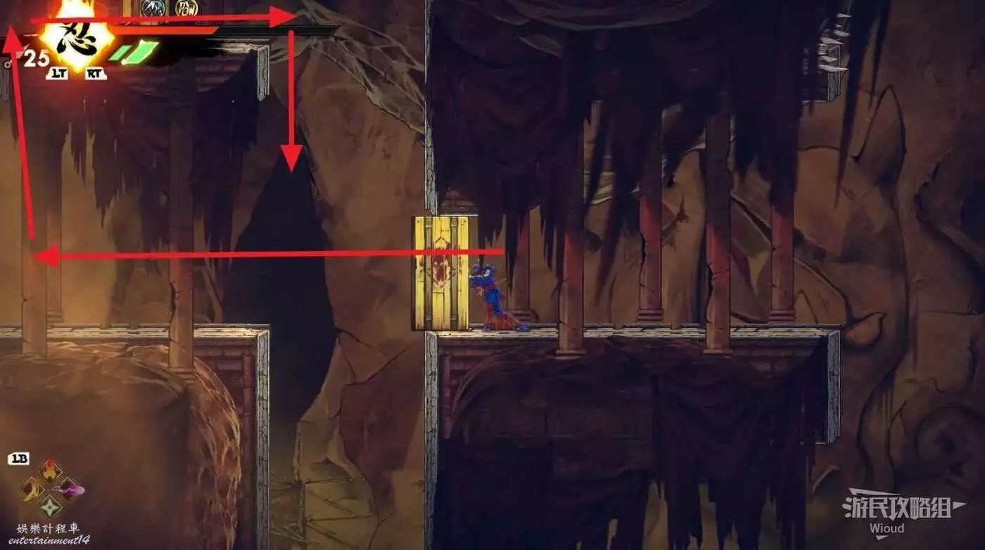 第二個開闊區域繼續前進的門依然是鎖住的,需要先沿著下圖路線所示,連續跳到左側高處啟動石碑。