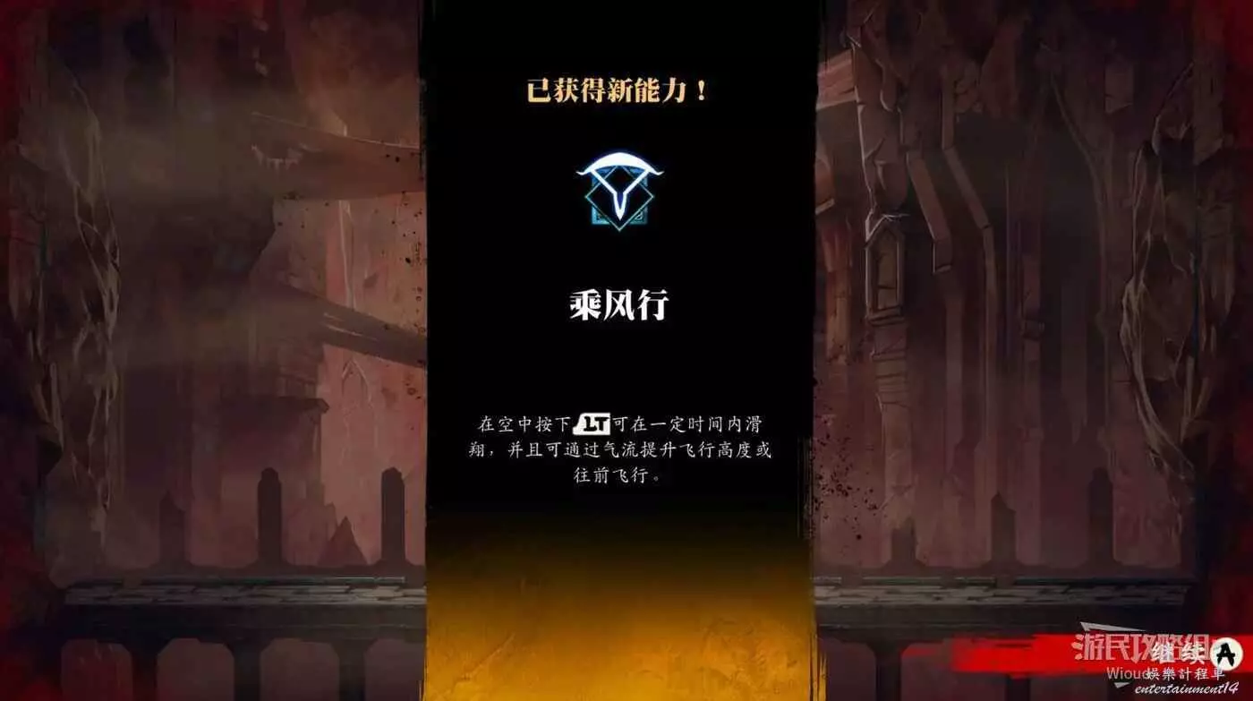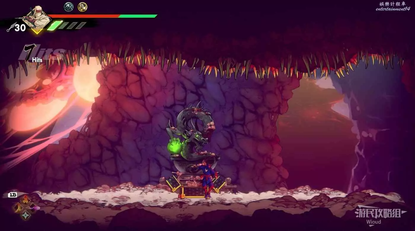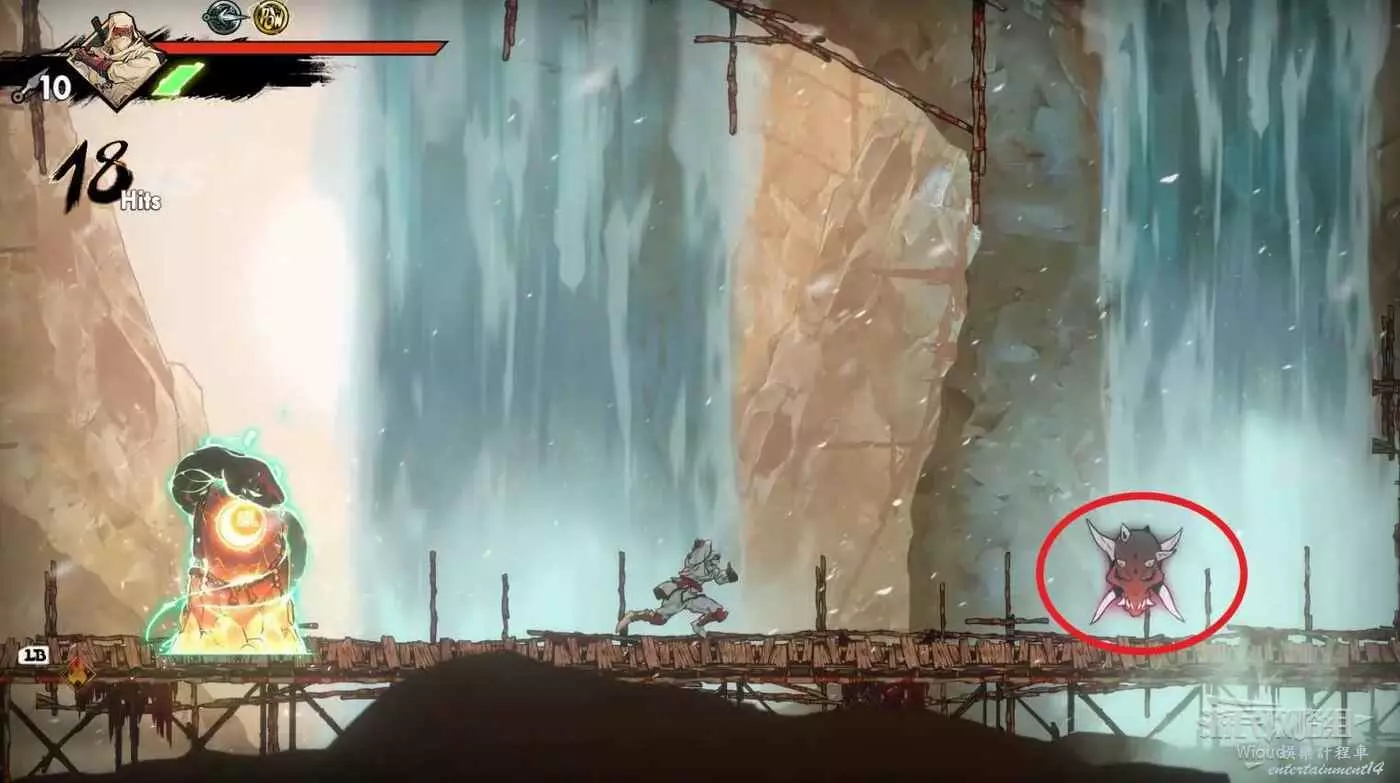 開啟寶箱周圍會再刷一波怪,全部擊敗往右走,用剛才的新能力破壞擋路的板塊,往上面平台繞一圈,開啟寶箱獲得一個【朧珠】。