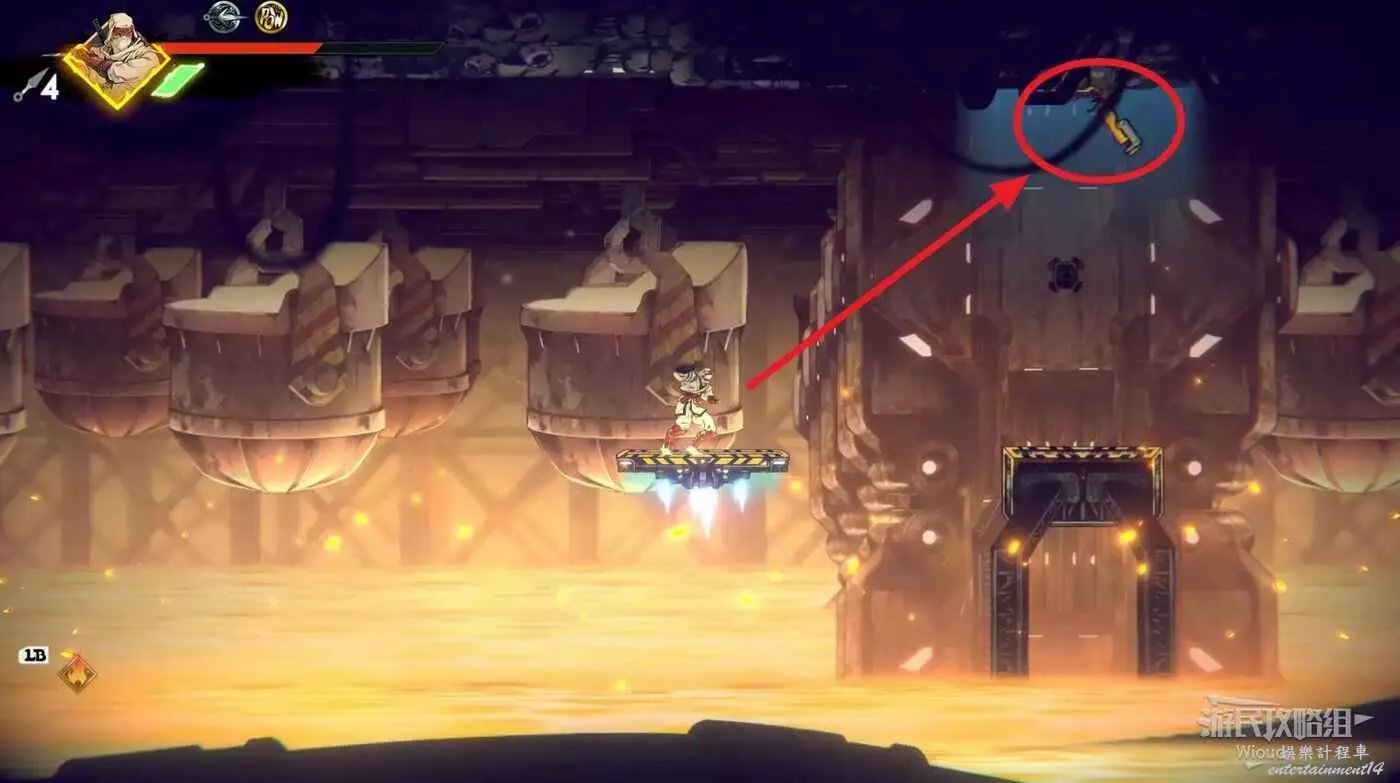 等柱子突出來折返跳到左側,利用鉤爪蕩到左側再立刻與鉤爪互動往右蕩到平臺上。