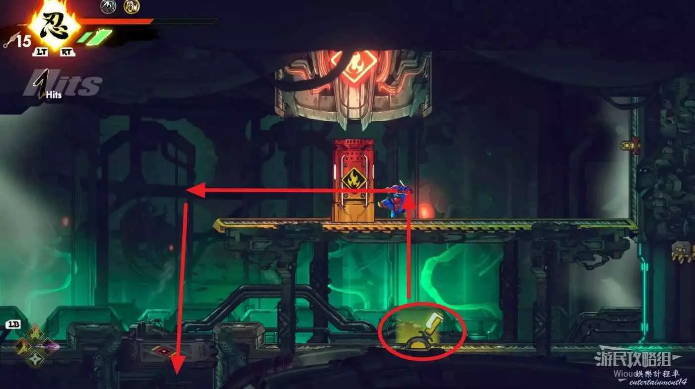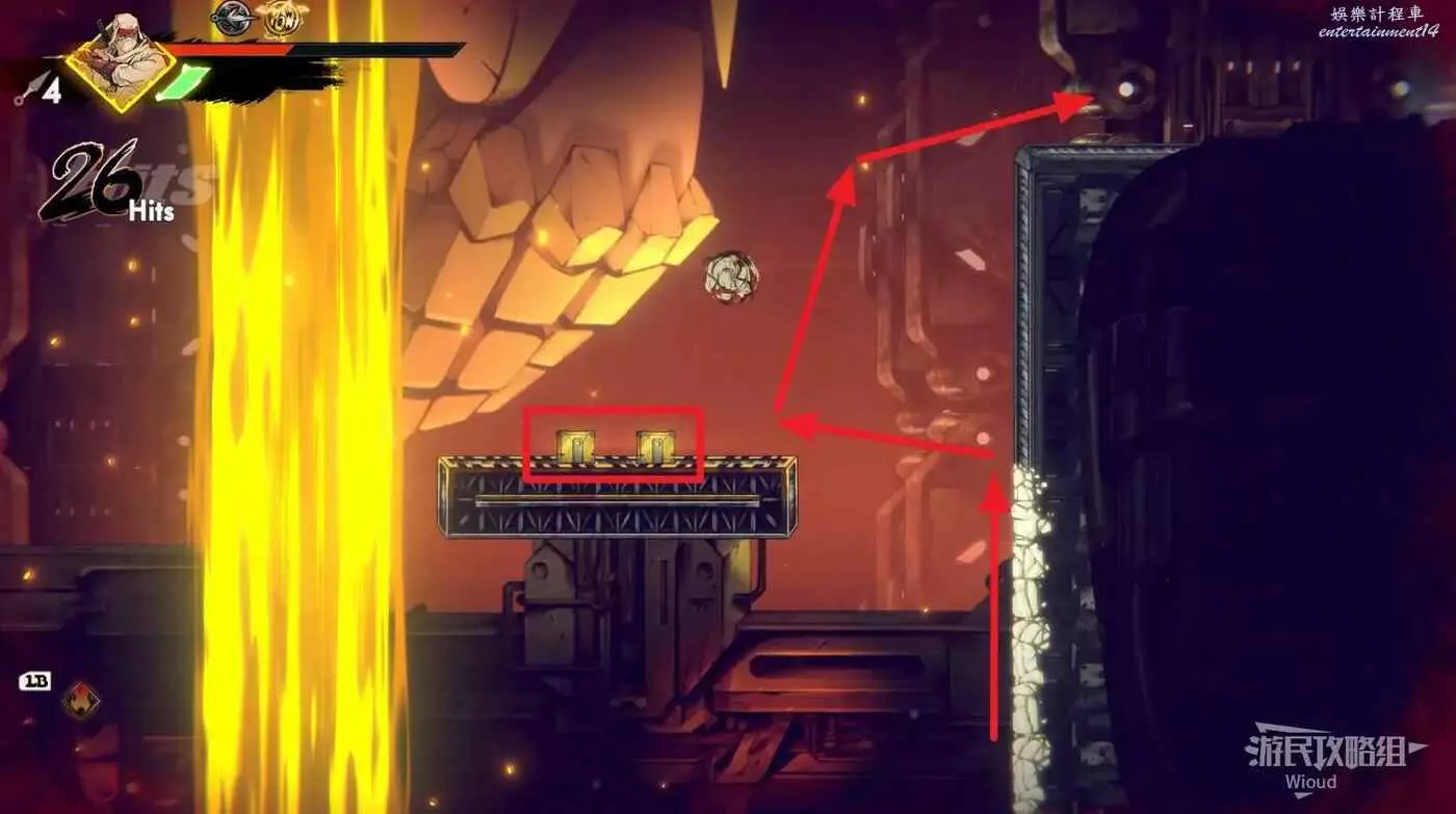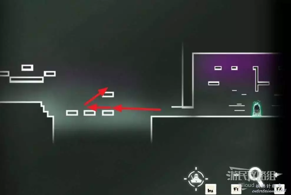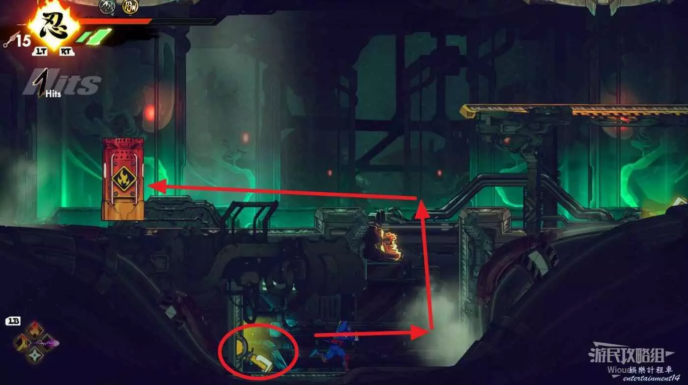 完事往右走,直到看見新的石碑,啟動後沿著下圖路線跳到左上角平台,能看見一個機關。