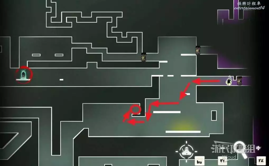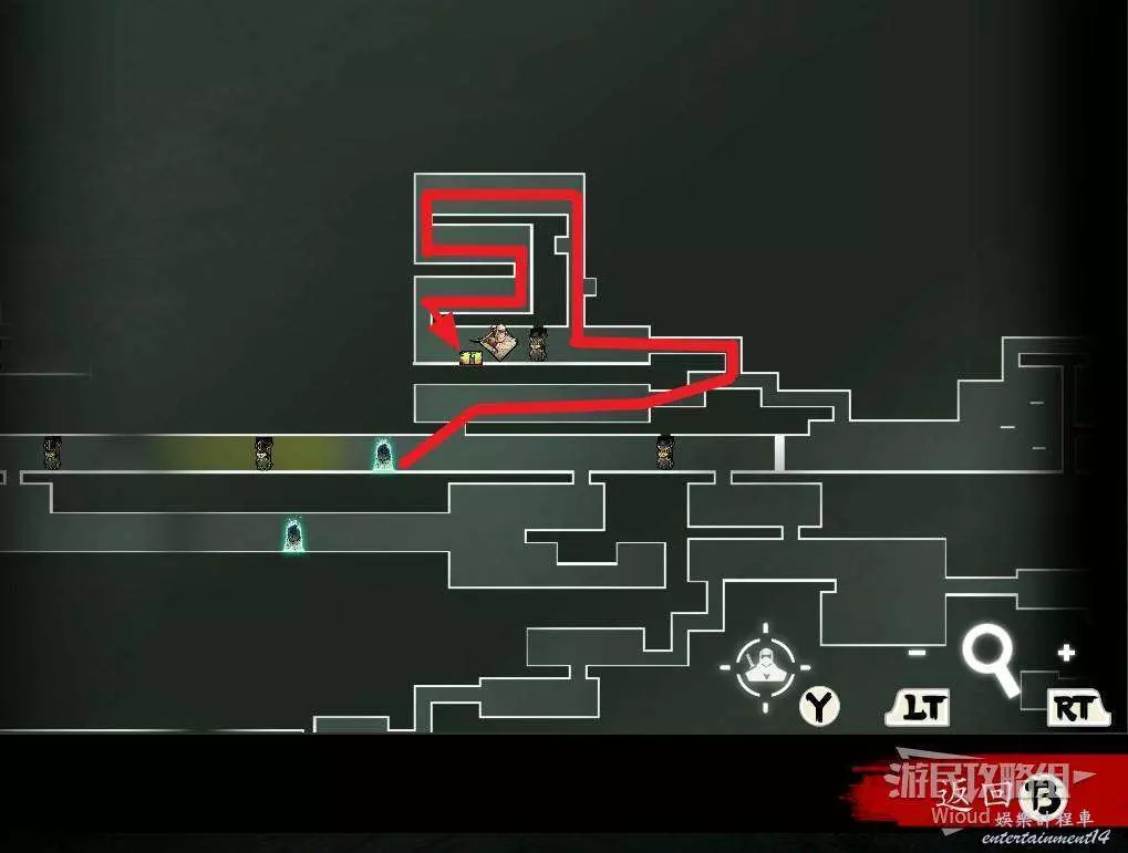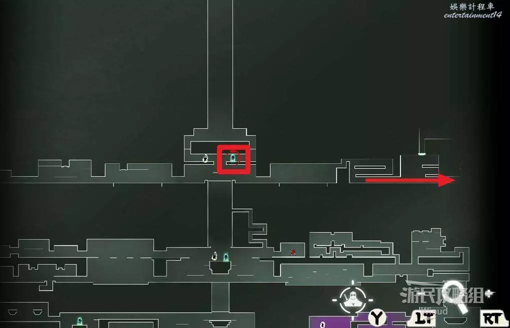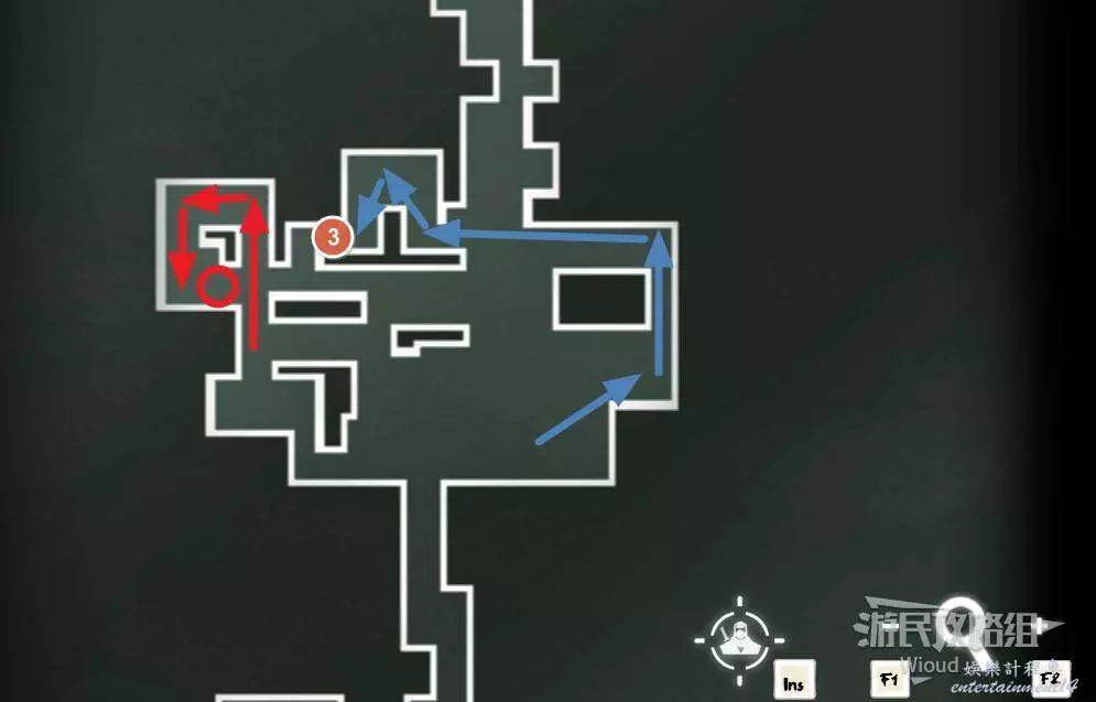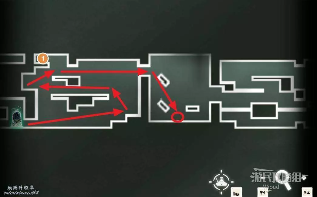 開局一直往右走即可找到第一支【精英部隊】,右邊進入紅色標識1的房屋,裡面是一個金錢寶箱。