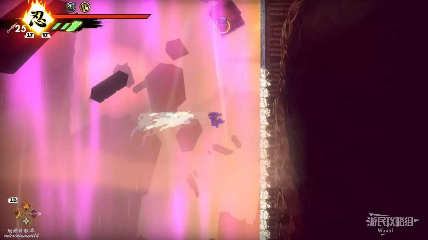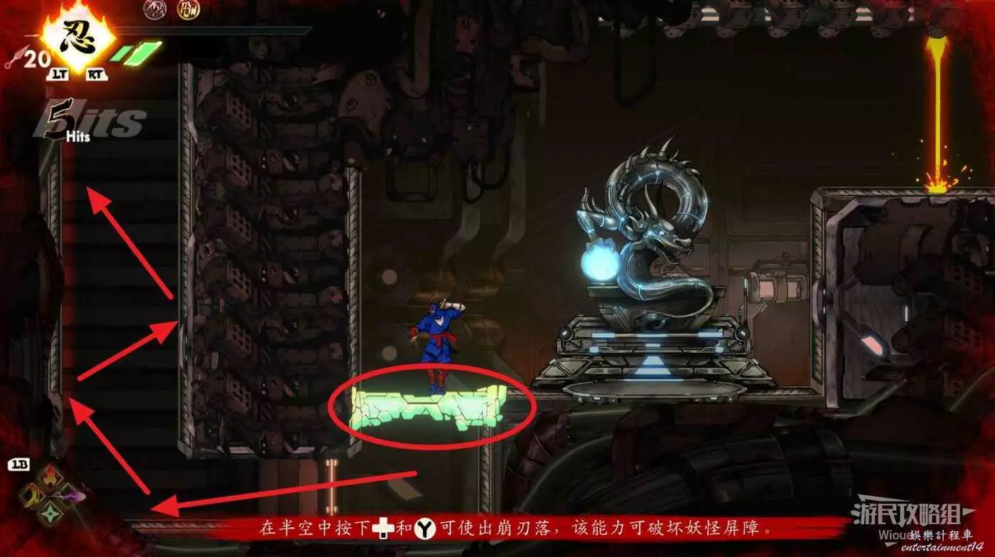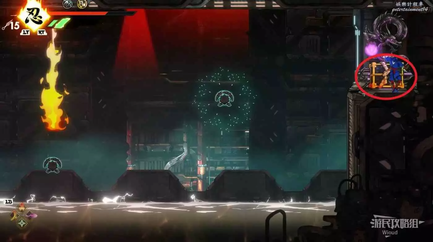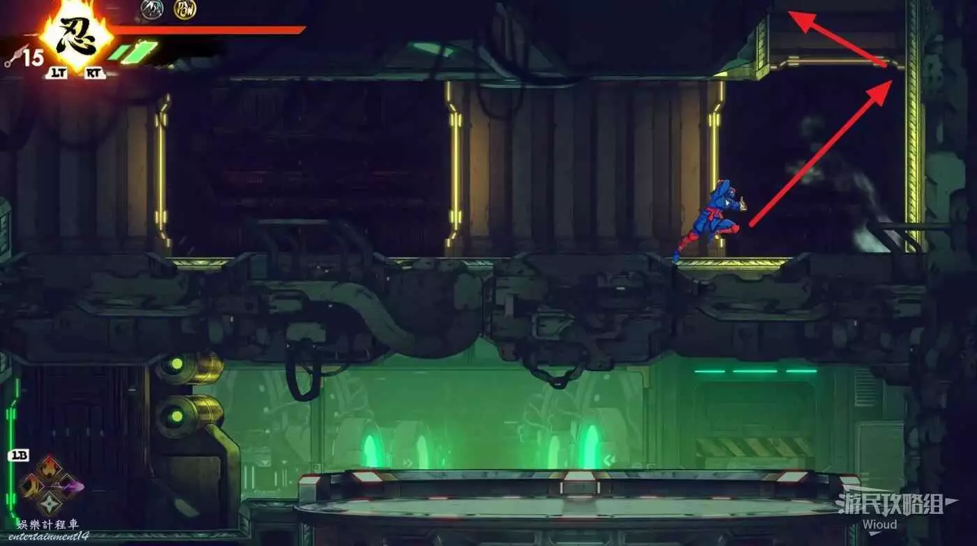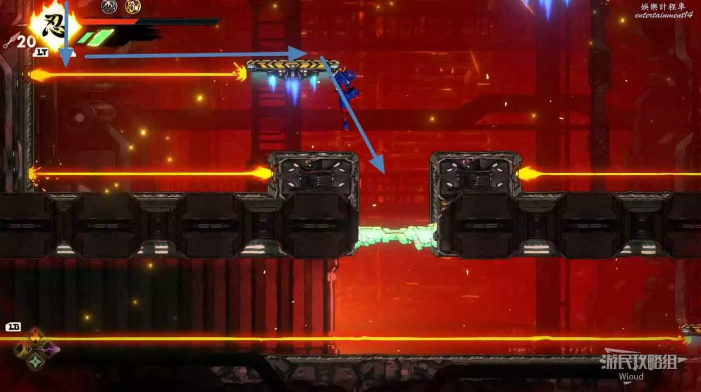 到達底部時直接往右邊的能量球跳躍+翻滾移動到右下角平台,跳到半空扔手裡劍把中間打遠端的敵人幹掉。