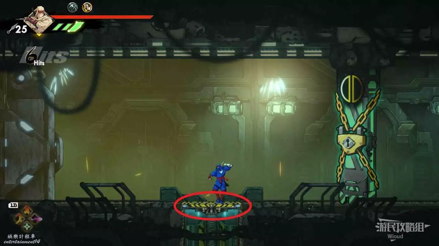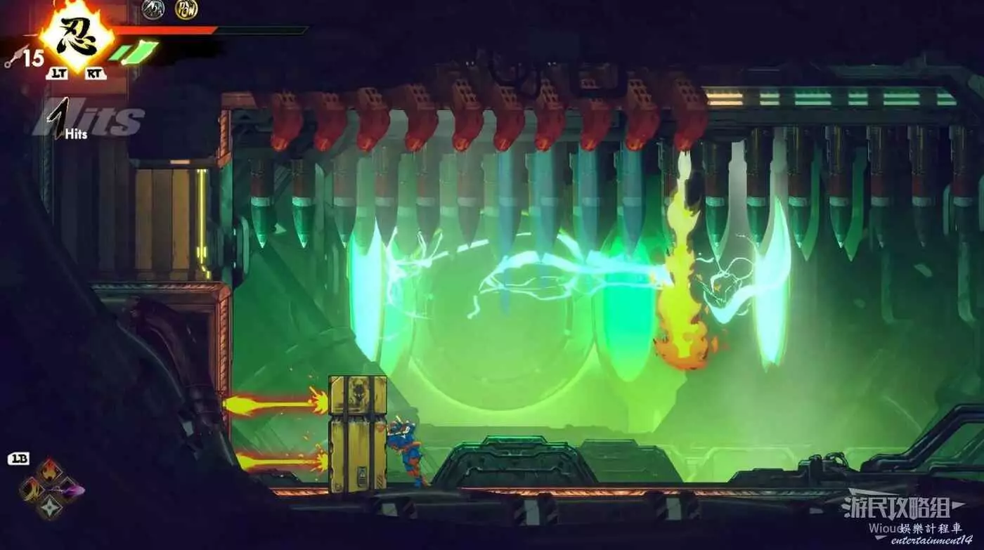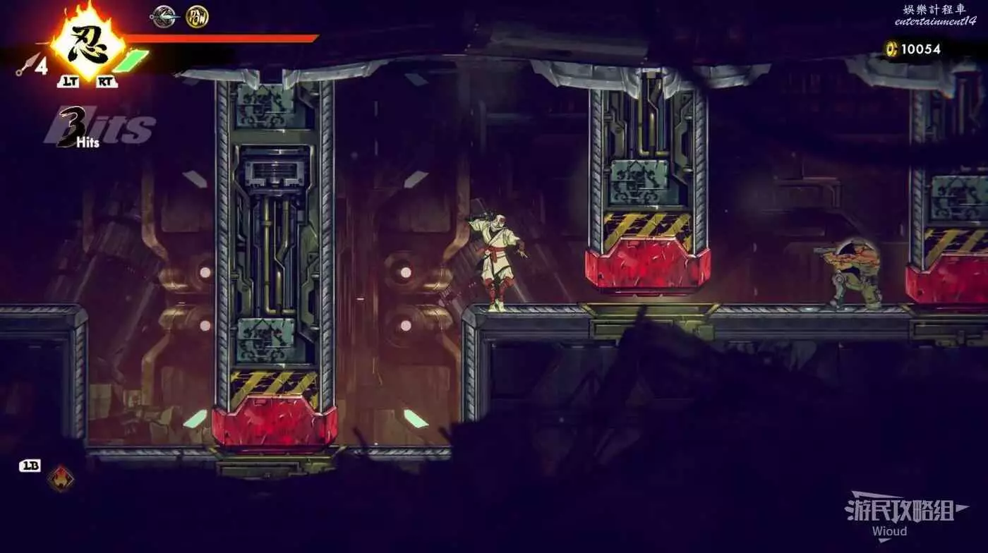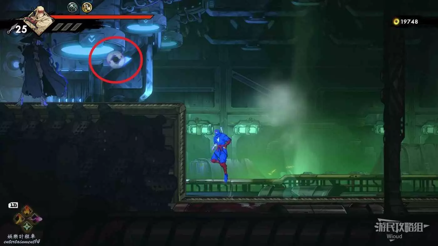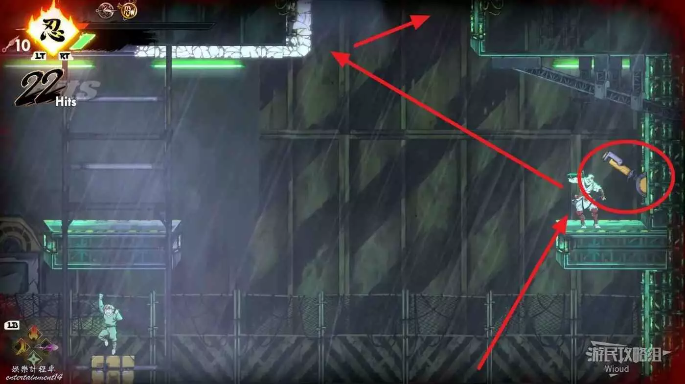 到達底部時直接往右邊的能量球跳躍+翻滾移動到右下角平台,跳到半空扔手裡劍把中間打遠端的敵人幹掉。