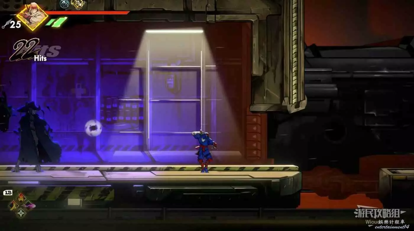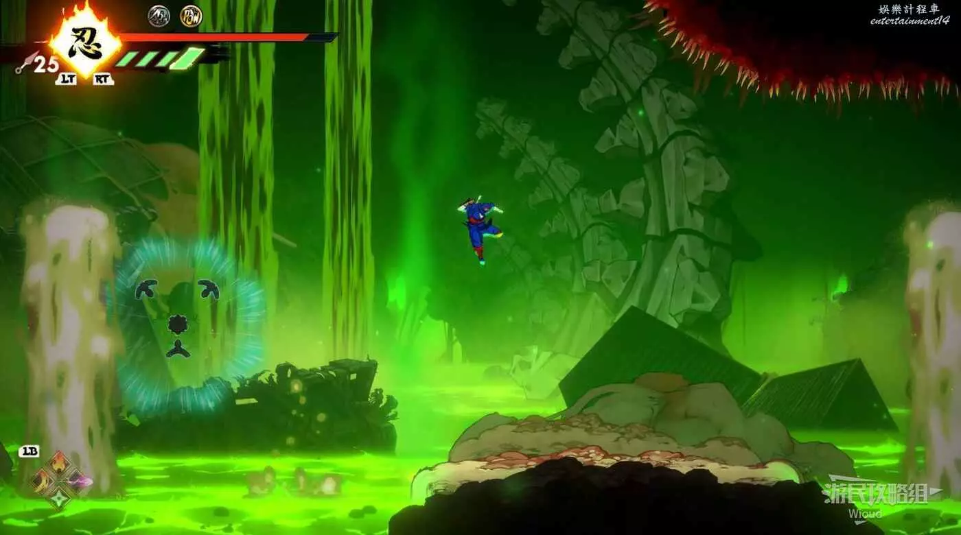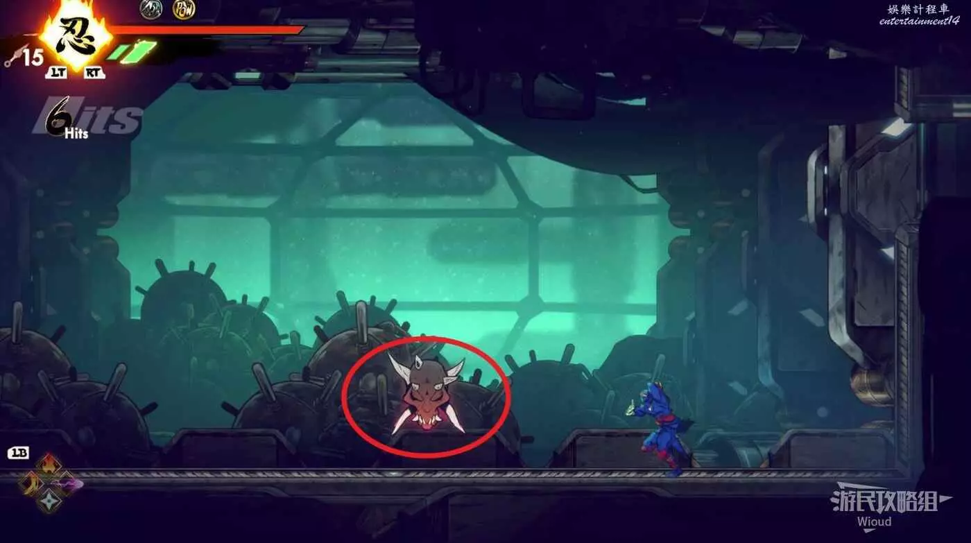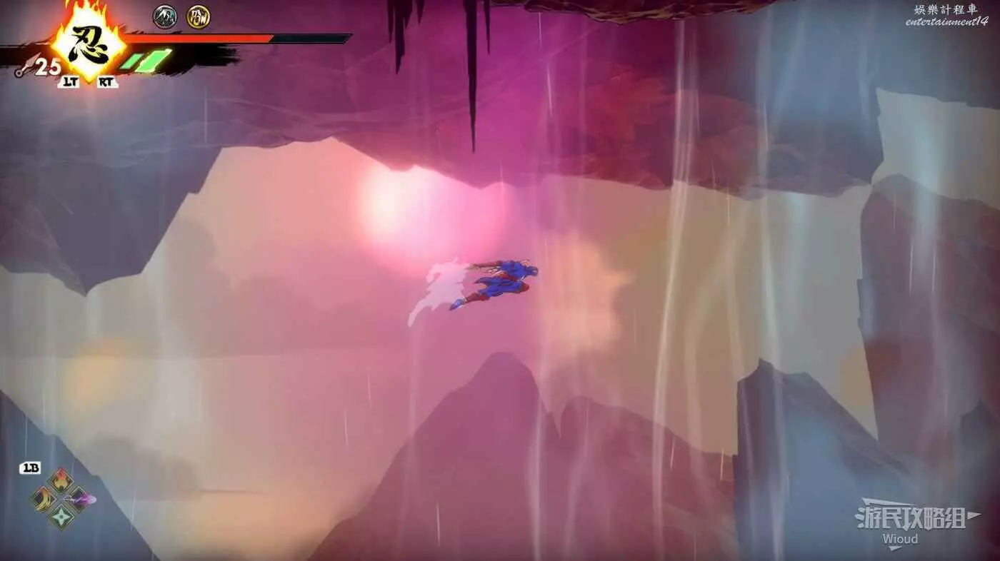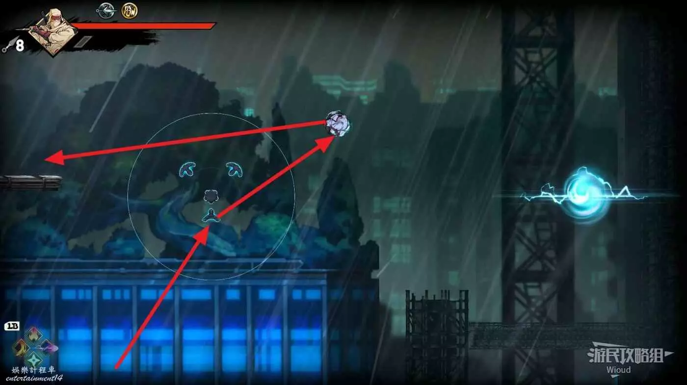 到達底部時直接往右邊的能量球跳躍+翻滾移動到右下角平台,跳到半空扔手裡劍把中間打遠端的敵人幹掉。