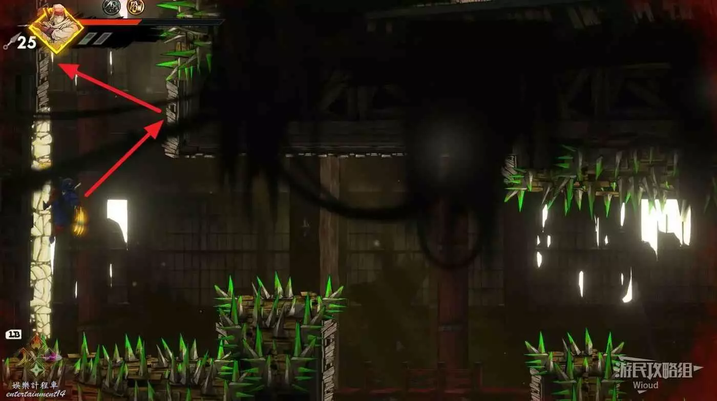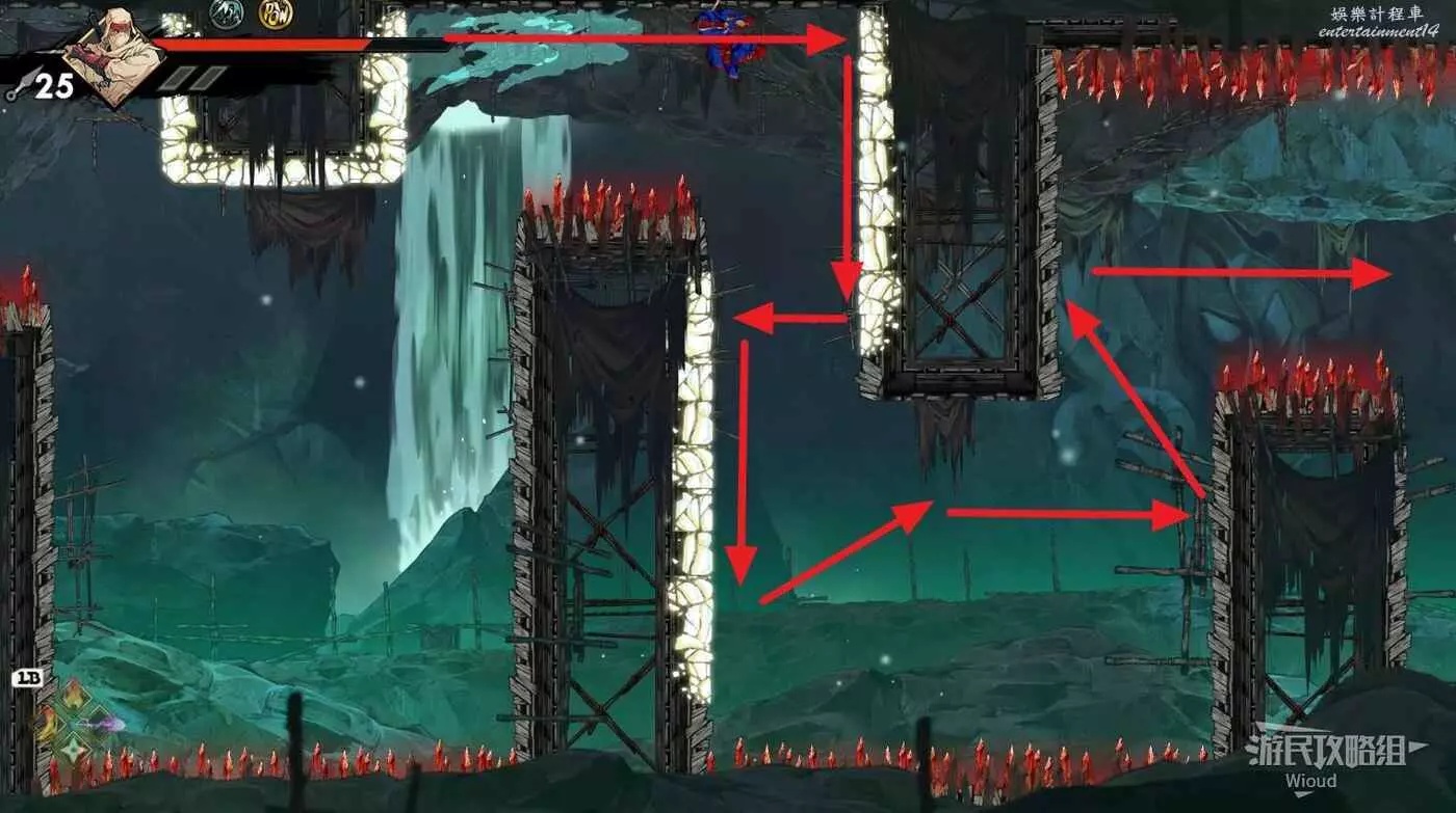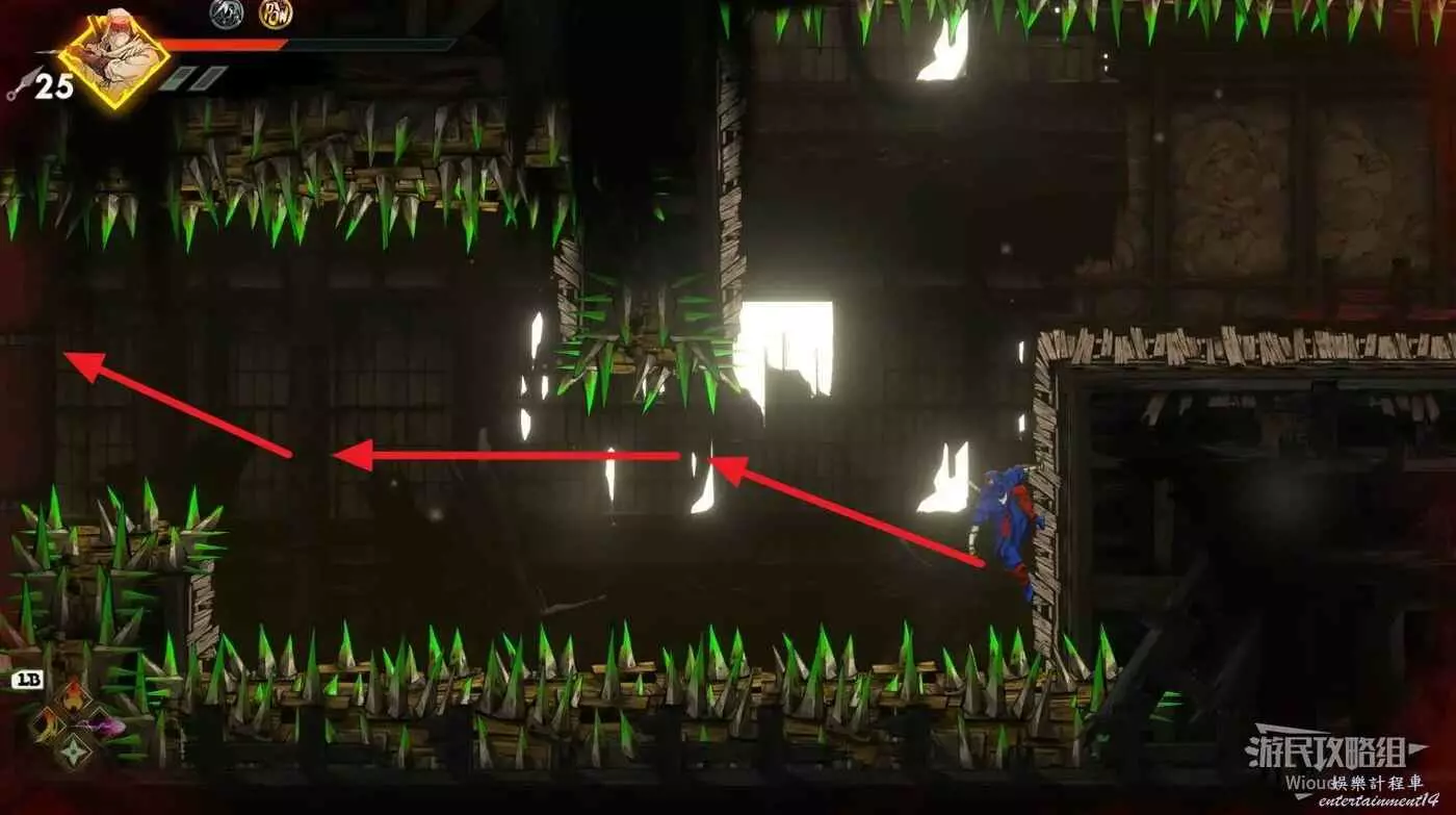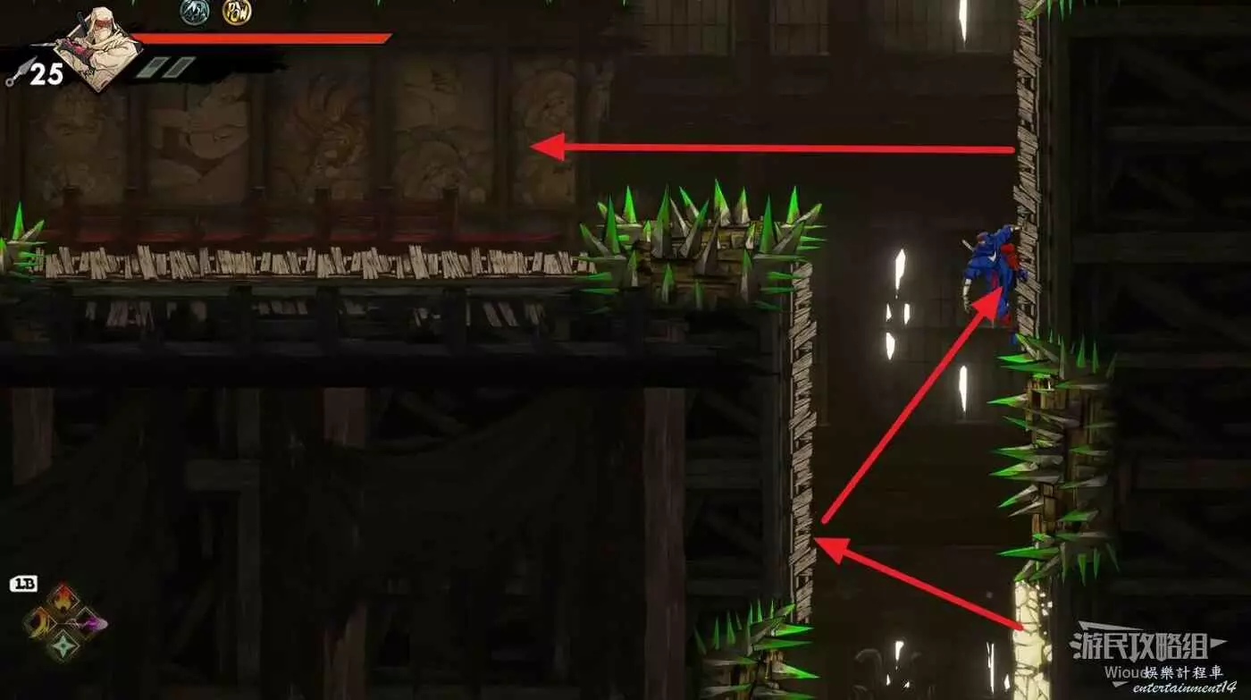 完事立刻往左上角二段跳,卡一下高度通過衝刺穿過尖刺陷阱。