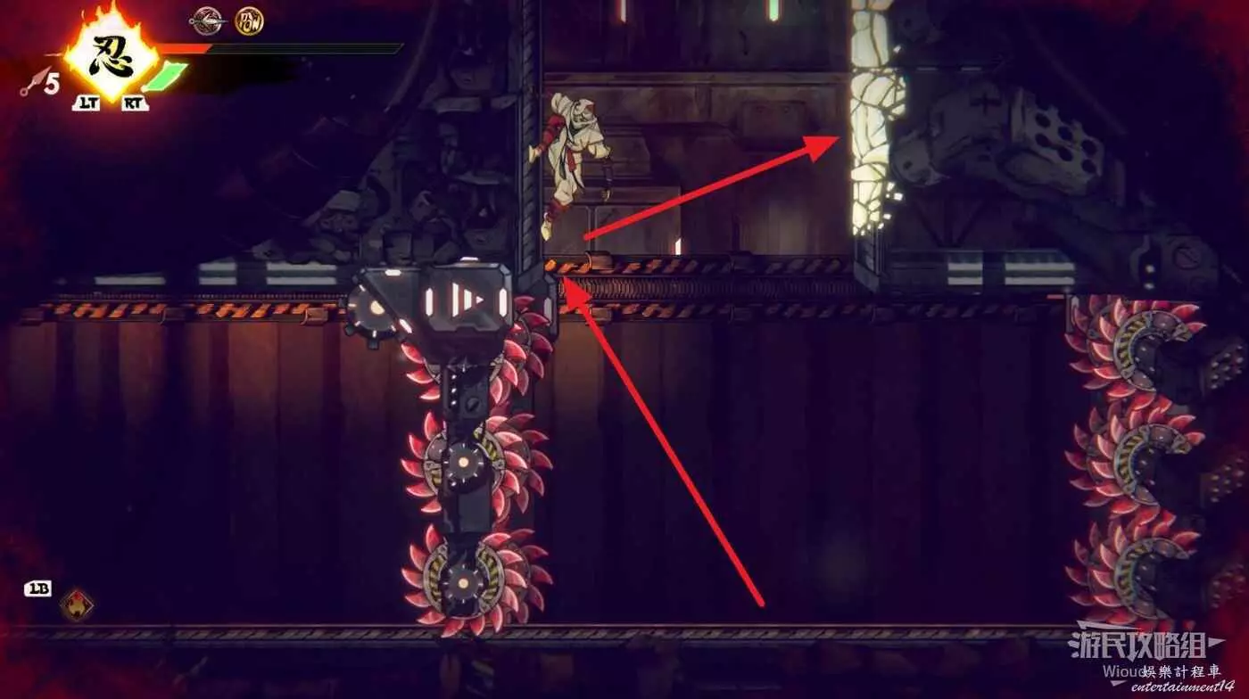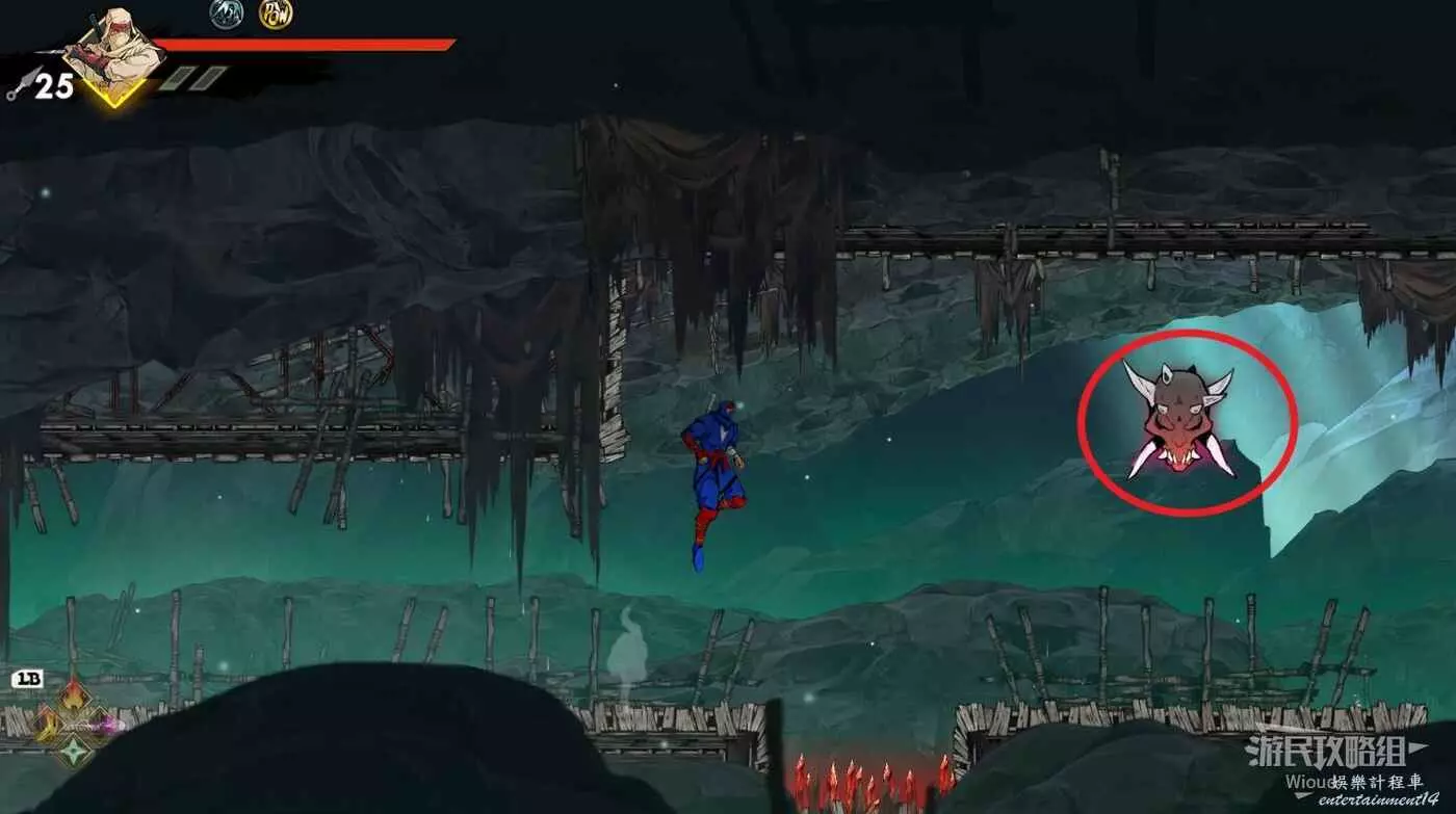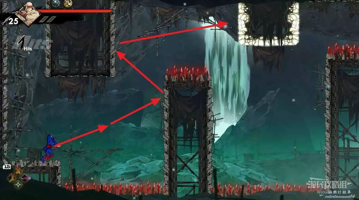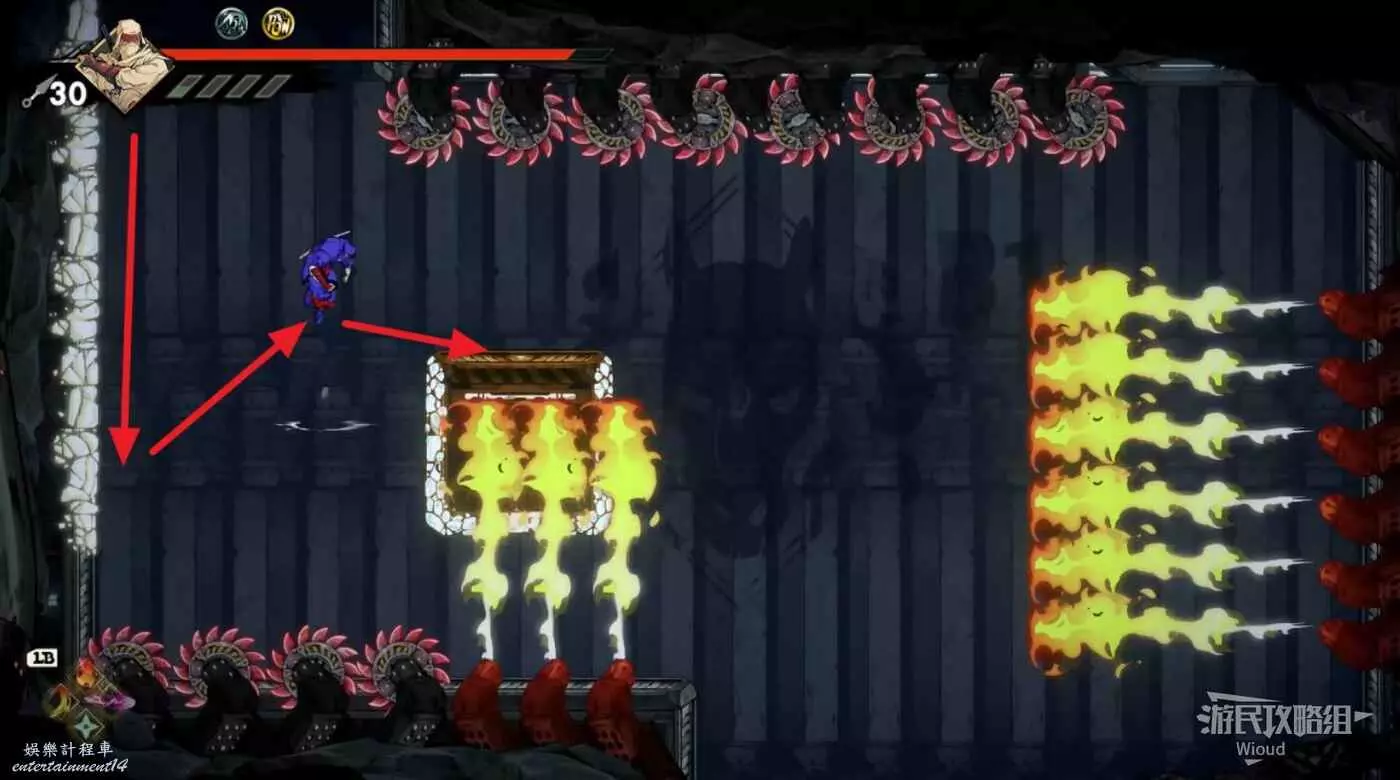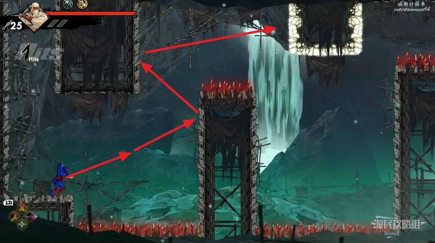完事立刻往左上角二段跳,卡一下高度通過衝刺穿過尖刺陷阱。