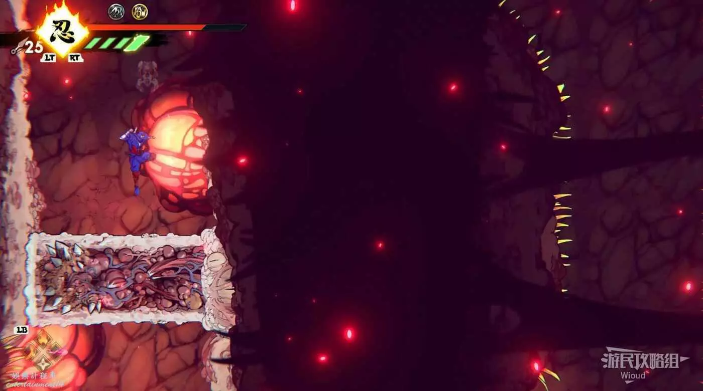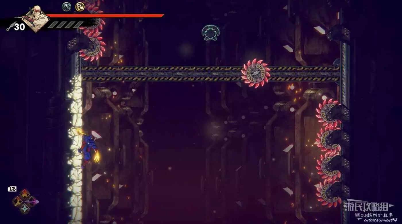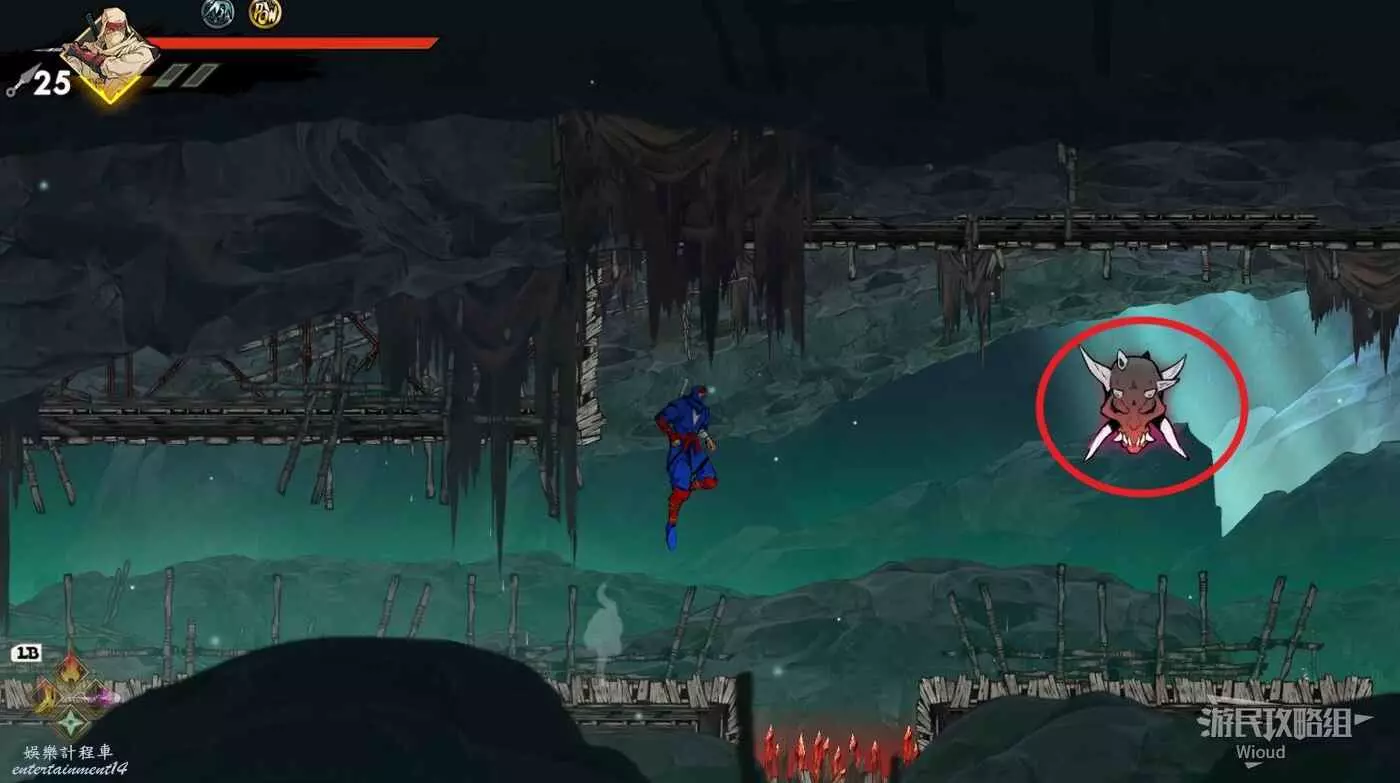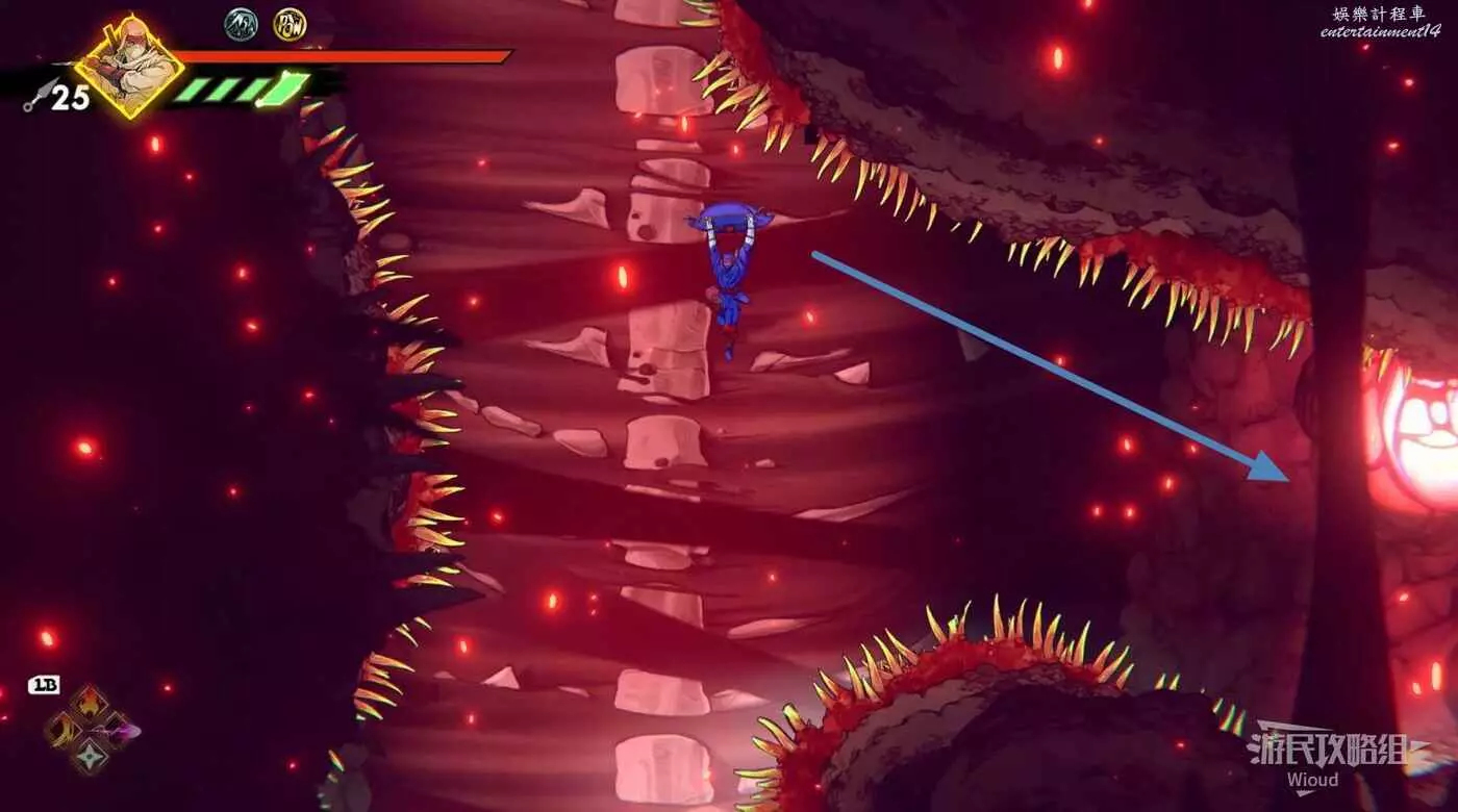 完事立刻往左上角二段跳,卡一下高度通過衝刺穿過尖刺陷阱。