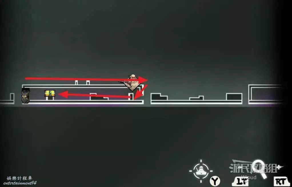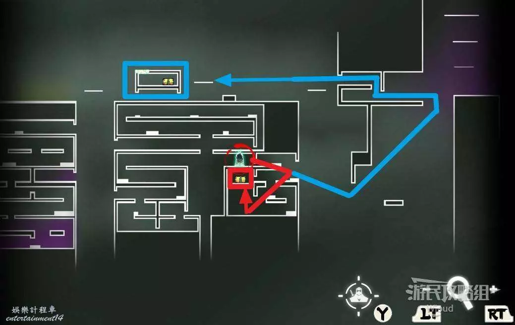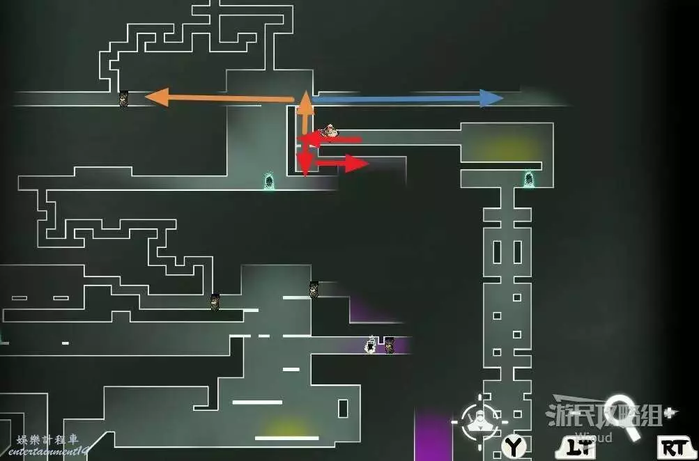 先走到頭往上跳,沿著下圖紅色箭頭拿到第一個寶箱,然後沿著黃色箭頭往右下角移動,右側盡頭開啟第二個寶箱然後左上方繞並開啟啟動第一個機關。