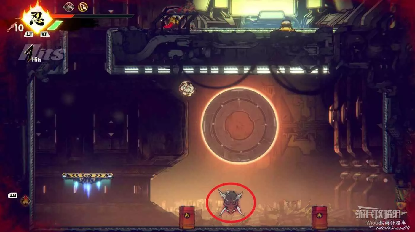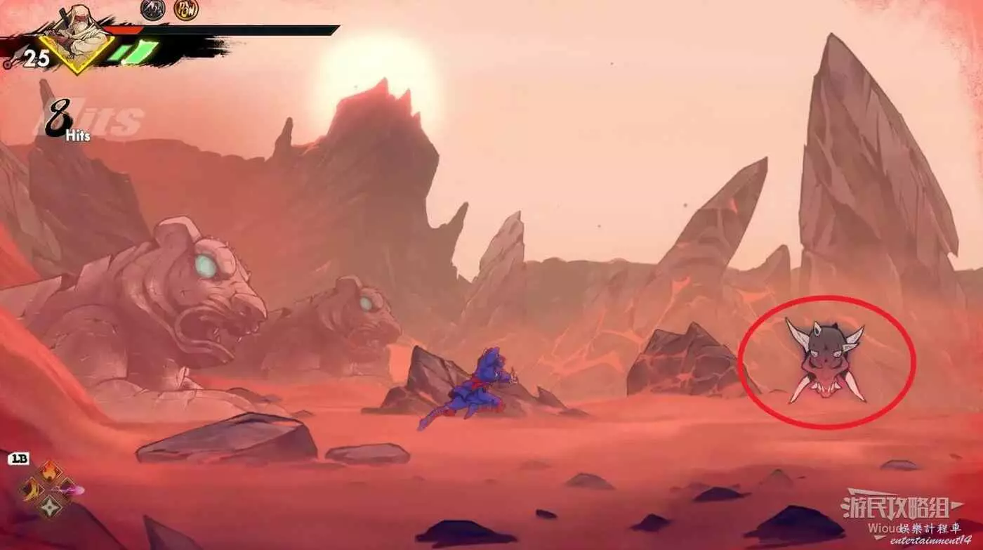 石碑位置沿著下圖路線往正下方平台移動,會發現第一個【精英部隊】,攻擊鬼頭圖示會刷幾波怪。
