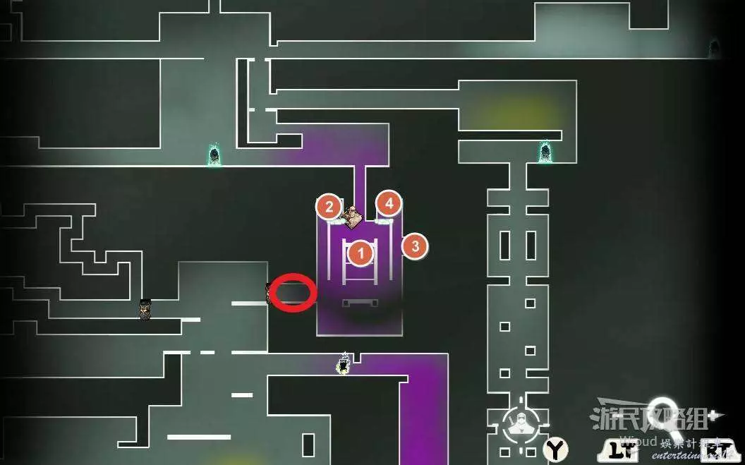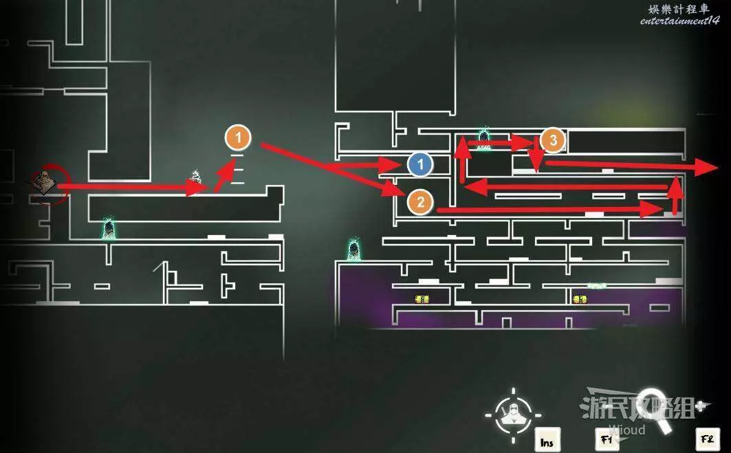 進入一個路段比較複雜的區域,入口貼著右牆往上走,紅色標識3的位置可開啟一個金錢寶箱,區域左下角有個補給寶箱,完事從左邊繞出去可找到一個開關,將其啟動後周圍會刷出幾波怪。