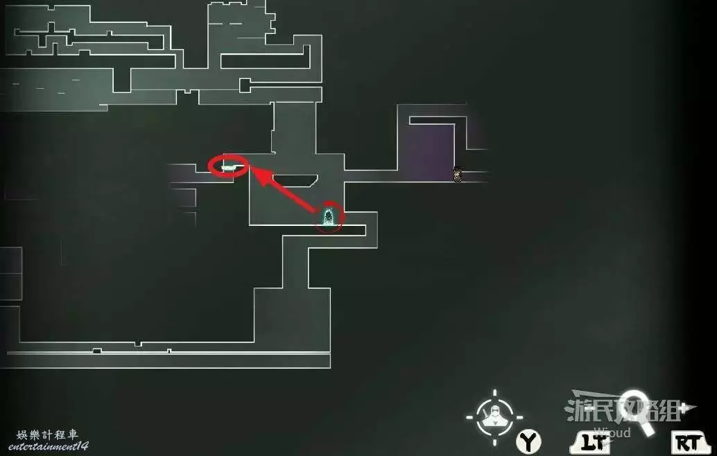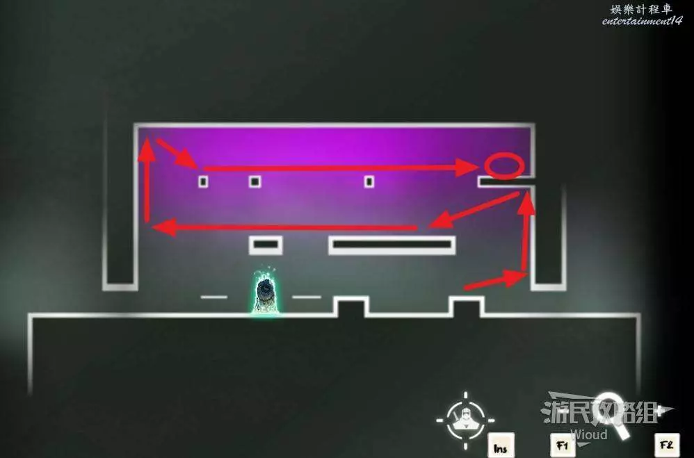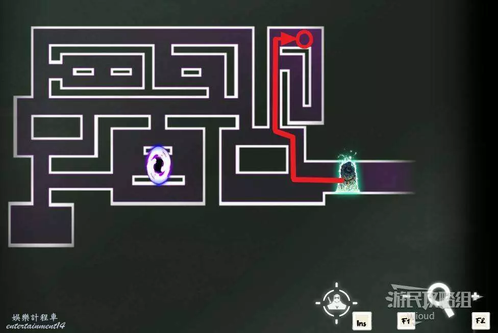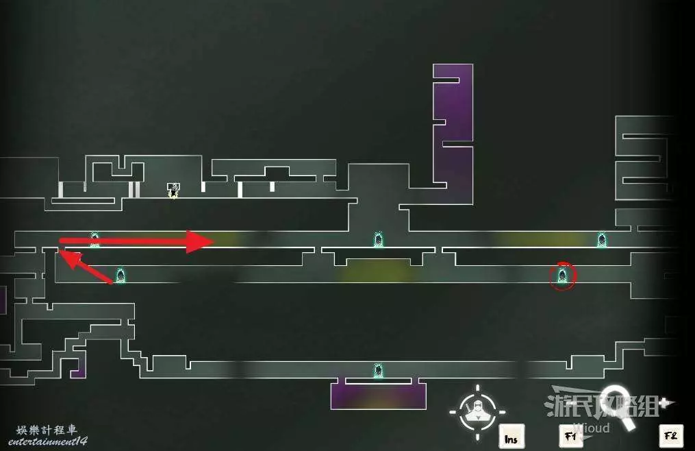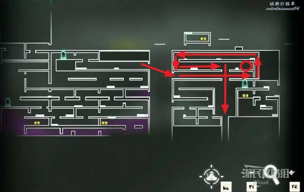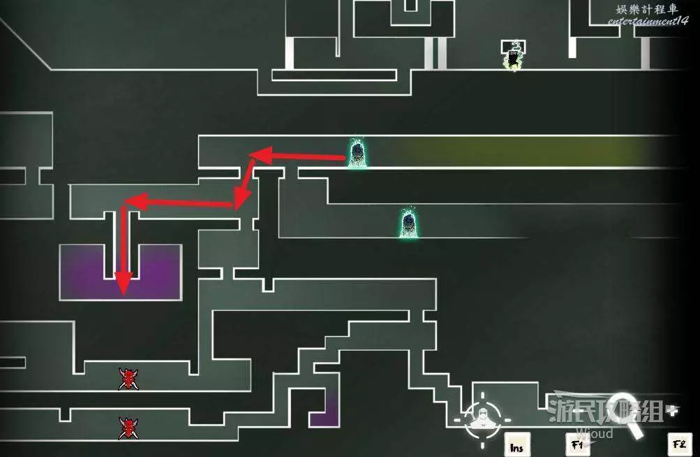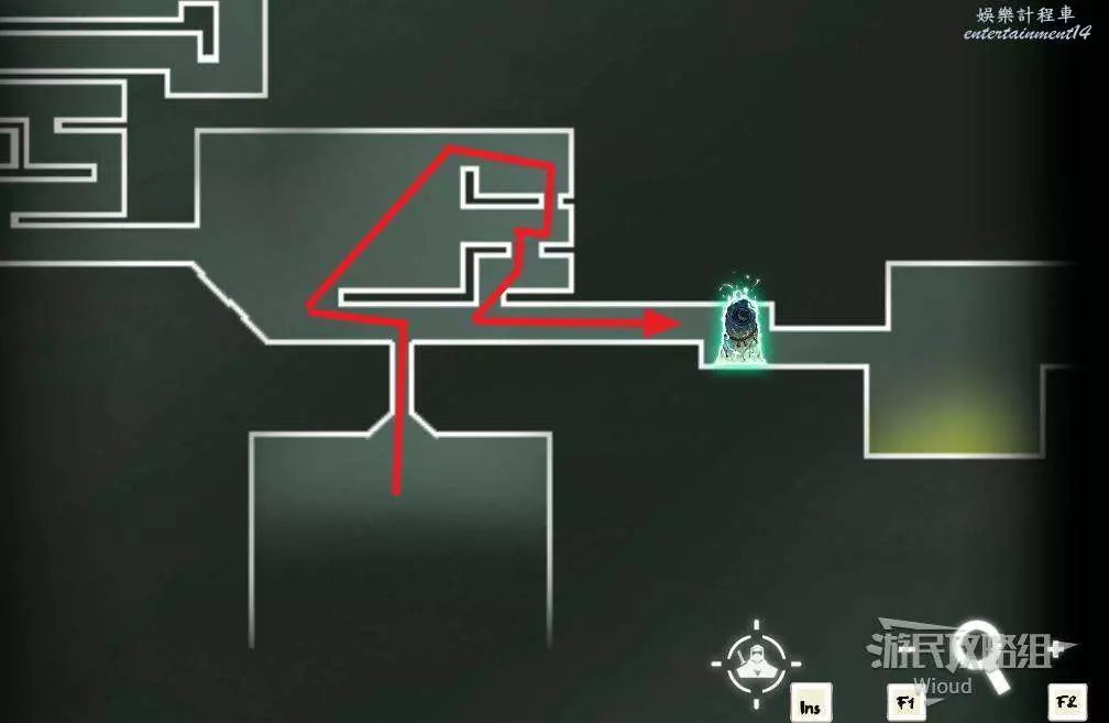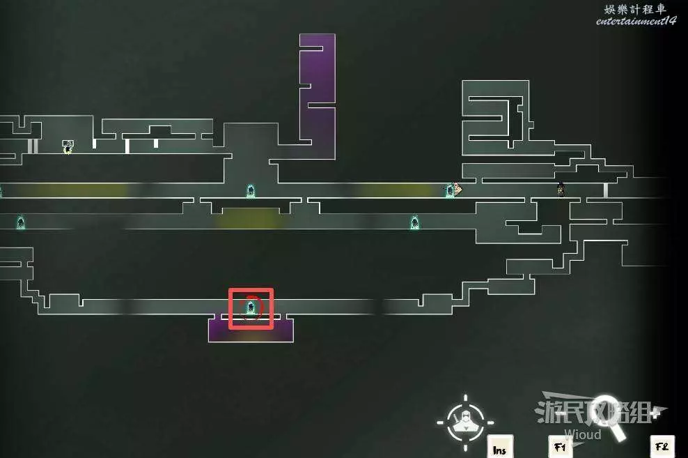 回到中間位置,沿著綠色路線往左走,繞到中間會經過一個陷阱區域,盡頭可開啟一個寶箱,獲得【實驗室鑰匙】。