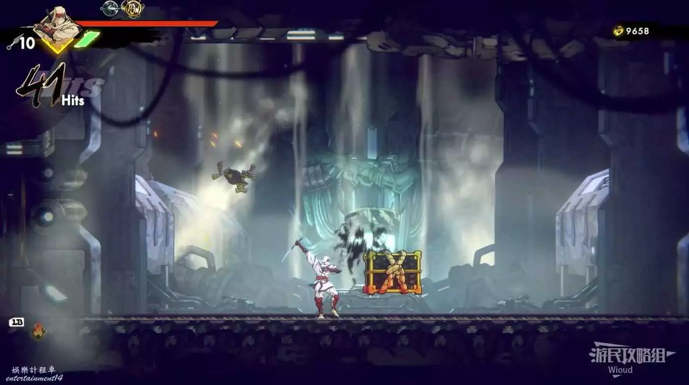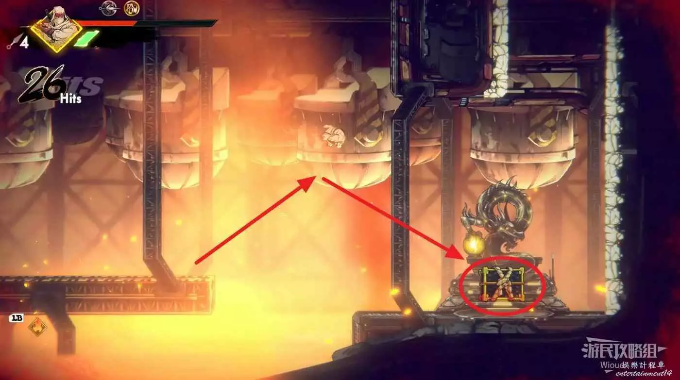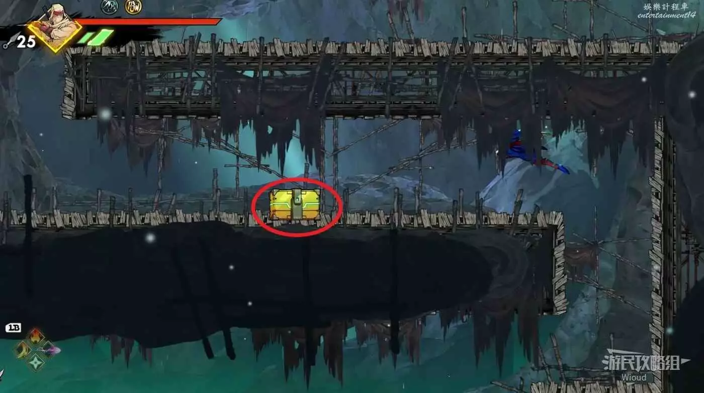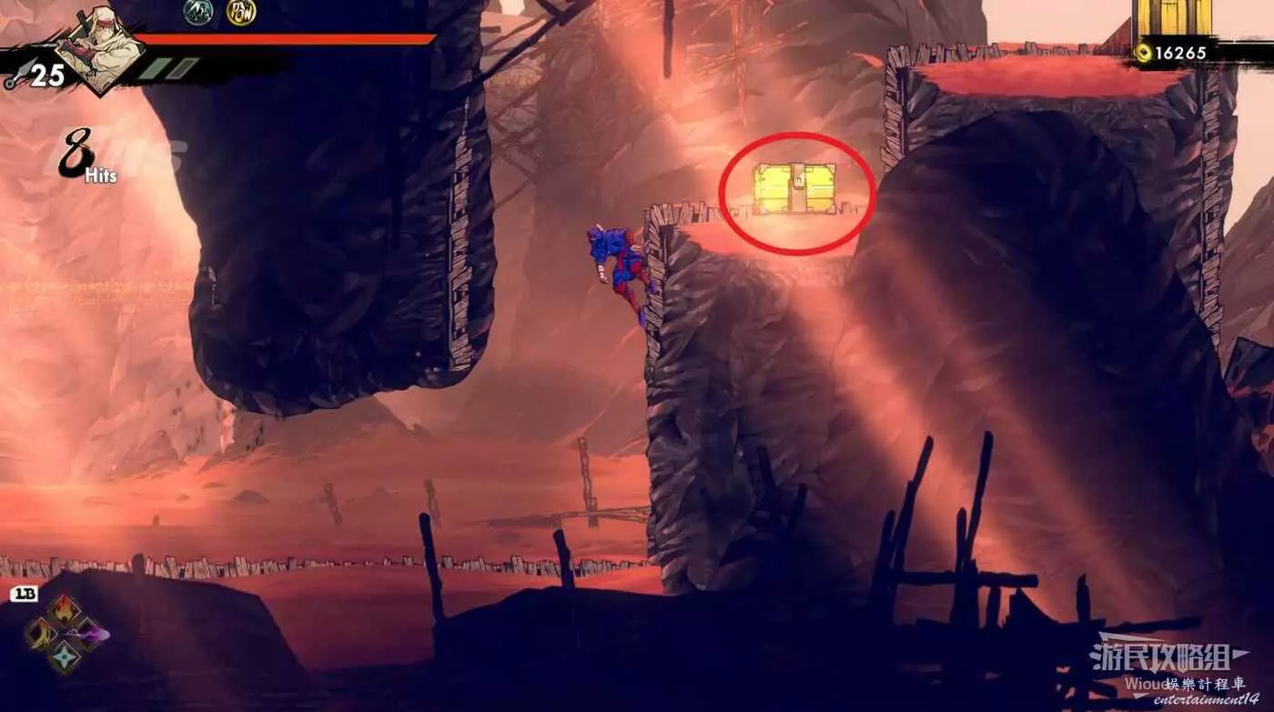 繼續往上,看見一個被鎖住的石碑時往左走,邊緣看見一個被桶擋住的箱子,先從邊緣自由落體,等低於中間障礙物時翻滾+跳躍到左側平台,然後繞一圈到寶箱位置。